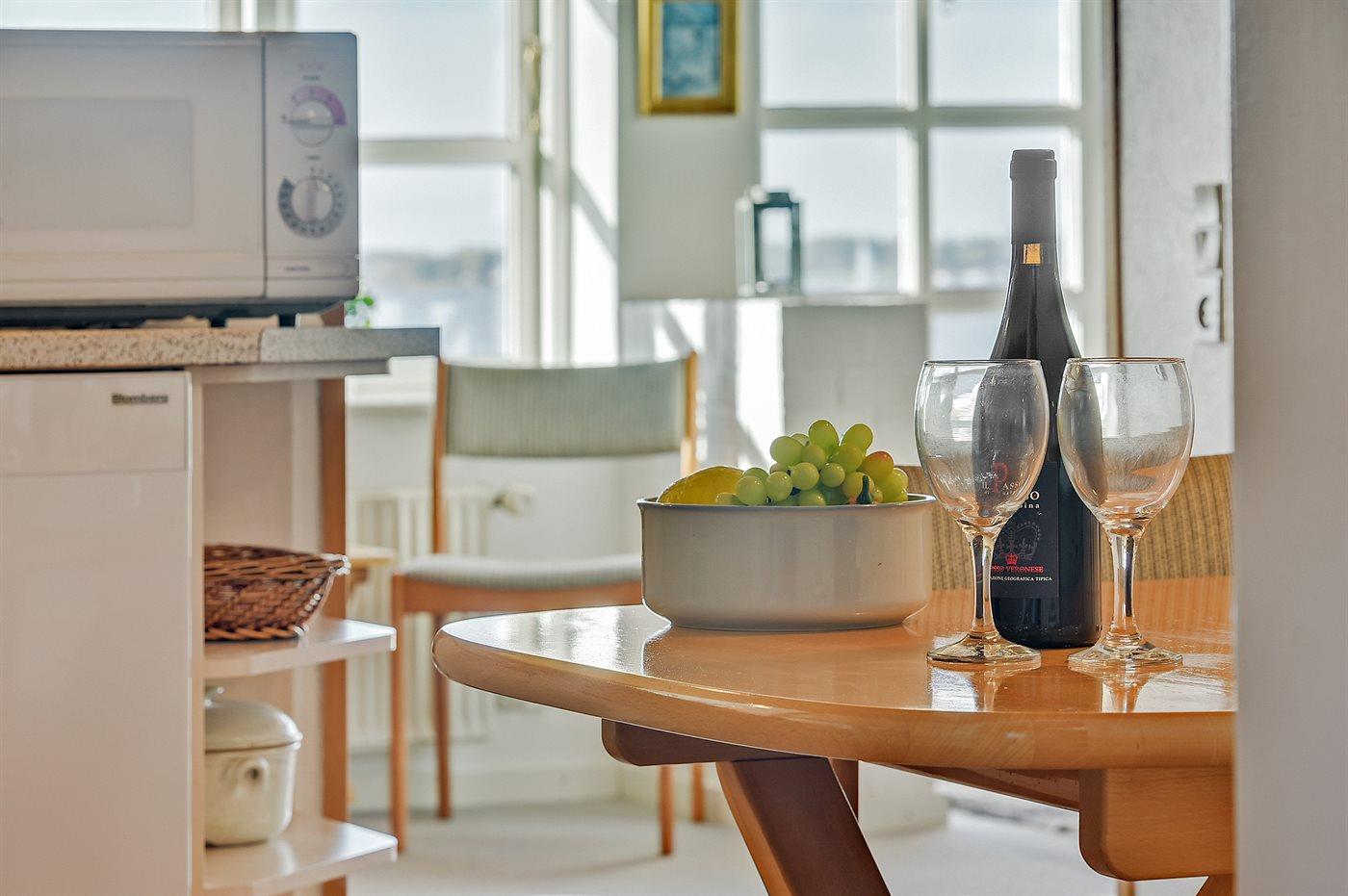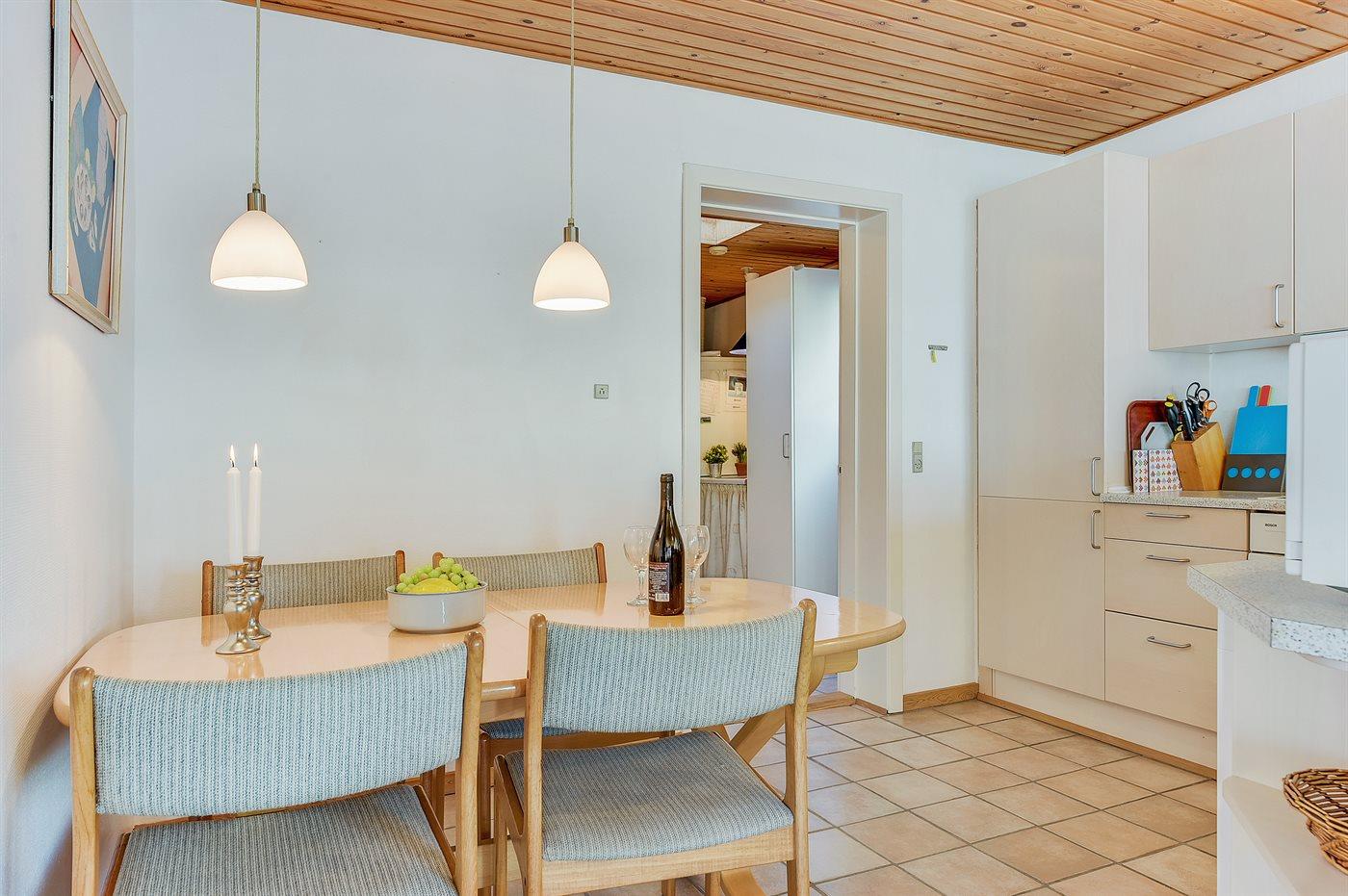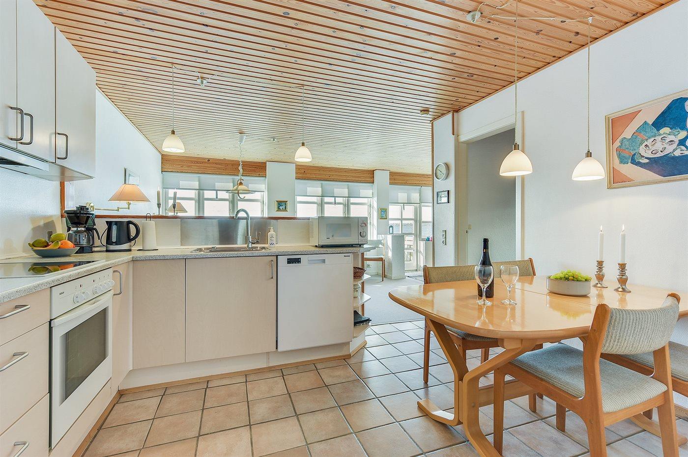 Køkkenet er udstyret med 1 køleskab. Der er 4 keramiske kogeplader, bageovn, mikrobølgeovn samt opvaskemaskine.
