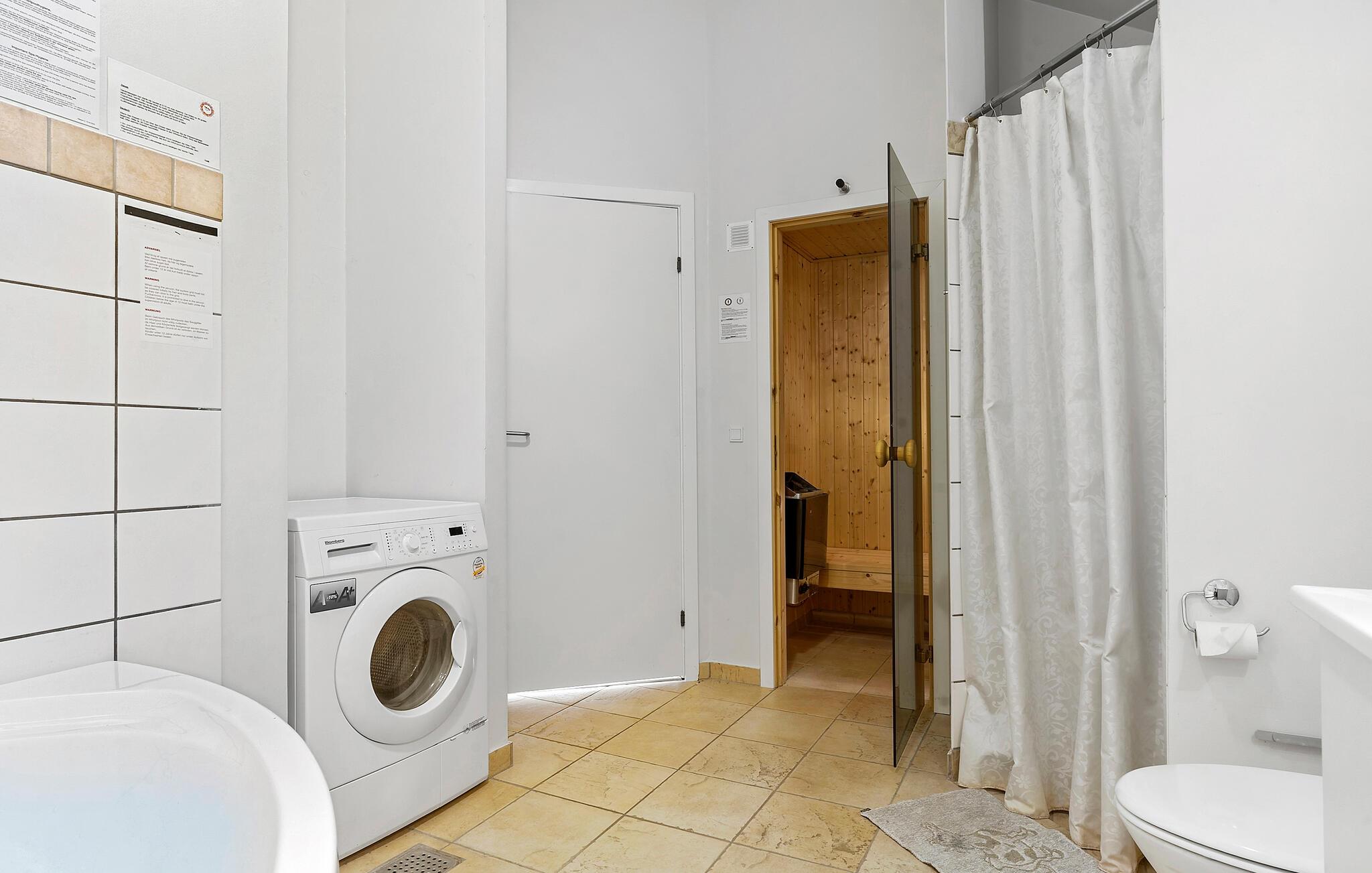 Træd ind i den hyggelige stue med lyse vægge, højt til loftet og store panoramavinduer. Find jer godt til rette i de behagelige sofaer foran brændeovnen. Kig gennem bogreolerne eller nyd tiden sammen ved det store spisebord med udsigt. Det smukke køkken tilbyder masser af plads til madlavning og tilberedning af lækre feriemåltider. Brug den indendørs sauna og spabad til at forynge krop og sjæl.