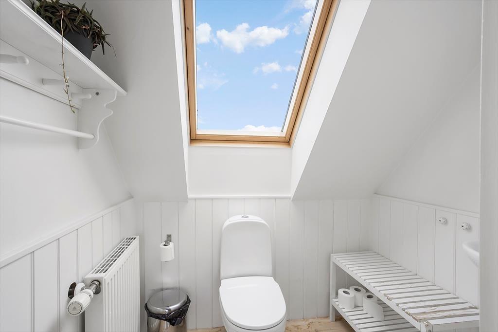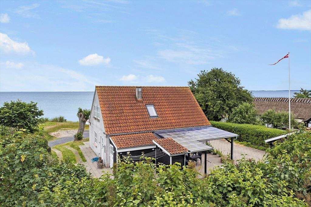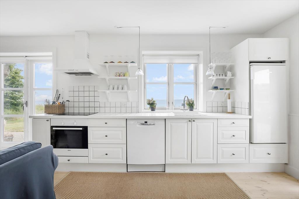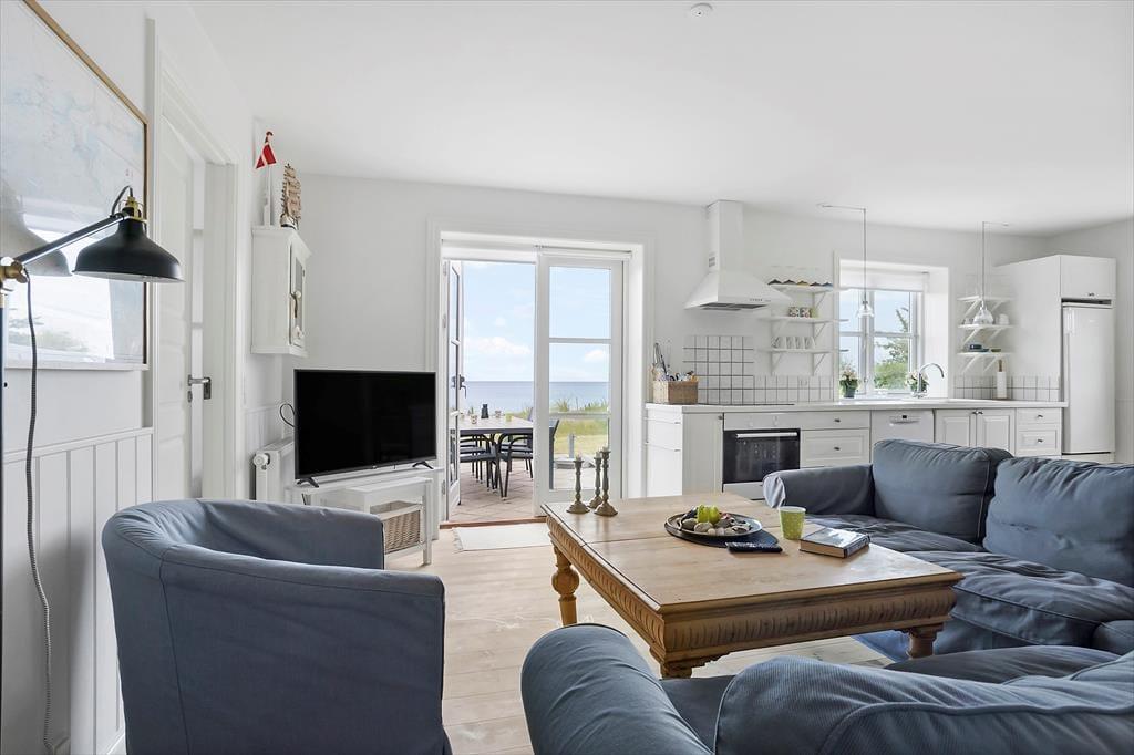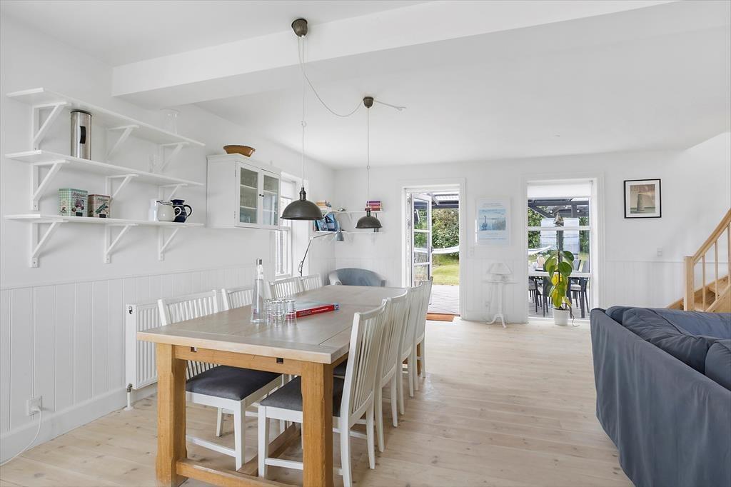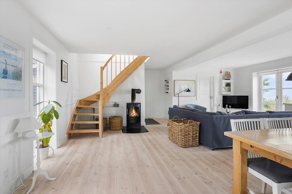 Når du træder indenfor i sommerhuset, mødes du straks af et dejligt, lyst køkken-alrum, som indbyder til hyggelige timer med familien. Brændeovnen i hjørnet af rummet skaber en varm og indbydende stemning, perfekt til at krybe sammen foran på køligere dage. Fra både køkkenet og stuen har du en smuk udsigt til havet – en udsigt, som for alvor understreger den særlige atmosfære ved dette sommerhus. I stuen fører en bred trappe dig op til førstesalen, hvorfra du også kan nyde den skønne havudsigt. Det er nemt at forestille sig afslappende øjeblikke her med en god bog eller bare at lade blikket hvile på bølgerne i det fjerne.