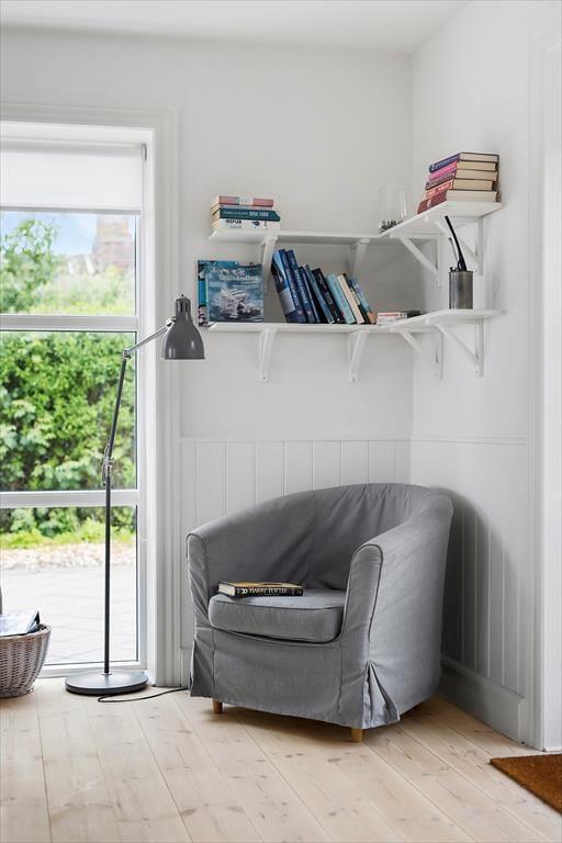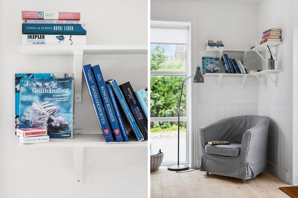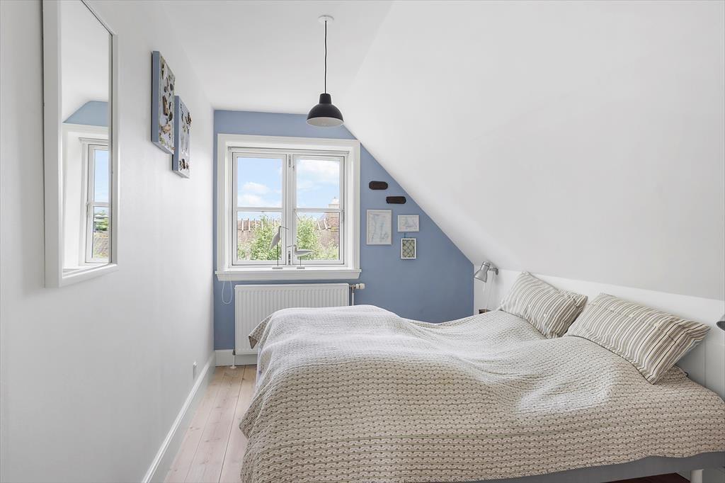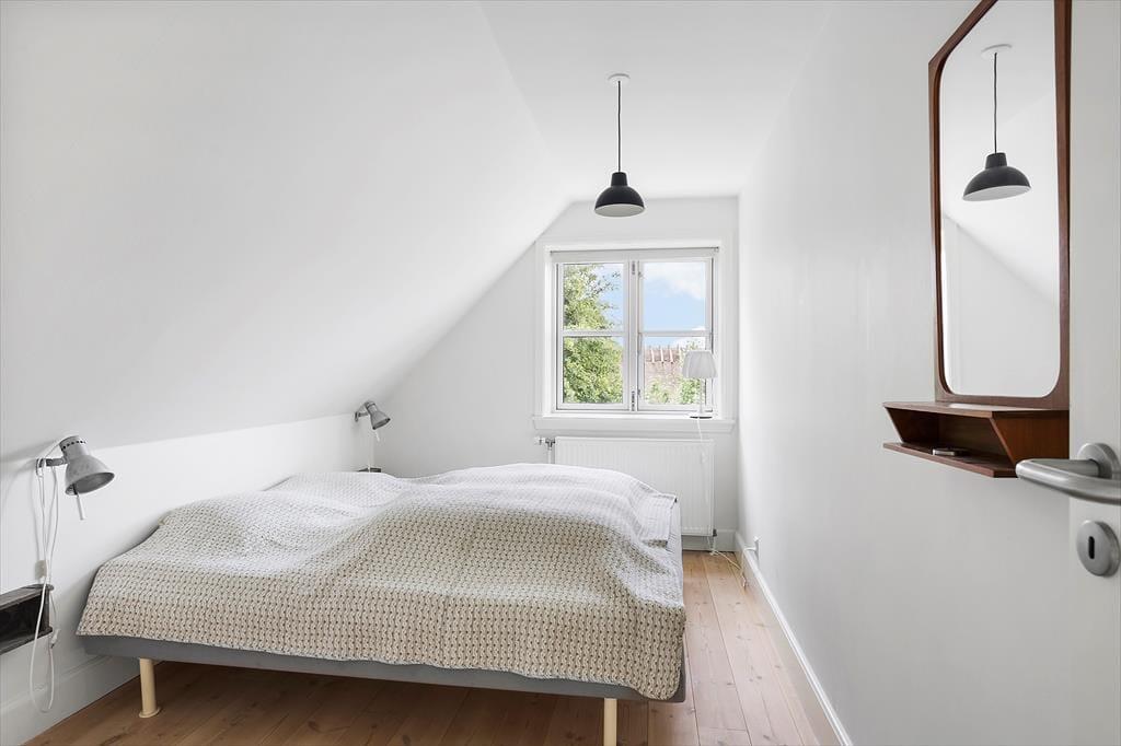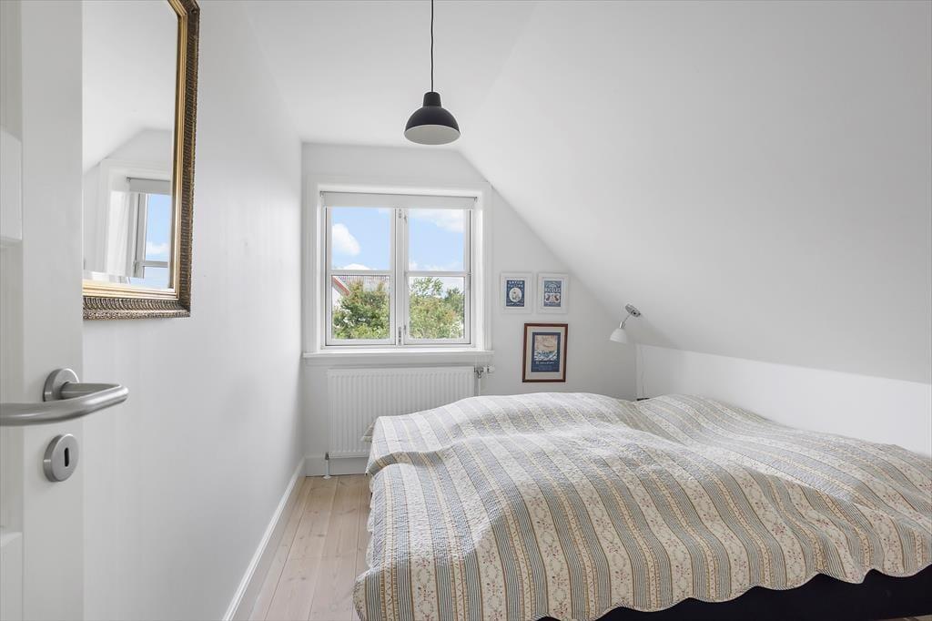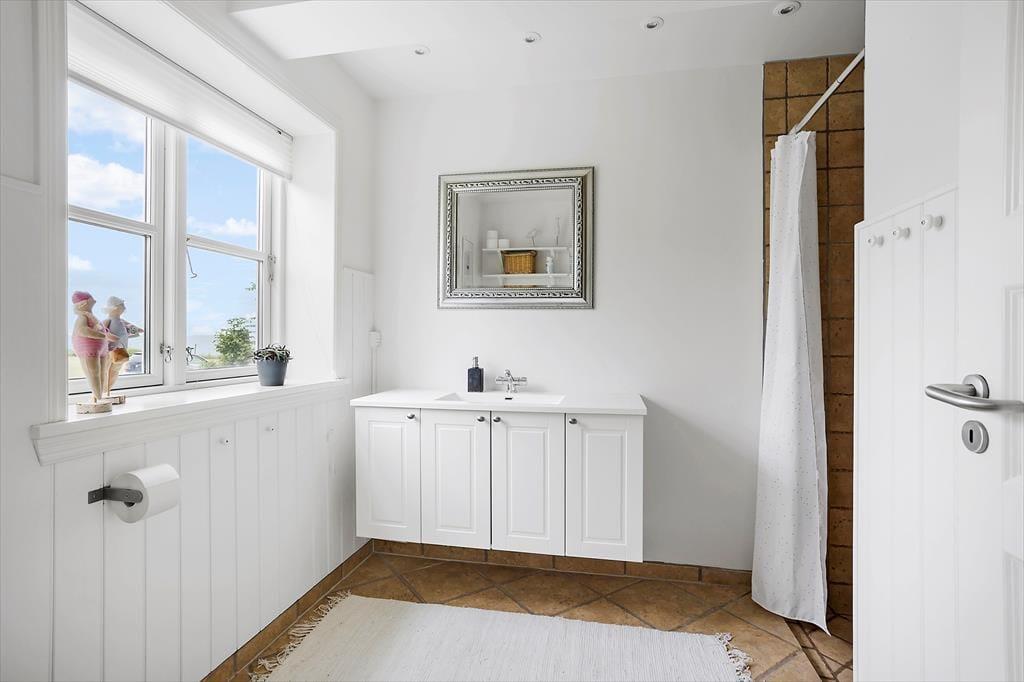 Når du træder indenfor i sommerhuset, mødes du straks af et dejligt, lyst køkken-alrum, som indbyder til hyggelige timer med familien. Brændeovnen i hjørnet af rummet skaber en varm og indbydende stemning, perfekt til at krybe sammen foran på køligere dage. Fra både køkkenet og stuen har du en smuk udsigt til havet – en udsigt, som for alvor understreger den særlige atmosfære ved dette sommerhus. I stuen fører en bred trappe dig op til førstesalen, hvorfra du også kan nyde den skønne havudsigt. Det er nemt at forestille sig afslappende øjeblikke her med en god bog eller bare at lade blikket hvile på bølgerne i det fjerne.