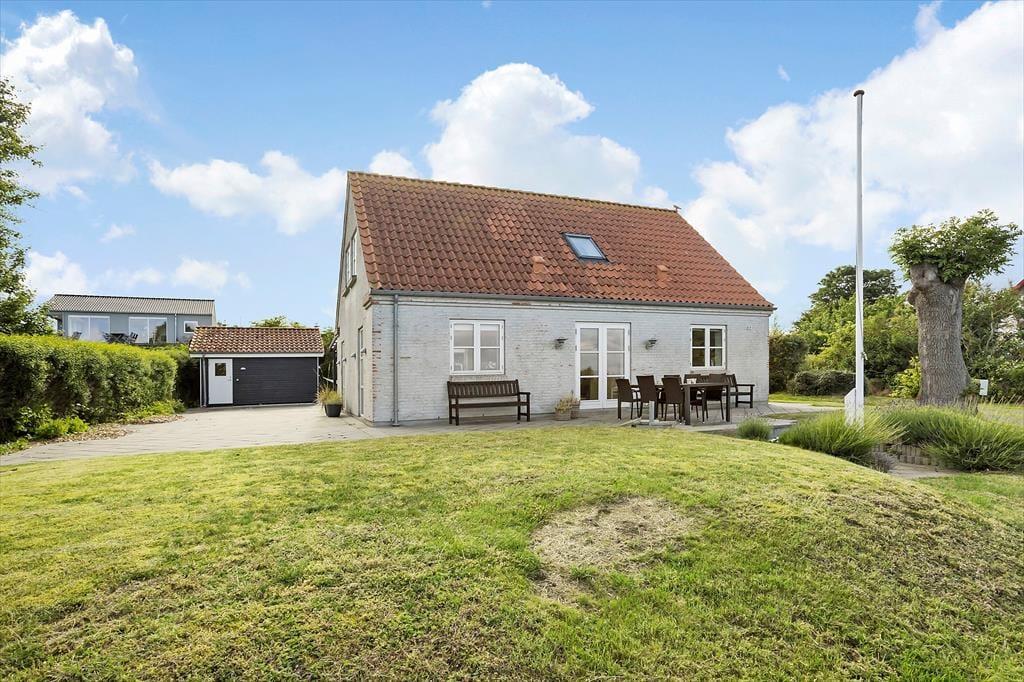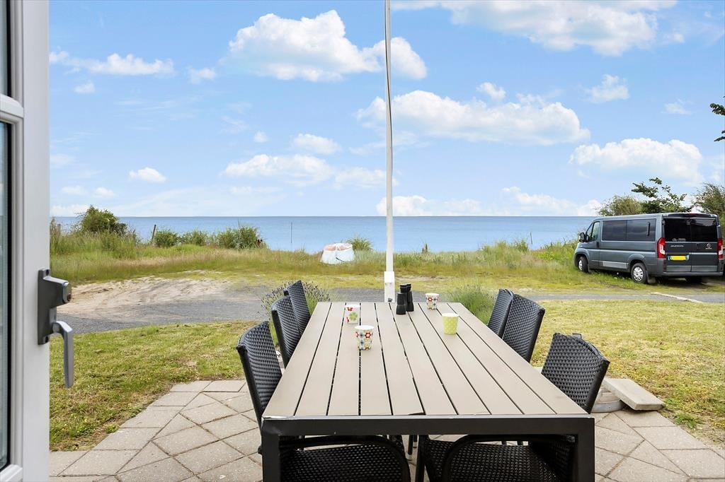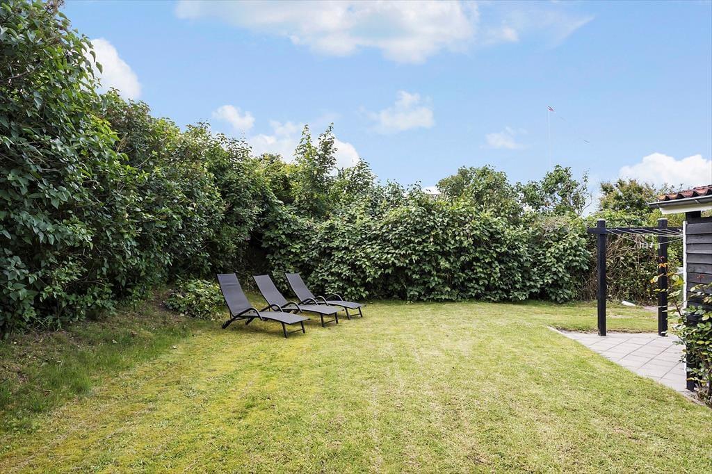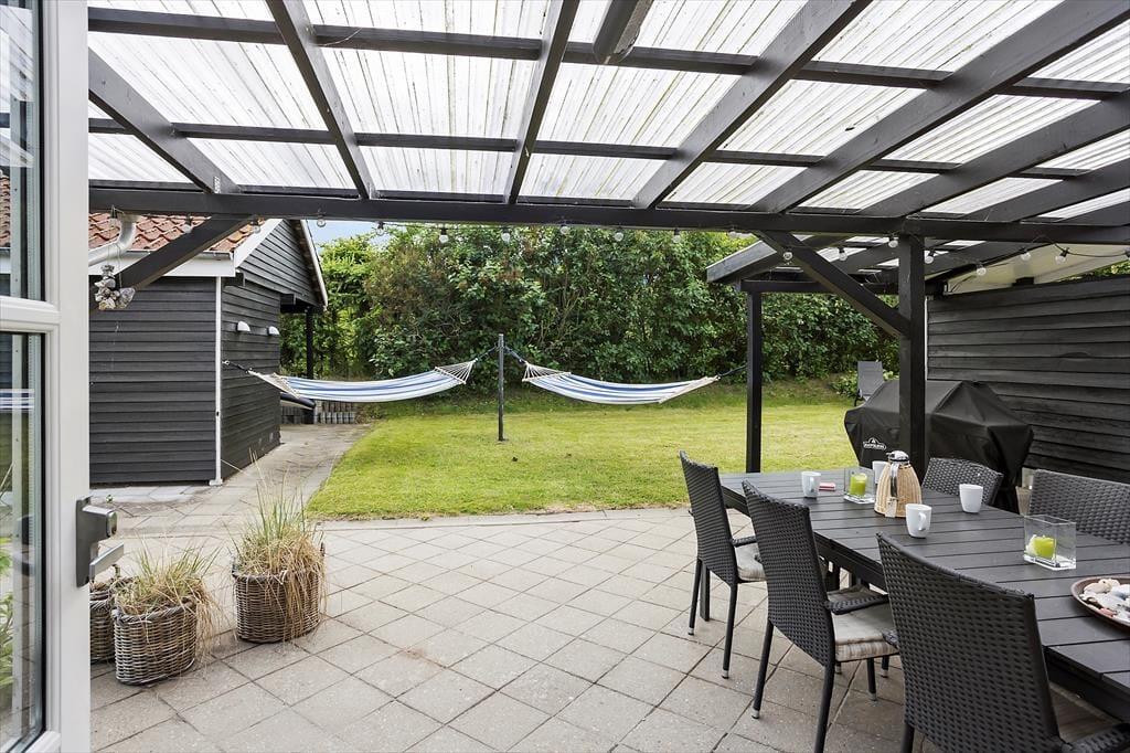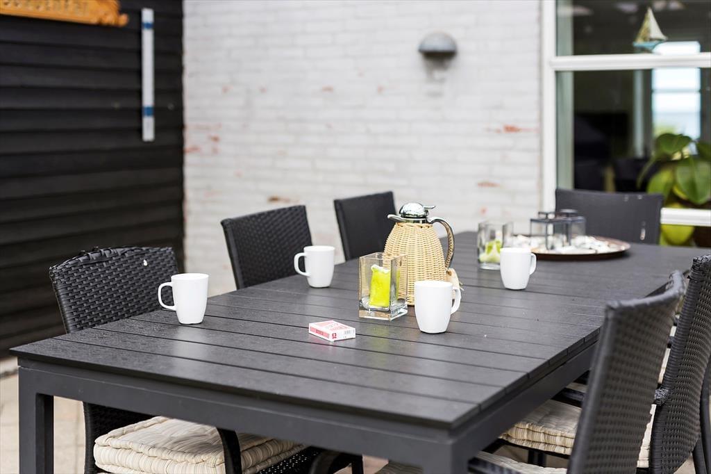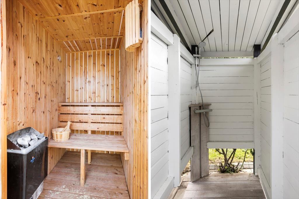 Husets store fliseterrasse er en oplagt base for dine udendørs aktiviteter. Her kan du sidde i komfortable havemøbler og lade dig betage af udsigten til havet, mens du nyder en rolig morgenkaffe eller en sen aftensmad med lyden af bølgerne i baggrunden. På bagsiden af huset finder du en delvis overdækket terrasse, hvor du kan slappe af i skyggen eller søge læ på de mere blæsende dage. Når du kommer hjem efter en dukkert i havet, er den praktiske udebruser – placeret i et afskærmet og overdækket område – klar til at skylle saltvandet af, så du kan føle dig frisk og afslappet efter en dag på stranden.
