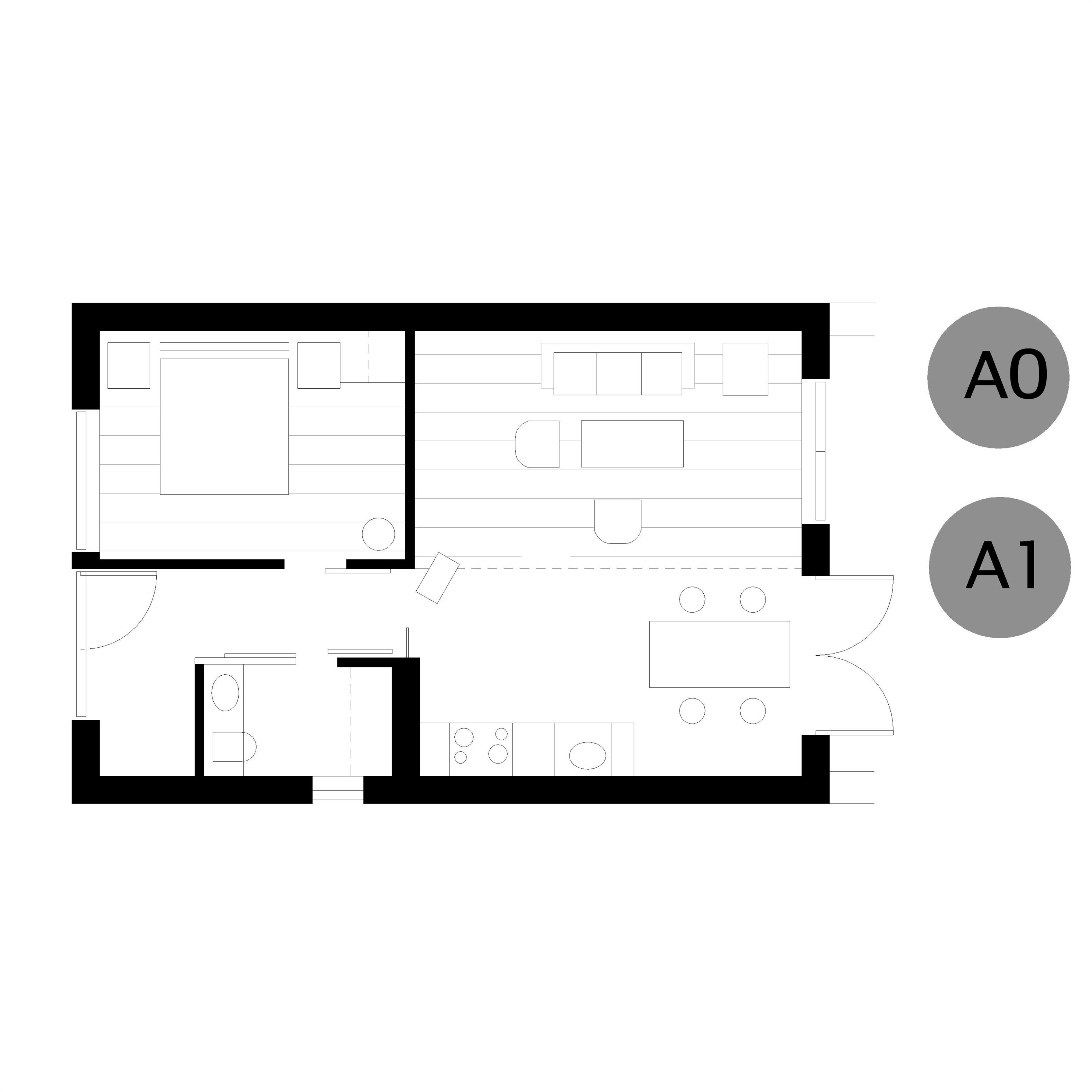 Entré, køkken, stue med sovesofa, badeværelse, soveværelse med dobbeltseng.