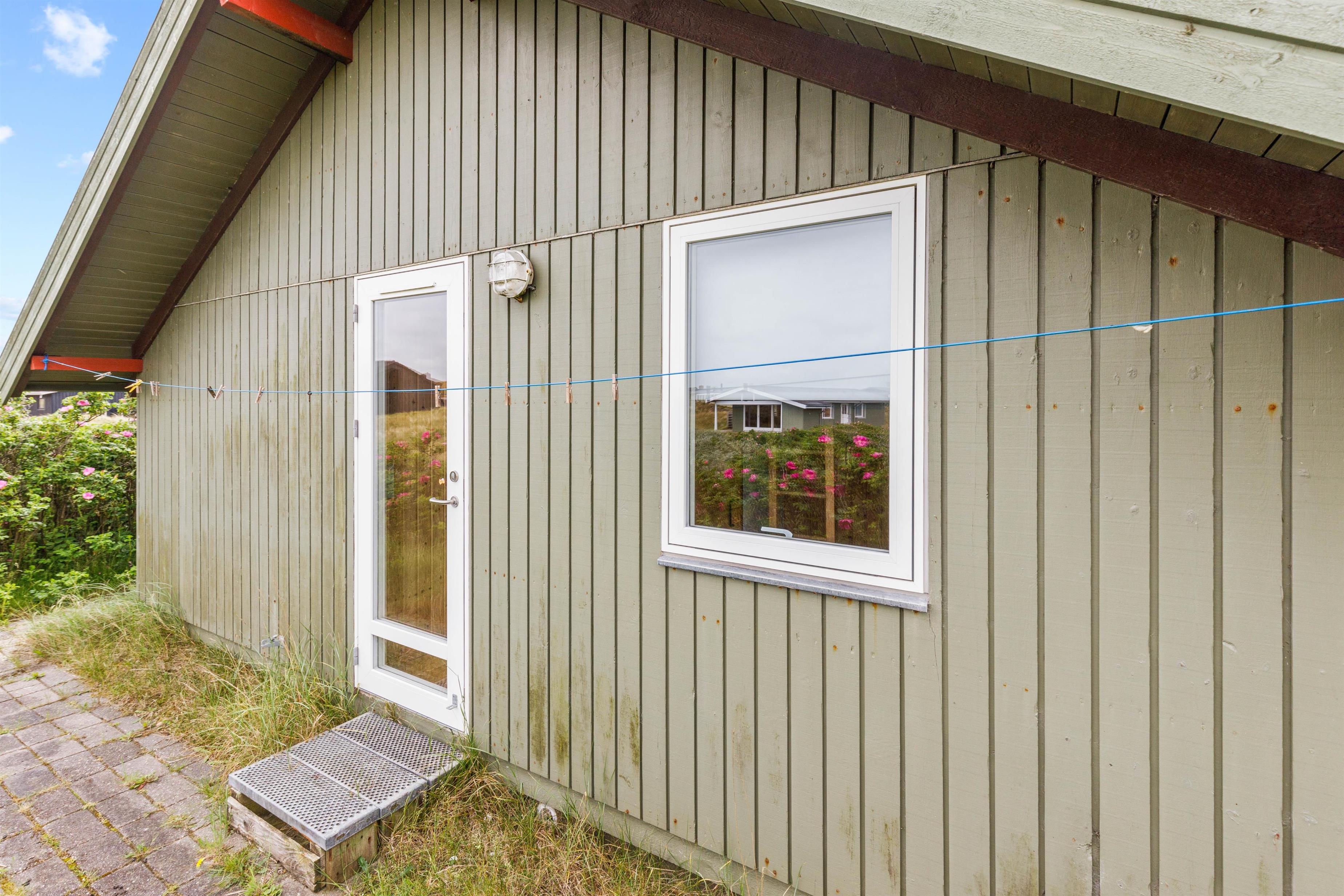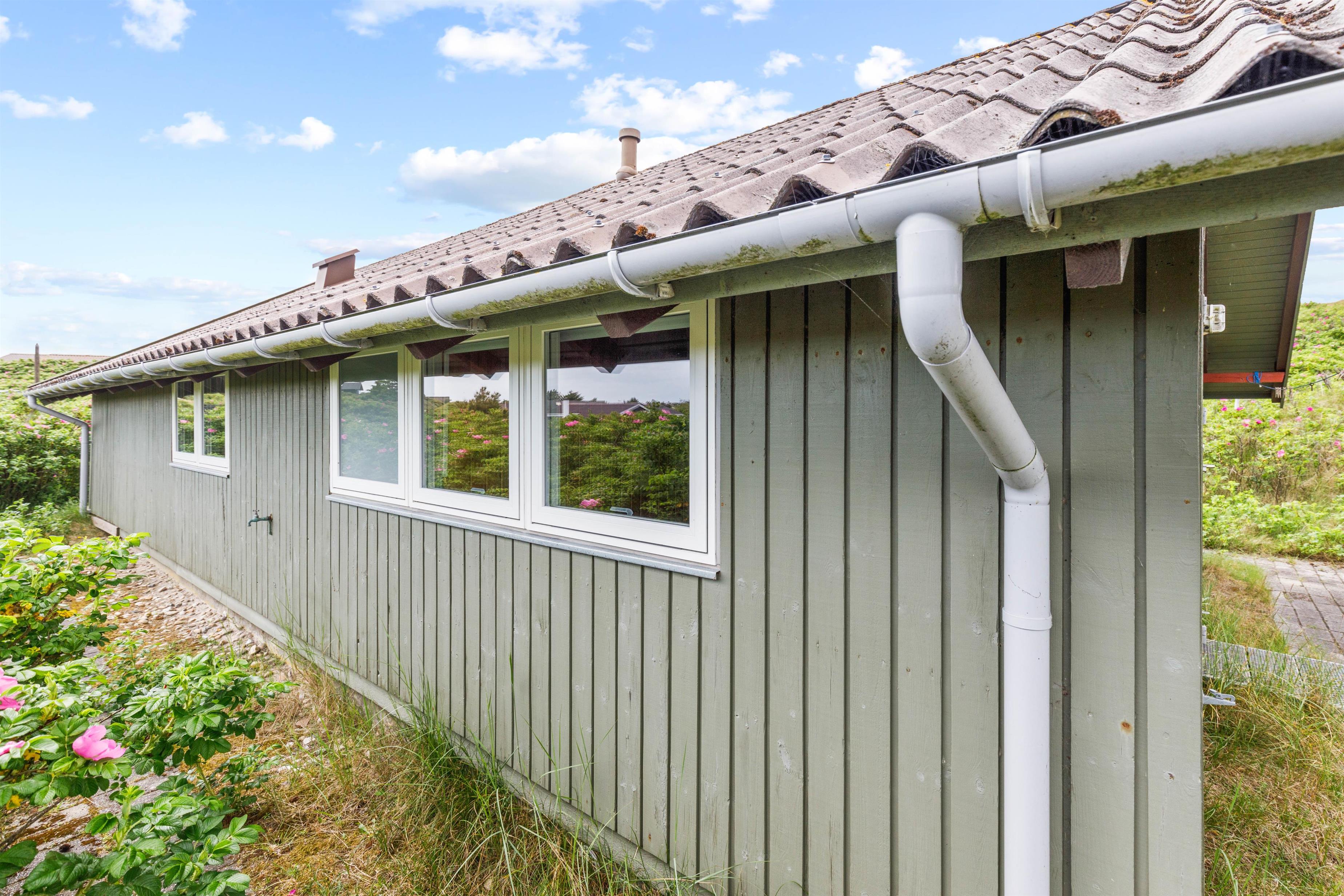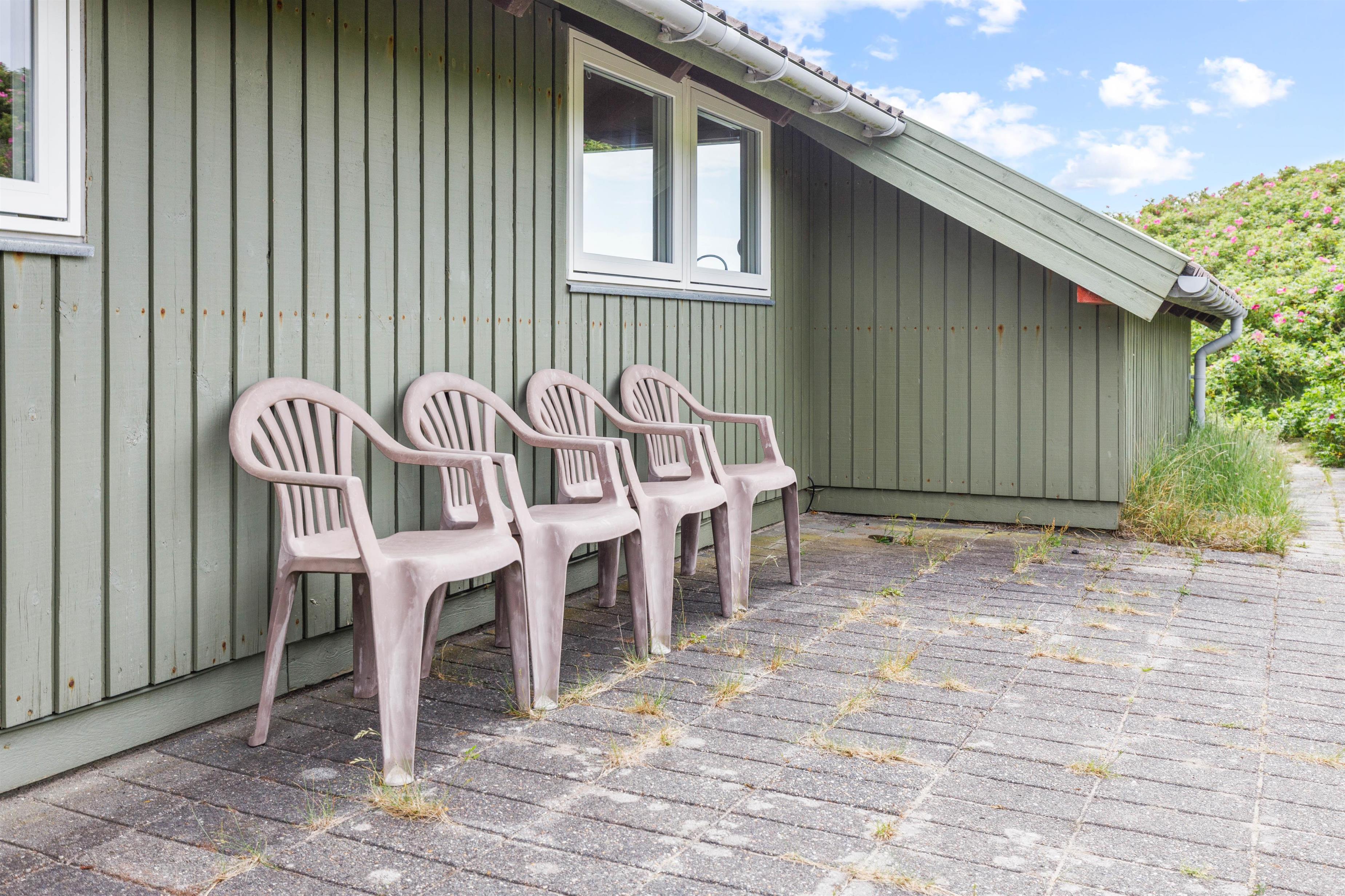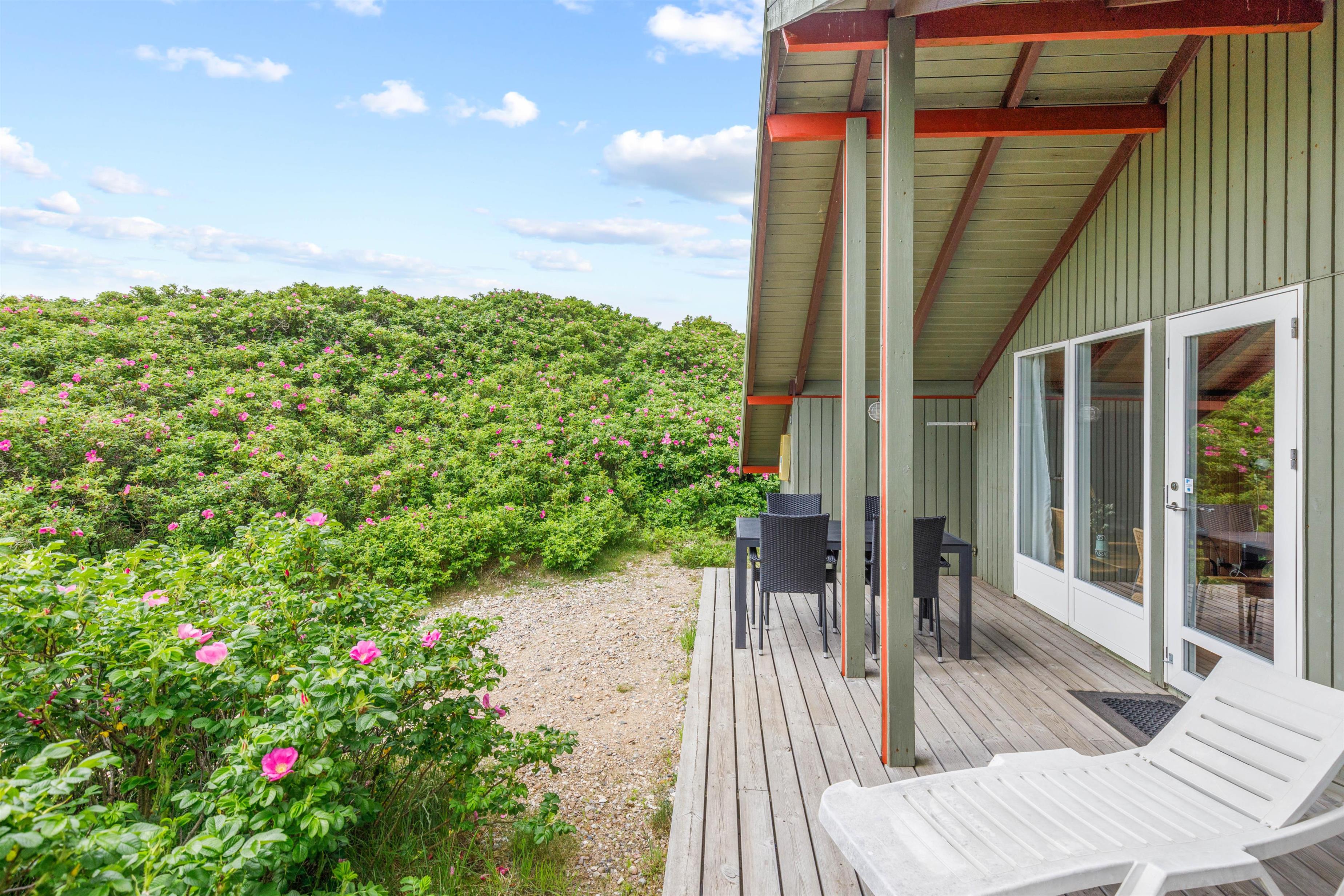 Feriehusets sydvendte terrasse er indrettet med havemøbler, solvogne og en grill. Her kan I læne jer tilbage og nyde ferien i fulde drag. Læg jer til rette på solvognen, og nyd den friske, salte havluft og duften af klitroserne der omkranser feriehuset. Når dagen går på hæld, kan I tænde op i grillen og nyde en god middag under overdækningen mens I planlægger næste dags aktiviteter og udflugter.