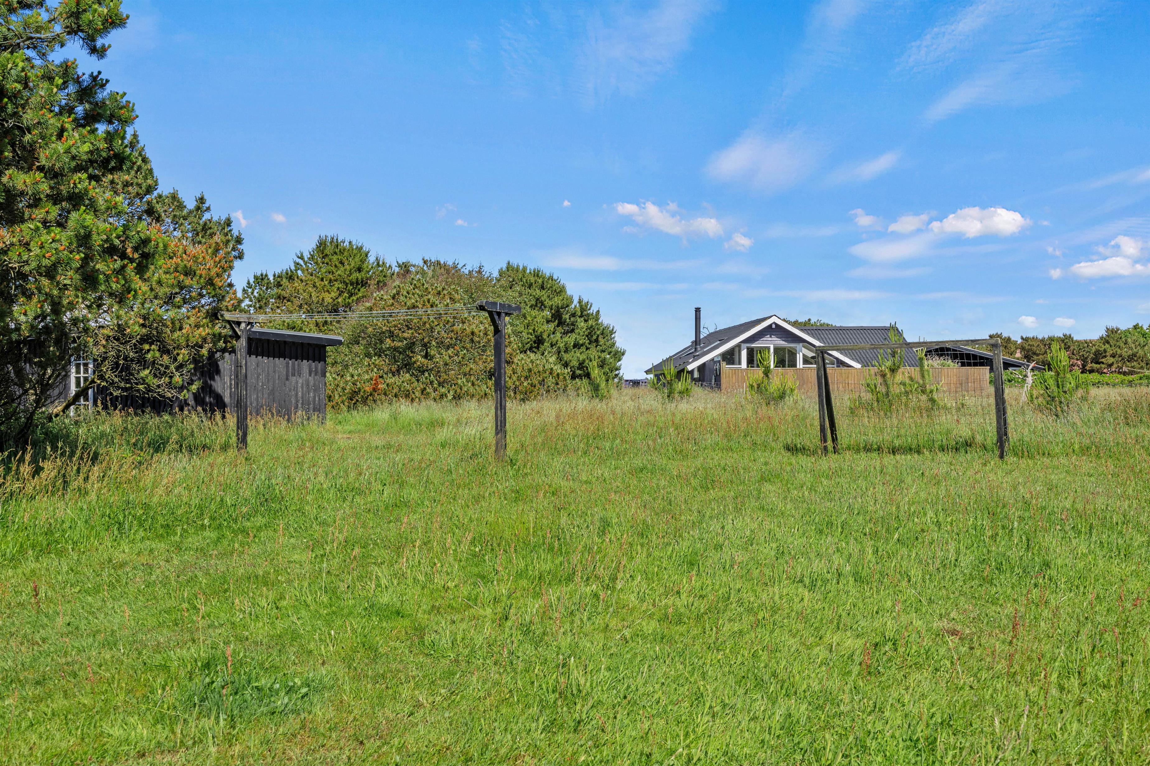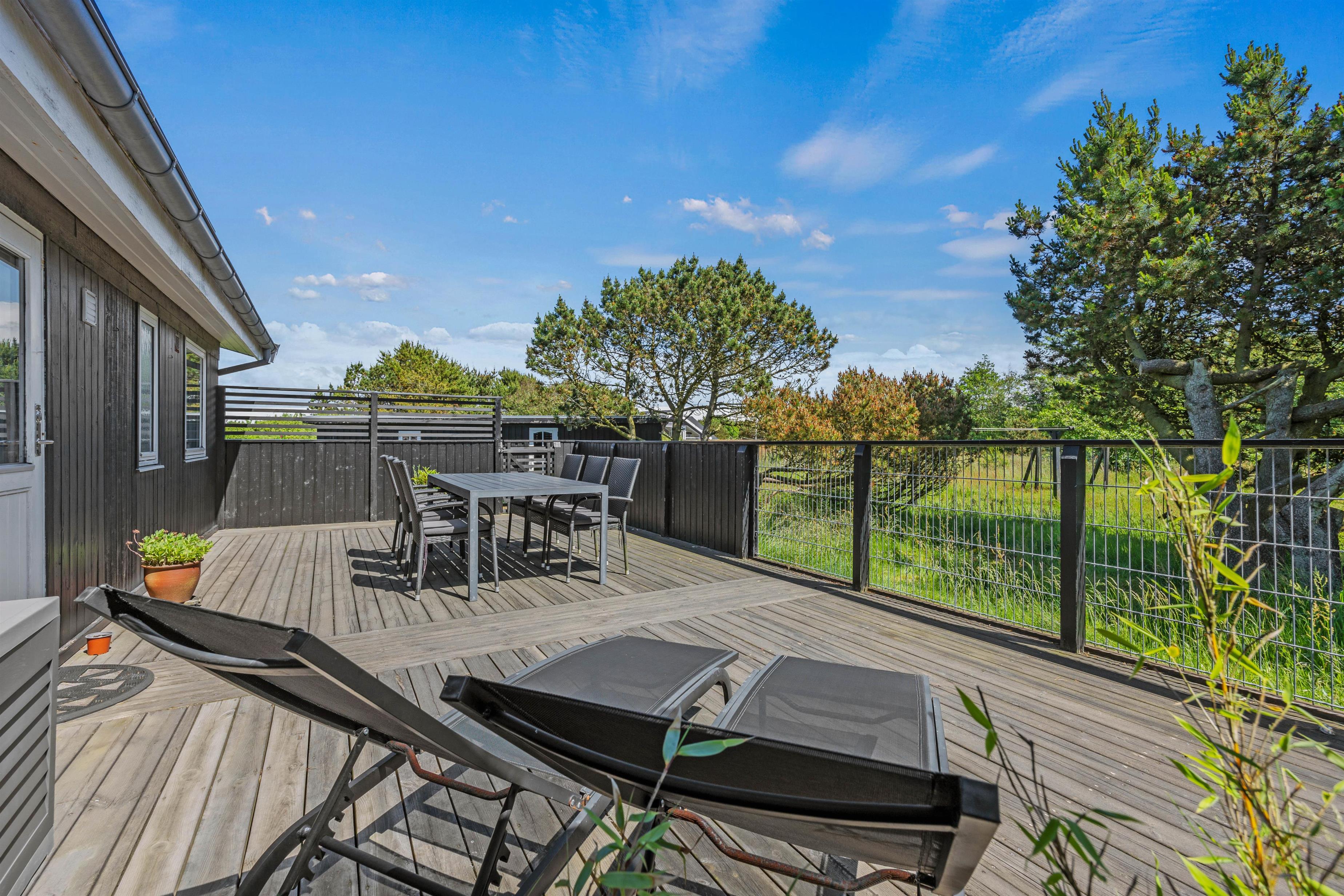 Når I kommer hjem fra en tur på stranden, der ligger 850 meter fra huset, kan det sidste sand skylles af i udebruseren. Denne kan benyttes fra april til november. Der er både åben, afskærmet og lukket terrasse at hygge sig på, når der for eksempel skal grilles. Eller hvis man bare skal dase i havemøblerne og på solvognene, alt imens kan børnene hygge sig med leg på trampolinen eller tage sig en gyngetur.