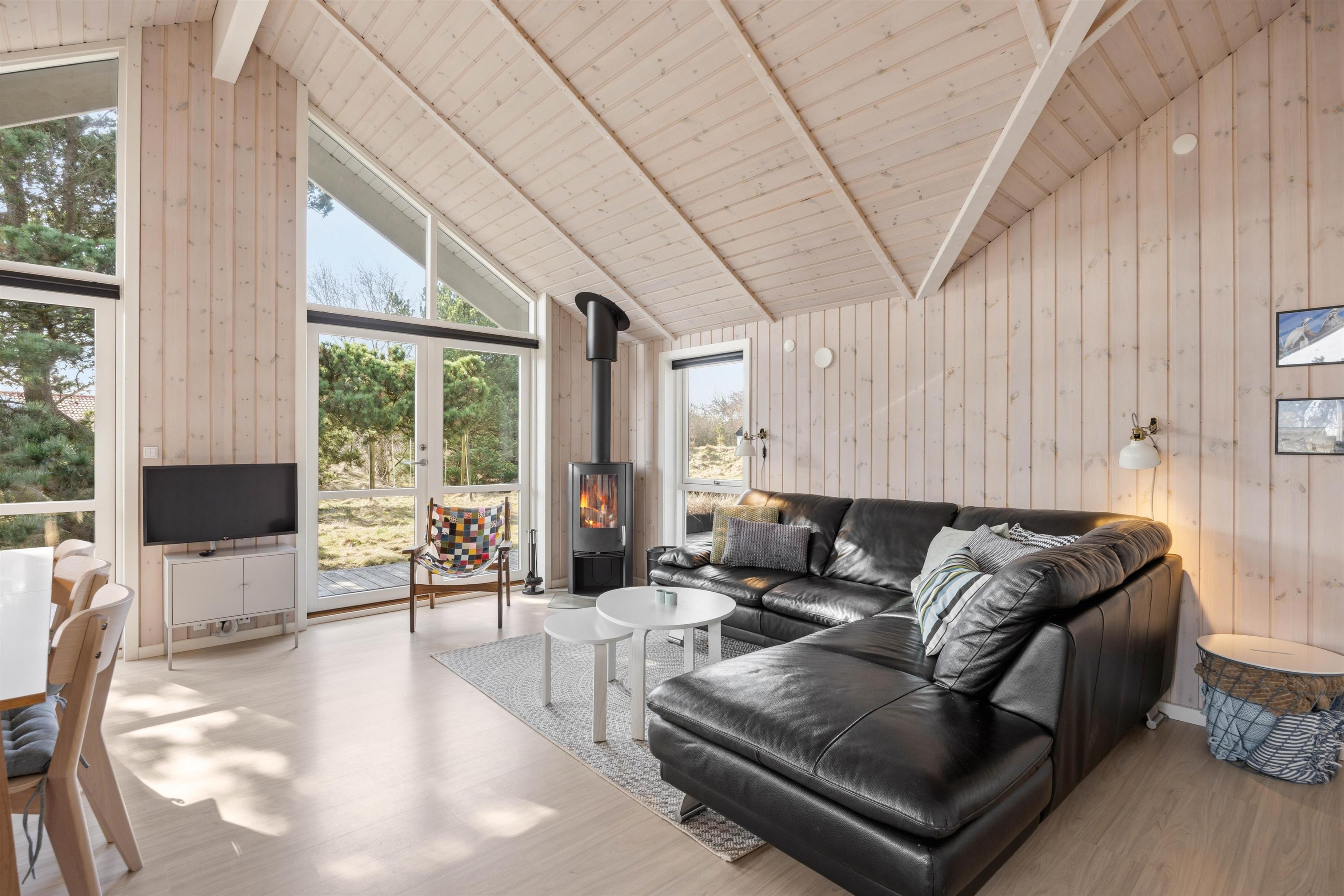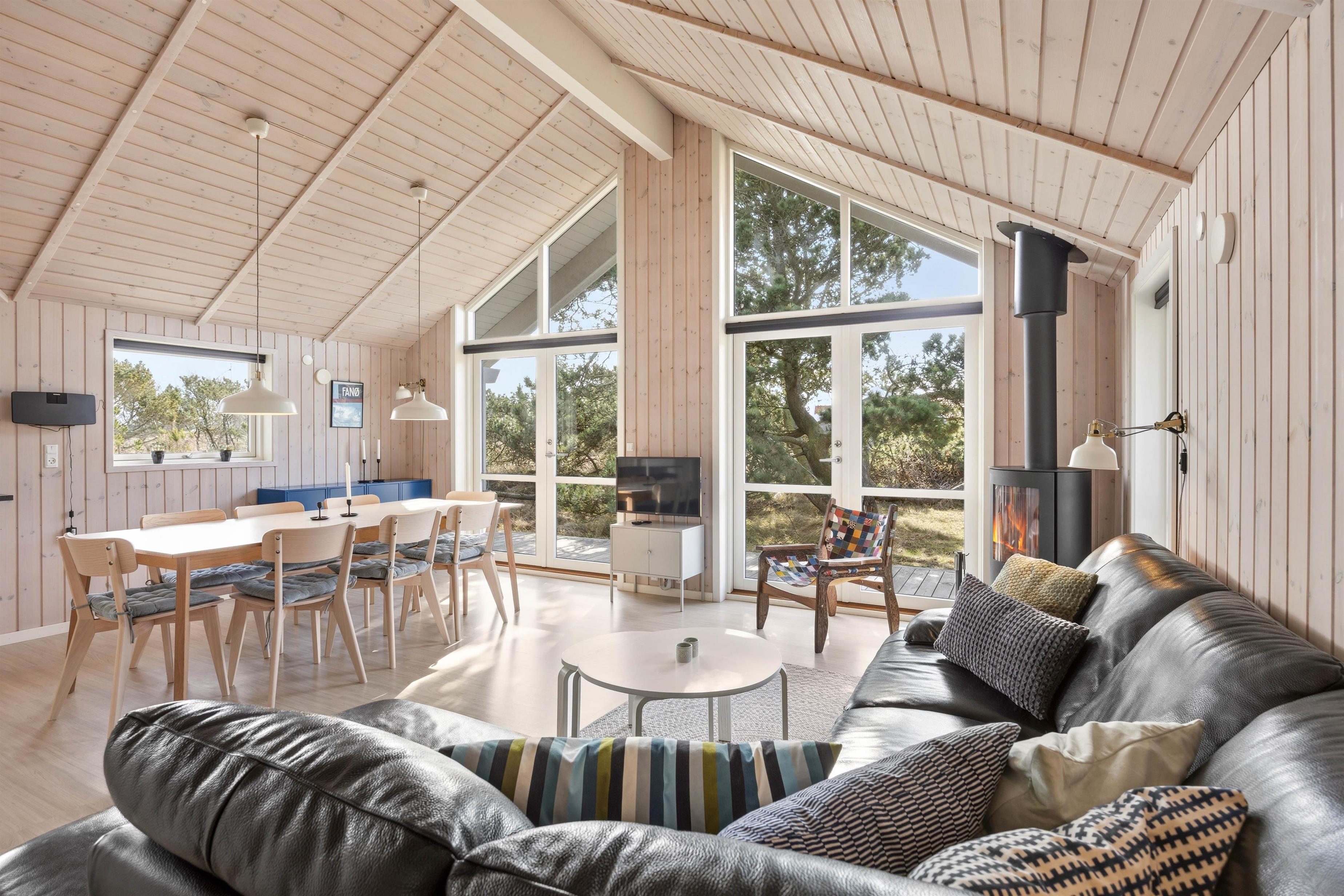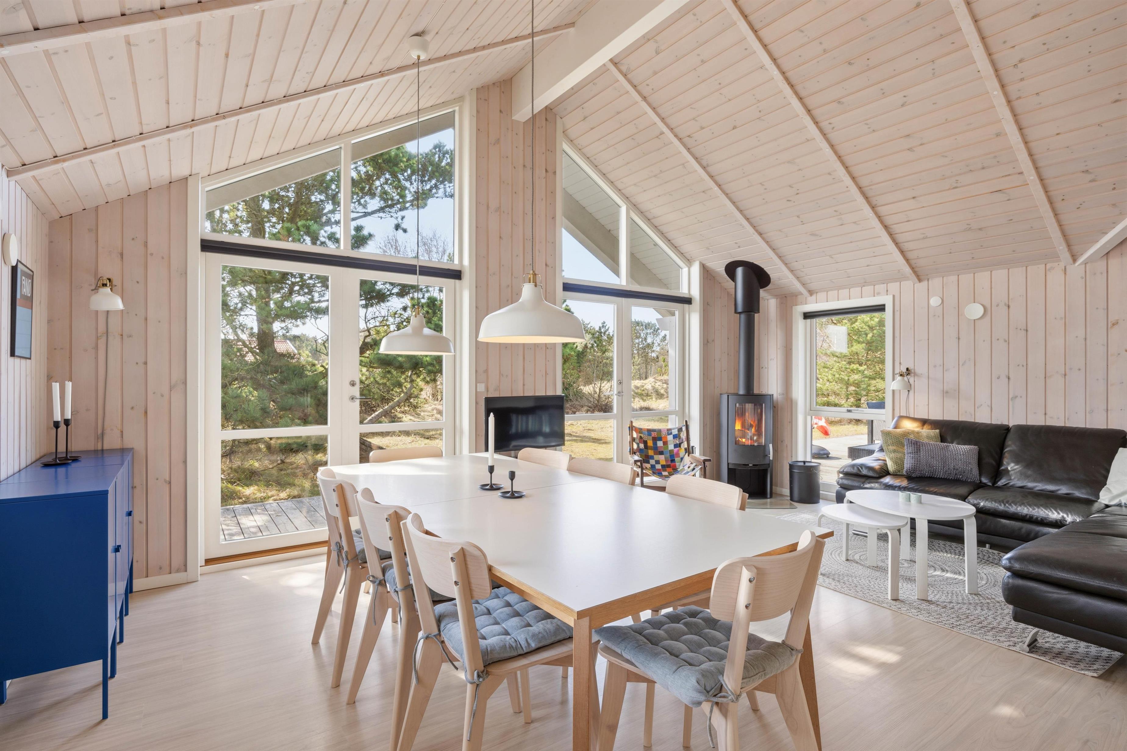 Det åbne opholdsområde udgør hjertet i feriehuset. Her er veludstyret køkken, vinkøleskab og spisestue og stue i åbent plan. Når der laves mad, kan I samtidig snakke sammen, andre spille eller slappe af - og I kan stadig være sammen. Den hyggelige brændeovn sørger for en behagelig varme på koldere dage, mens den moderne varmepumpe sikrer et behageligt indeklima hele året rundt. Den åbne indretning skaber en behagelig fornemmelse, der er 'højt til loftet', en lys og indbydende atmosfære.