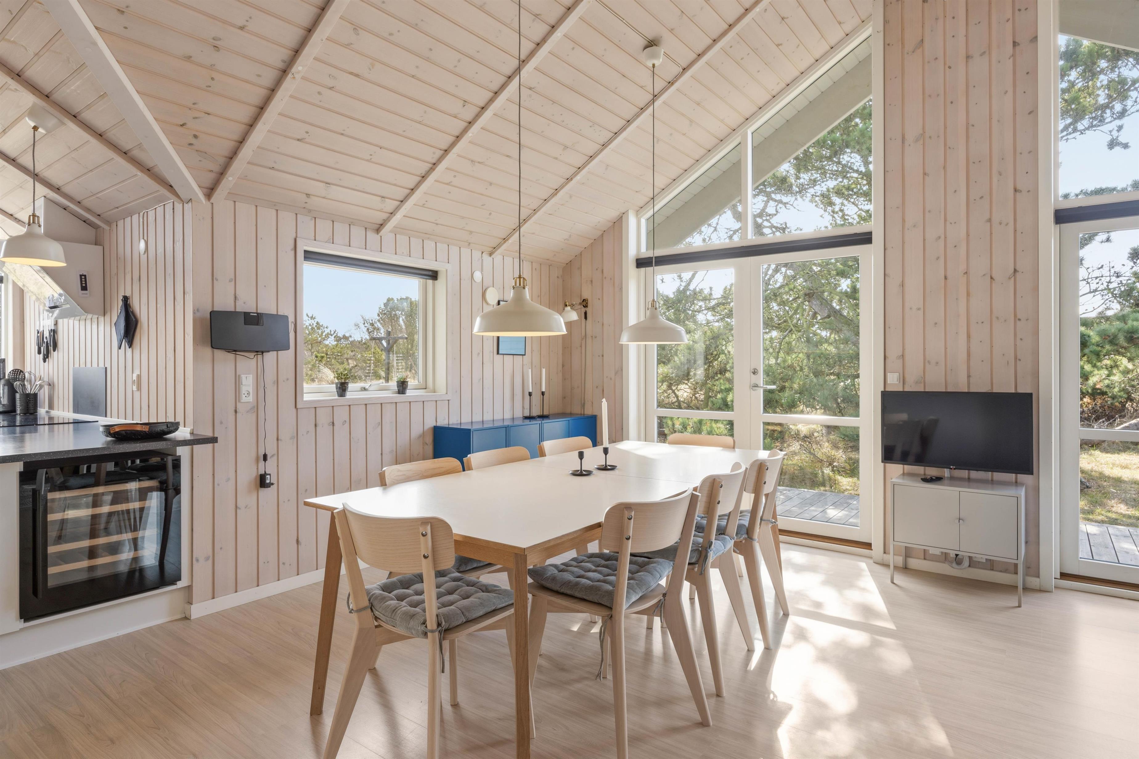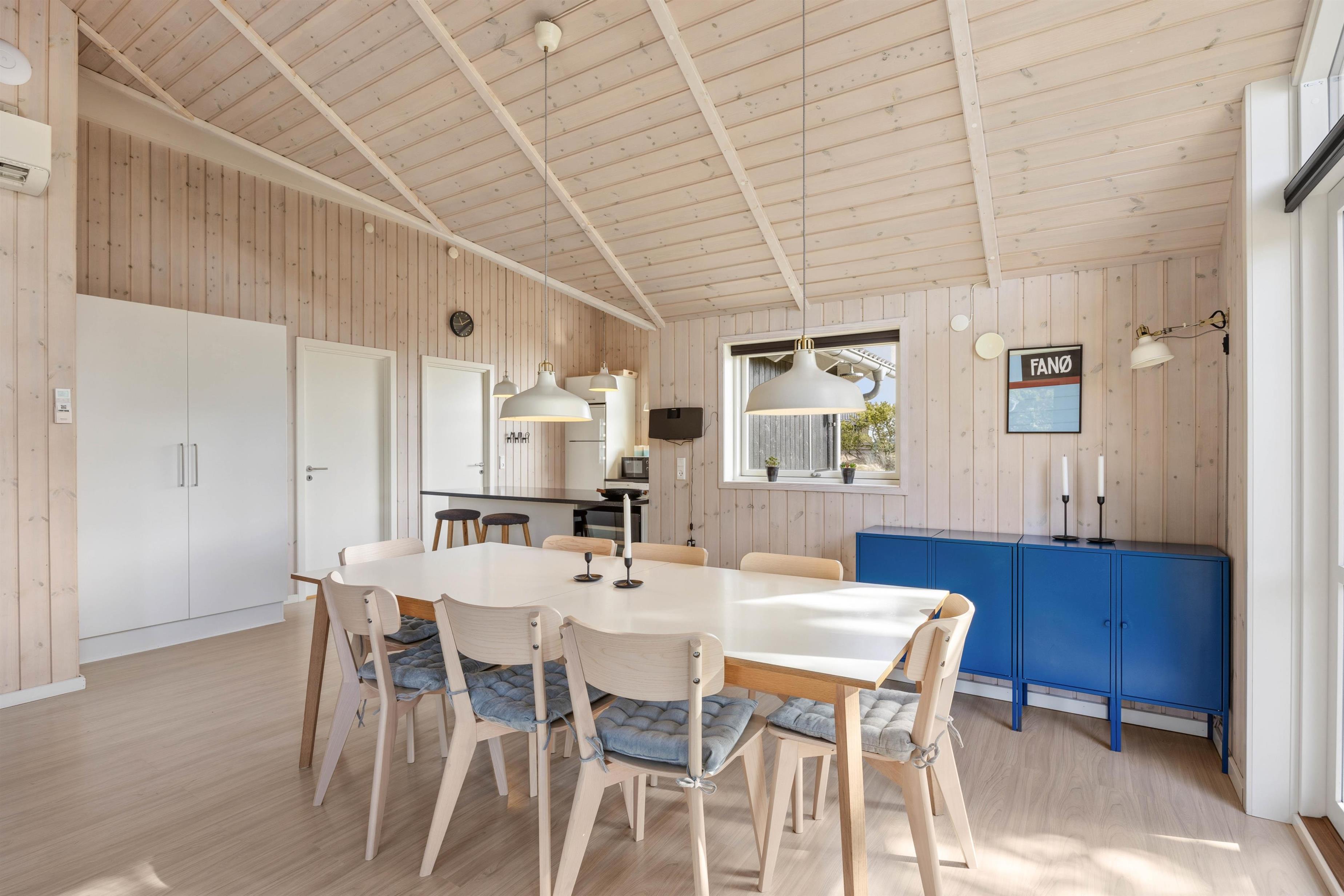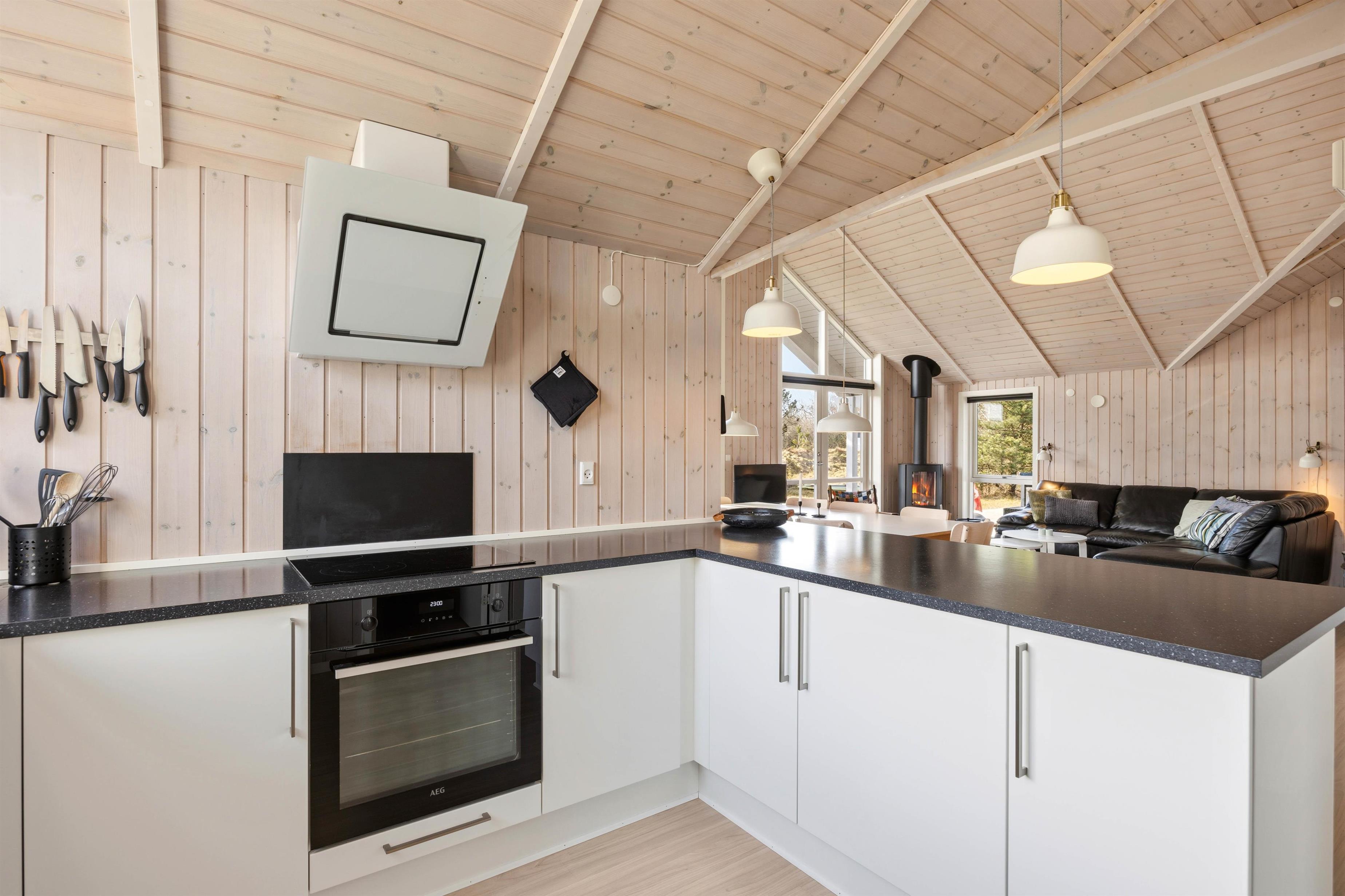 Det åbne opholdsområde udgør hjertet i feriehuset. Her er veludstyret køkken, vinkøleskab og spisestue og stue i åbent plan. Når der laves mad, kan I samtidig snakke sammen, andre spille eller slappe af - og I kan stadig være sammen. Den hyggelige brændeovn sørger for en behagelig varme på koldere dage, mens den moderne varmepumpe sikrer et behageligt indeklima hele året rundt. Den åbne indretning skaber en behagelig fornemmelse, der er 'højt til loftet', en lys og indbydende atmosfære.