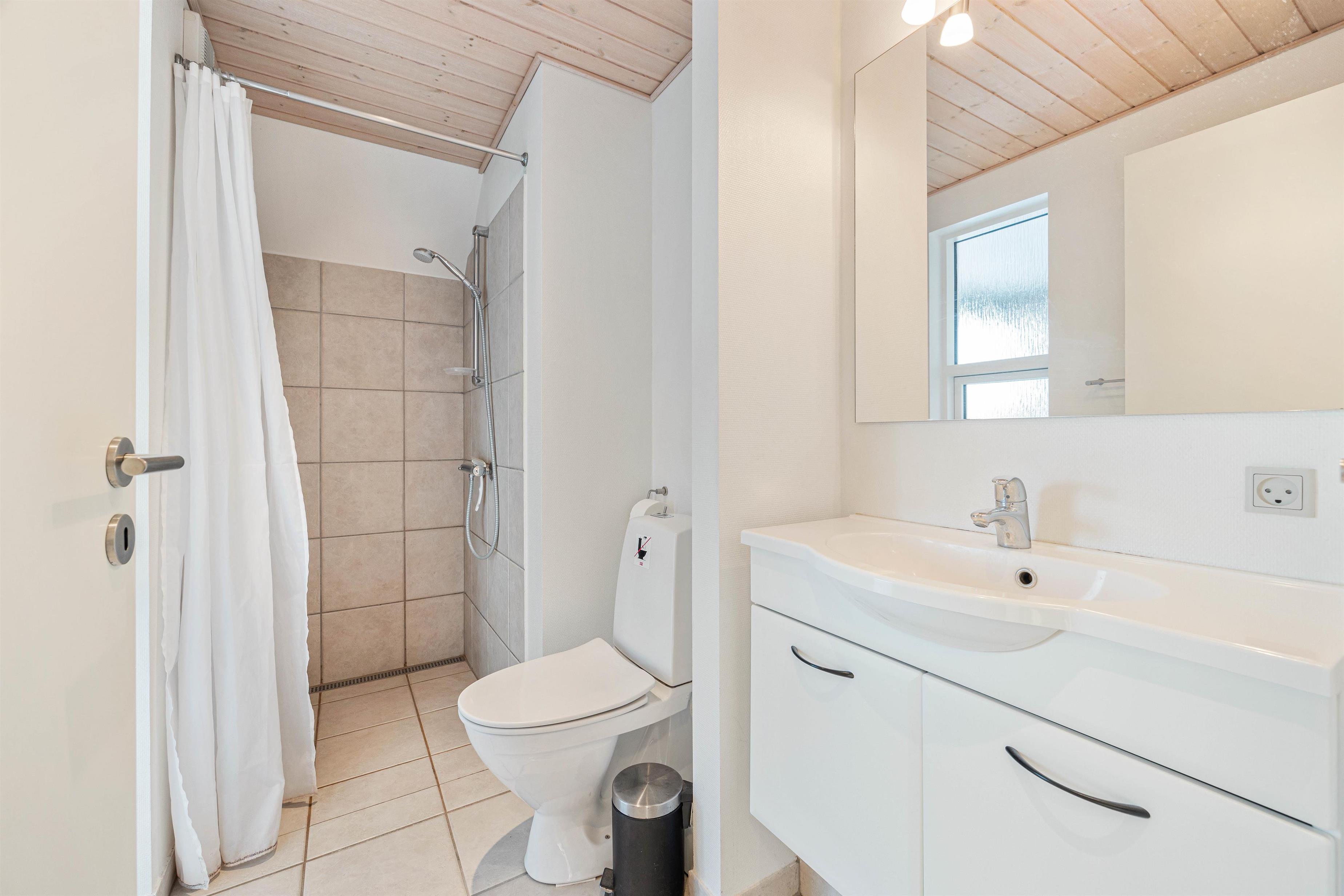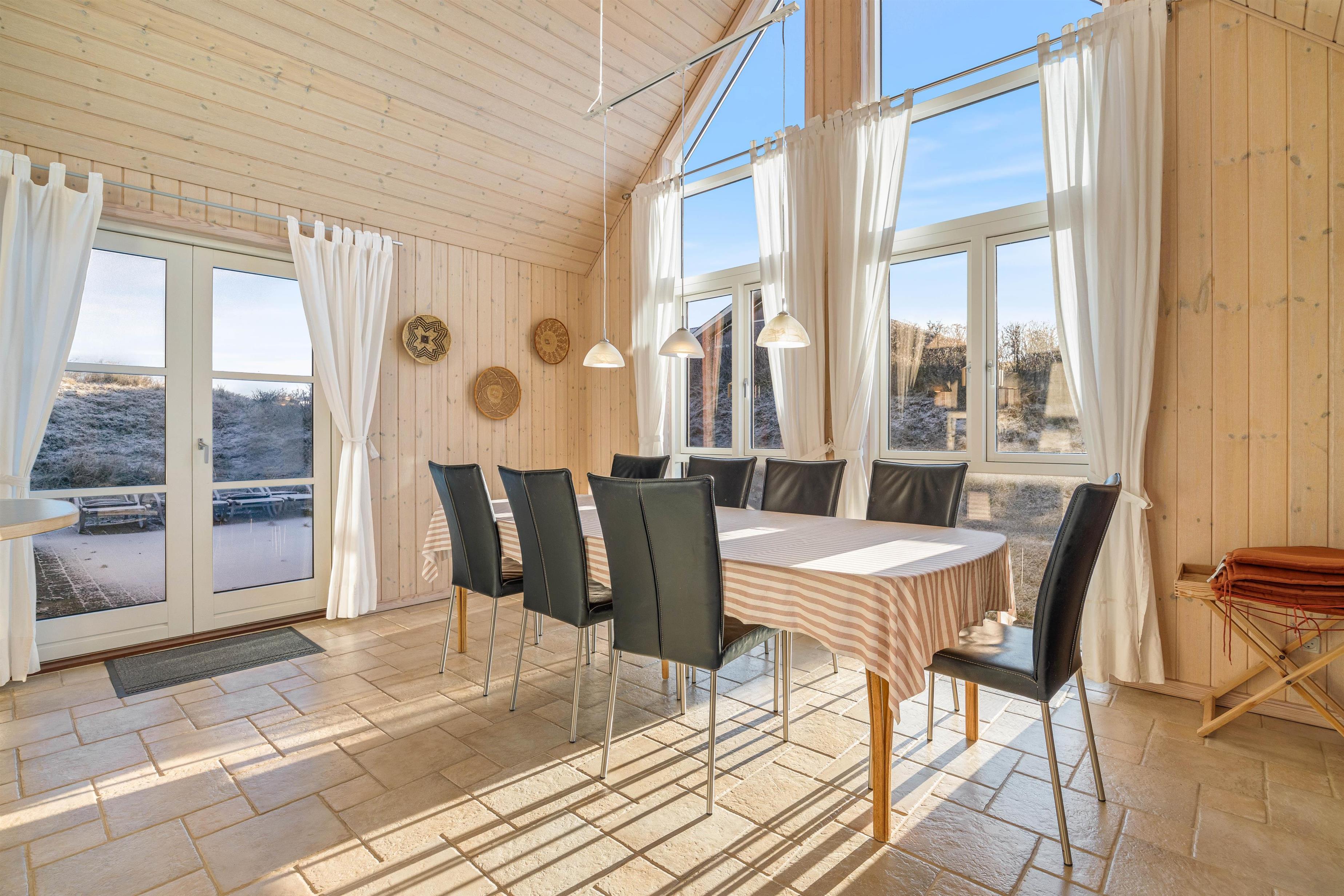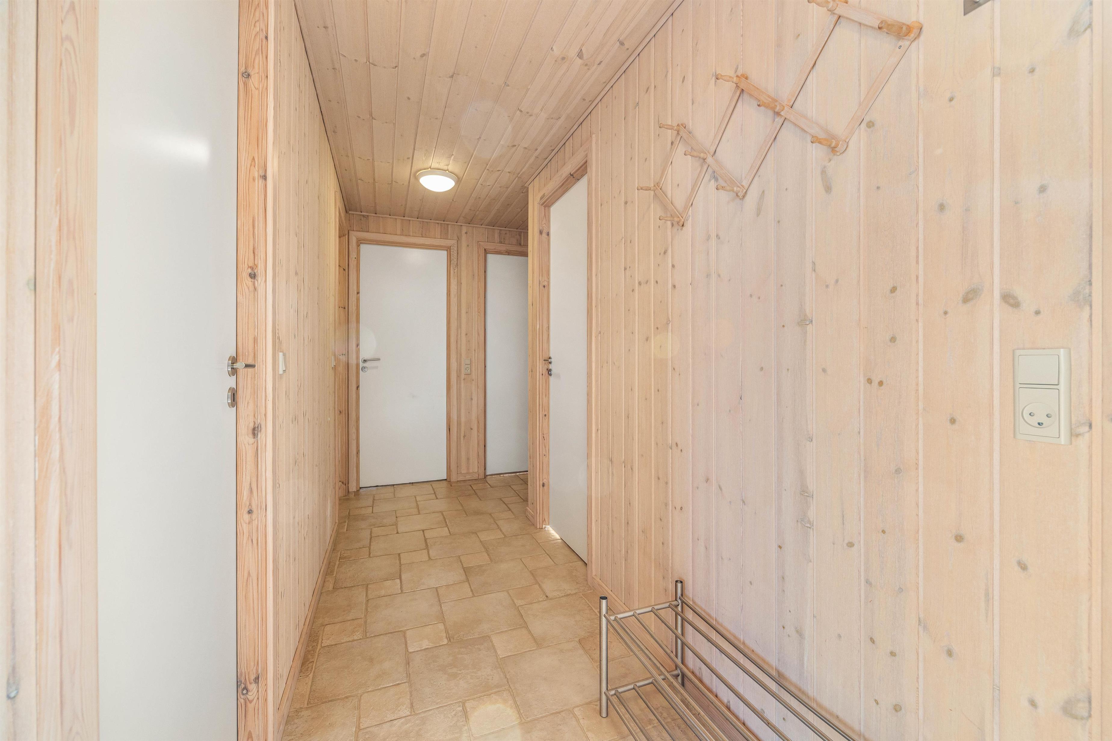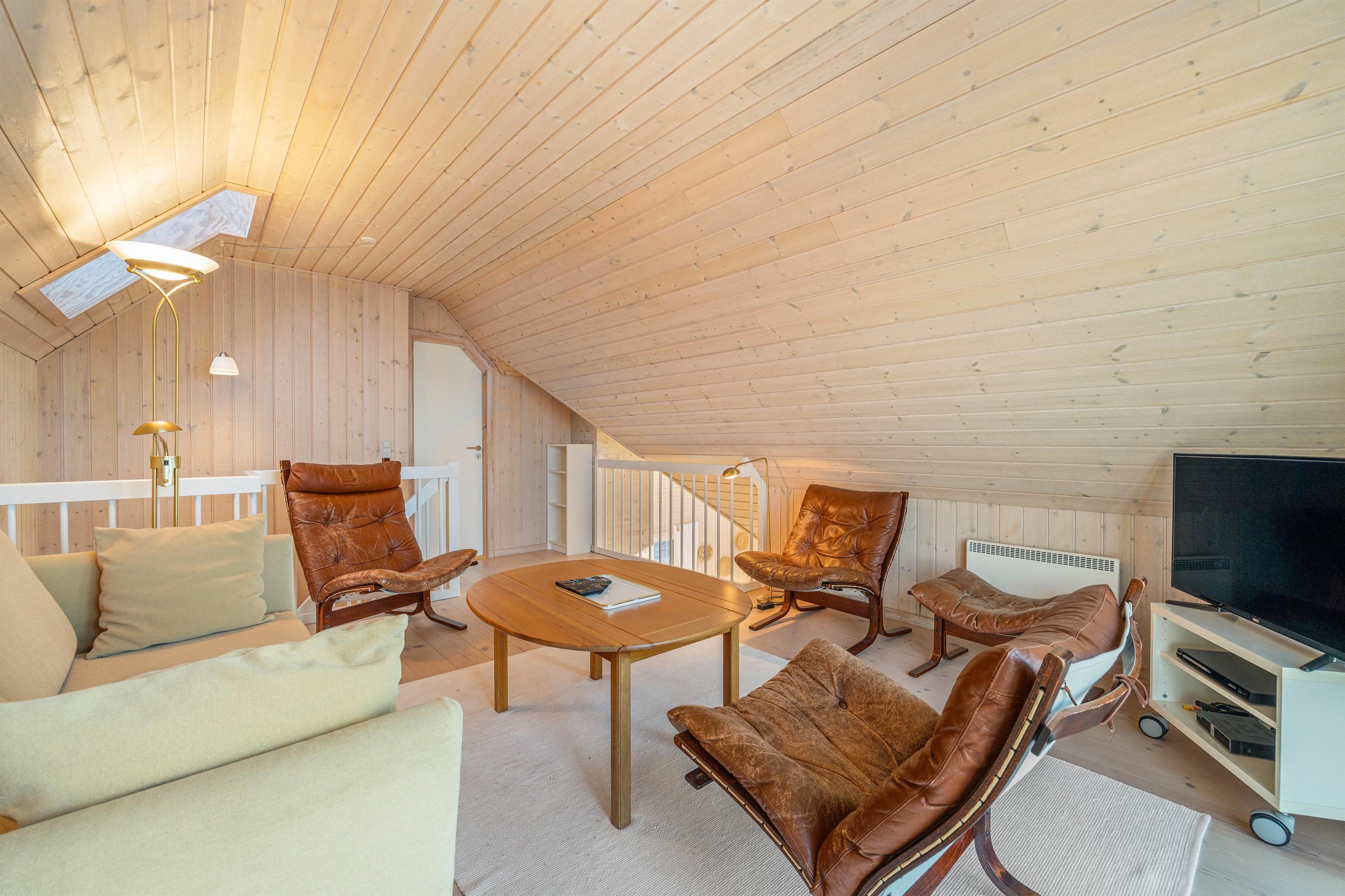 På første salen ligger et lyst soveværelse, hvor der også tv-er stue med hav kig og en fransk altan. Der er henholdsvis tre danske og tyske kanaler på tv’et. Dette dejlige feriehus indbyder til gåture på stranden og grillaftner på den indhegnede terrasse.