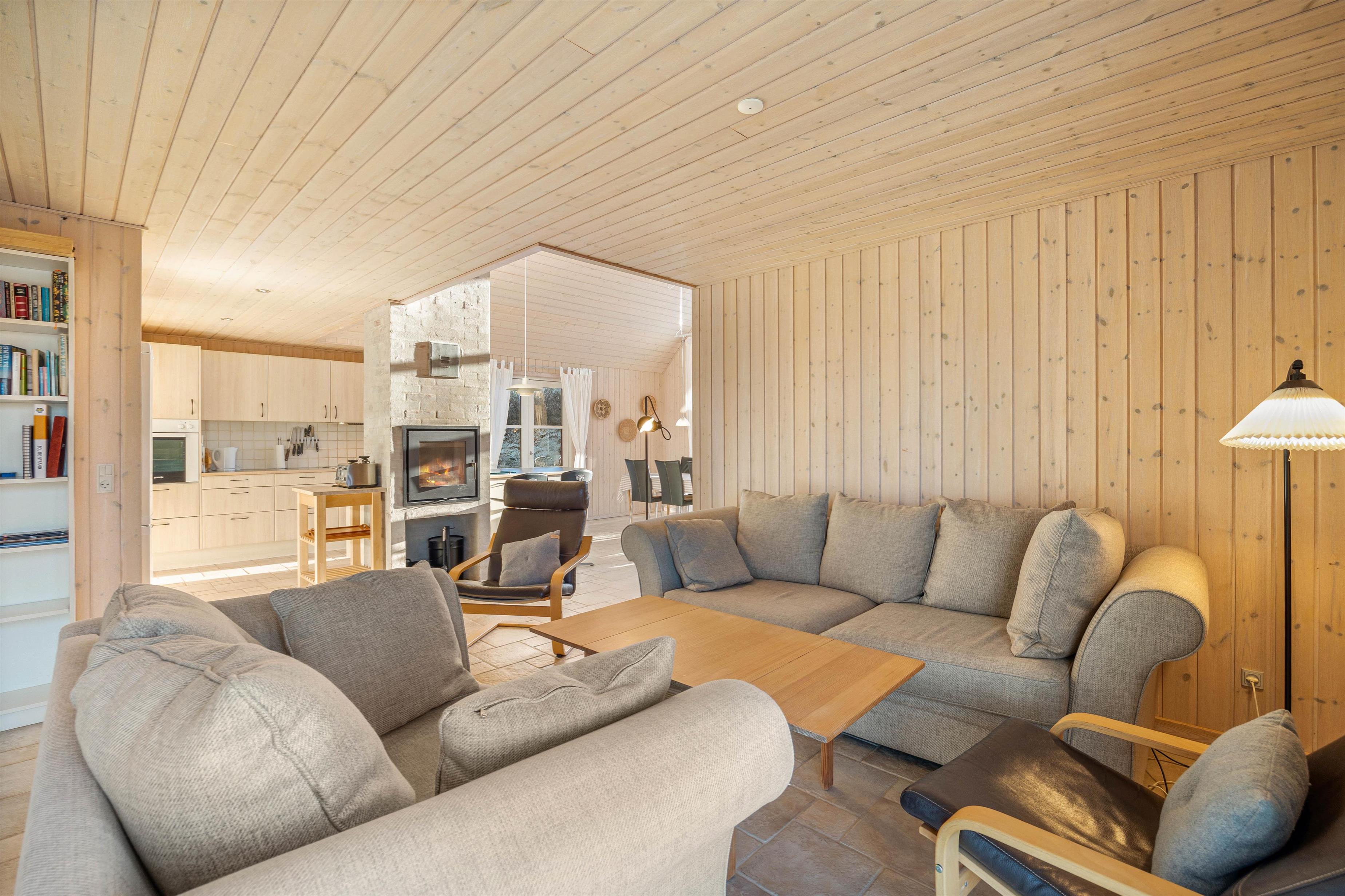 Stueetagen indeholder 2 indbydende badeværelser med gulvvarme. I saunaen kan man få slappet af. Køkkenet er lyst og moderne, og er praktisk indrettet med loft til kip og åben forbindelse til stuen. I køkkenet er der alt hvad man skal bruge af faciliteter i form af køleskab, keramiske kogeplader, varmluftovn og en mikrobølgeovn samt opvaskemaskine. I den hyggelige opholdsstue er der brændeovn.