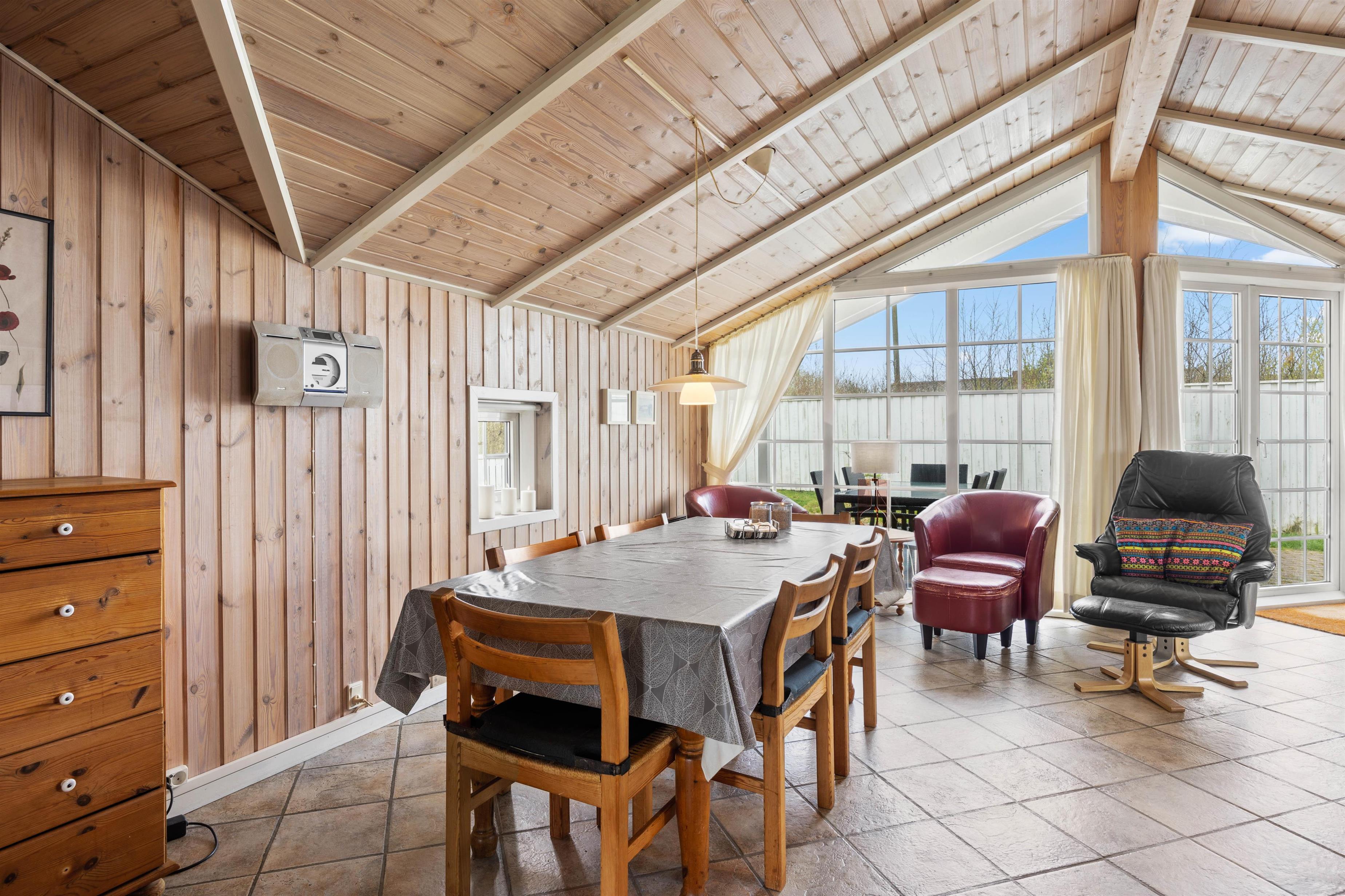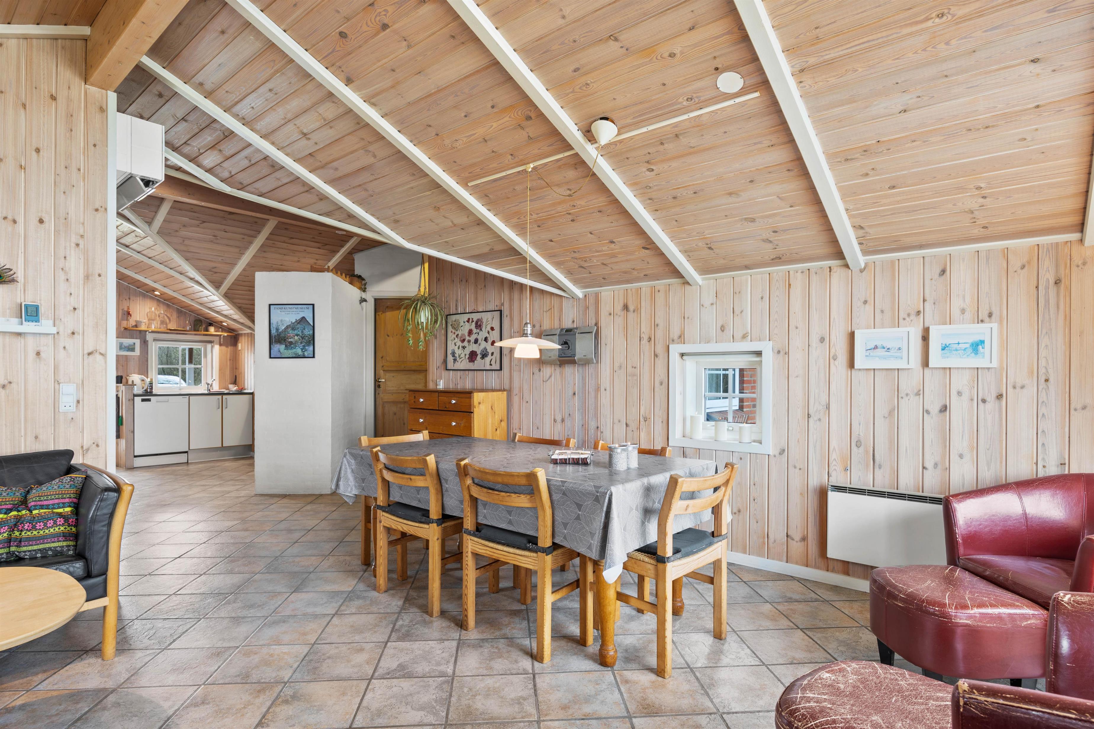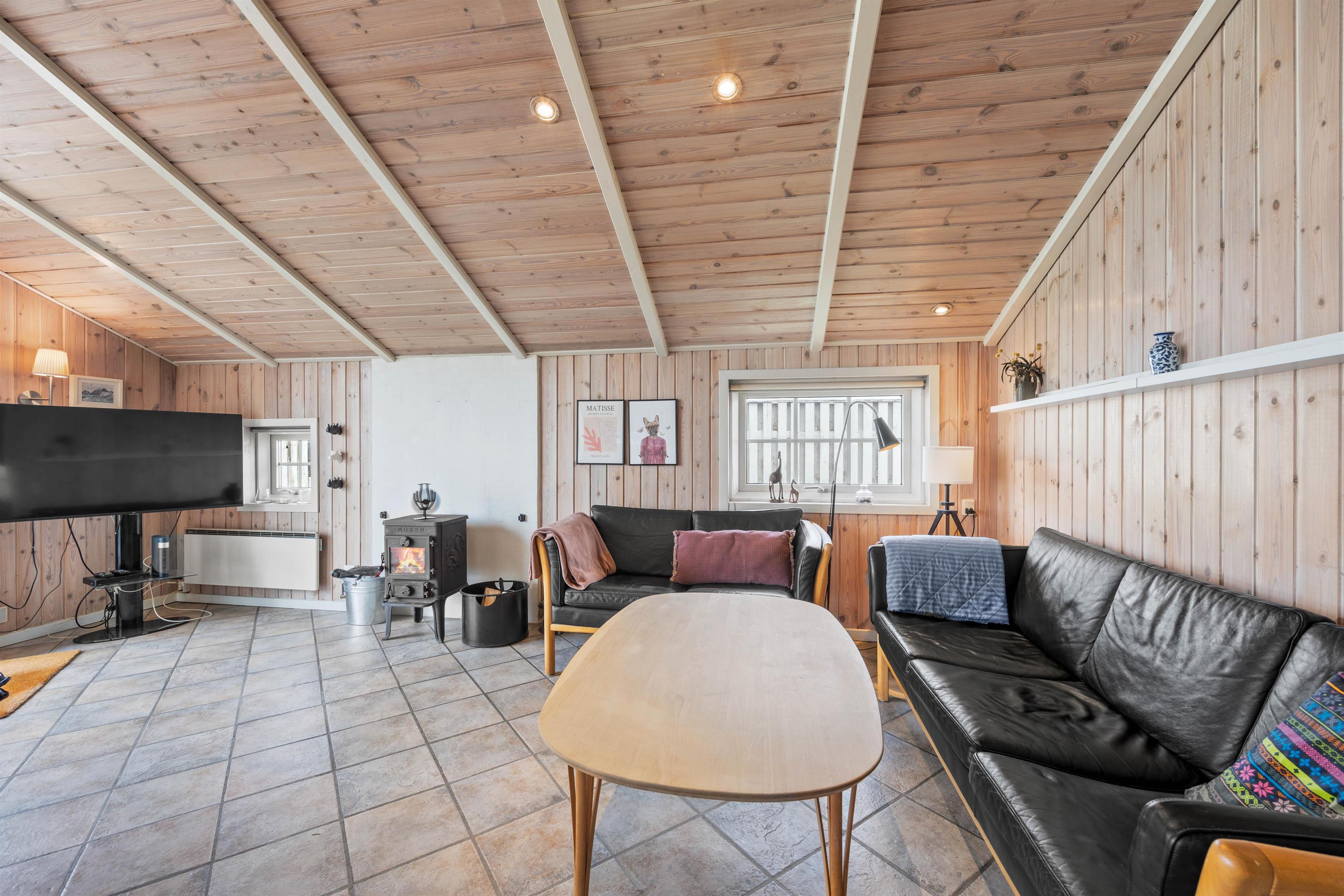 I stuen kan I hygge jer sammen foran ilden i brændeovnen. Se en film sammen, eller måske er det tid til at læse en god bog igen? Her kan alle hygge sig sammen og alligevel individuelt. Ved spisebordet er der plads nok til at spille et brætspil eller lave krea-ting sammen. Køkkenet har alt, hvad I behøver for at forkæle hinanden med lækre hjemmelavede retter. Den omkostnings- og energibesparende varmepumpe sørger for behagelige temperaturer i sommerhuset.