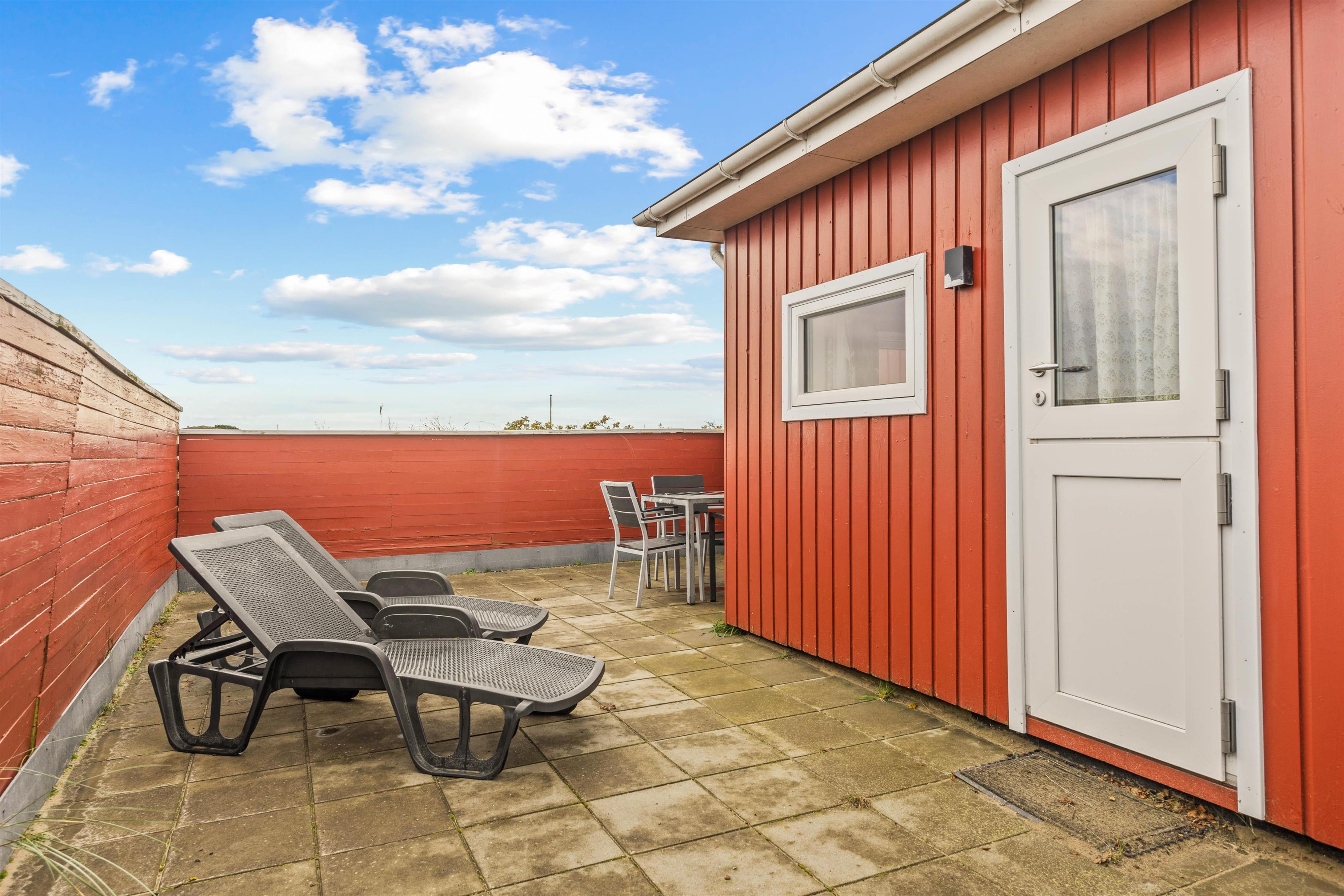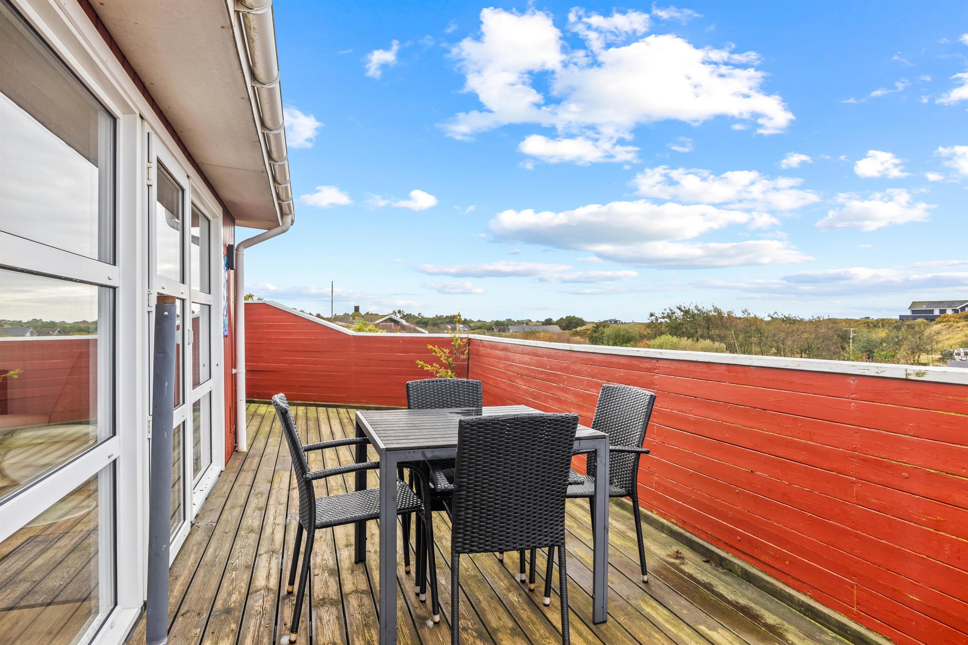 Det åbne- og det lukkede afsnit af terrassen gør, at I kan slappe af i det fri, uanset vejret. Her kan I nyde et måltid omkring grillen med de komfortable havemøbler, mens I nyder panoramaudsigten. Herfra kan I være heldige at se drageflyvning på solrige dage. Området omkring sommerhuset indbyder til lange gåture i den friske luft, hvor der er rig mulighed for at udforske de naturskønne omgivelser. Med kun 500 meter til Vesterhavet, kan I nyde solnedgangen hver eneste aften.