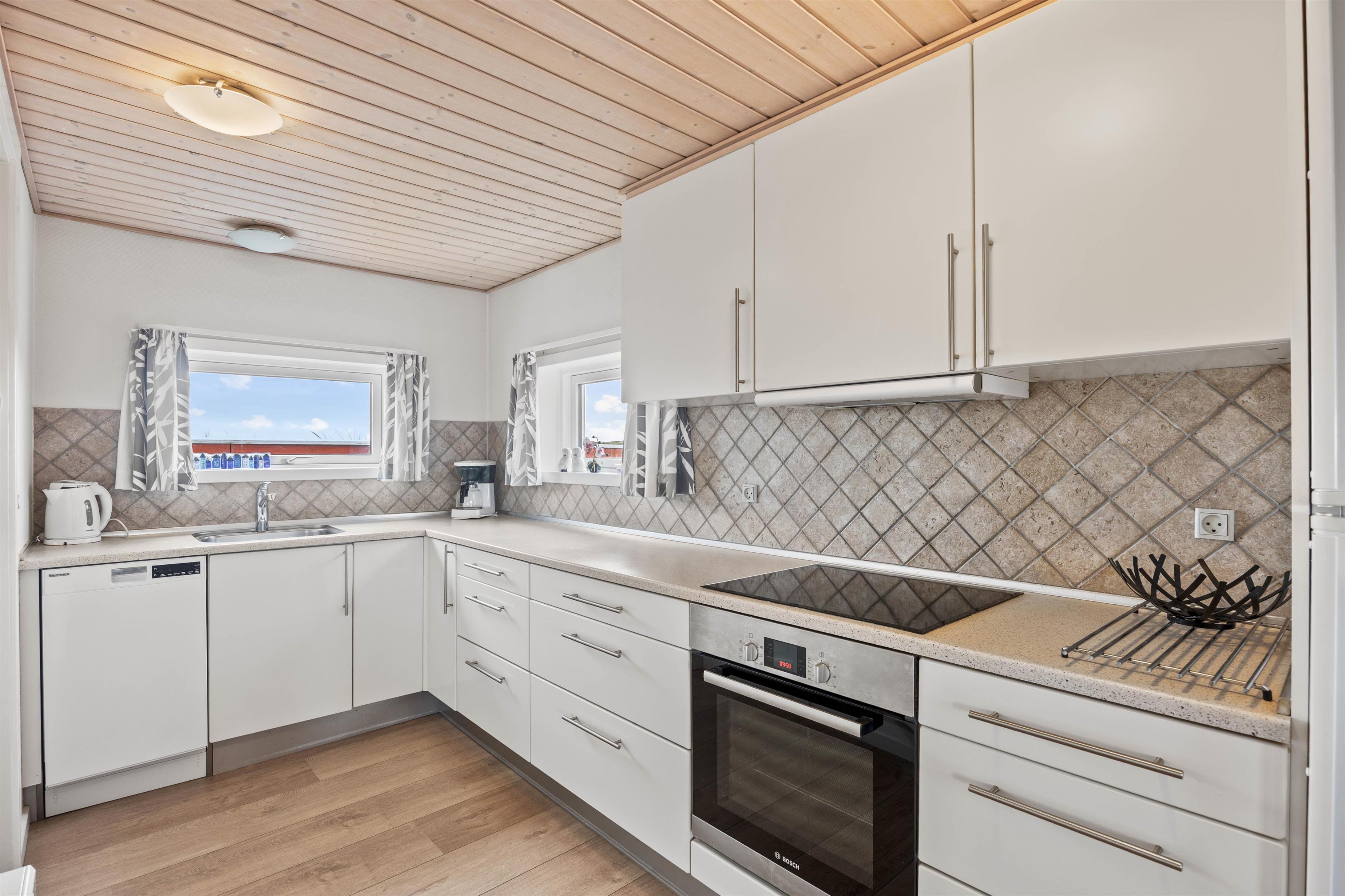 I stuen finder I den hyggelige brændeovn, som skaber en stemningsfuld atmosfære på de kølige aftener, mens luft-til-luft varmepumpen sikrer en behagelig temperatur året rundt. Køkkenet indeholder alt, hvad I skal bruge for at tilberede lækre hjemmelavede måltider, herunder induktionskomfur og opvaskemaskine. Badeværelset har gulvvarme, og der er både vaskemaskine og tørretumbler til jeres rådighed, så I kan opfriske garderoben i løbet af ferien.