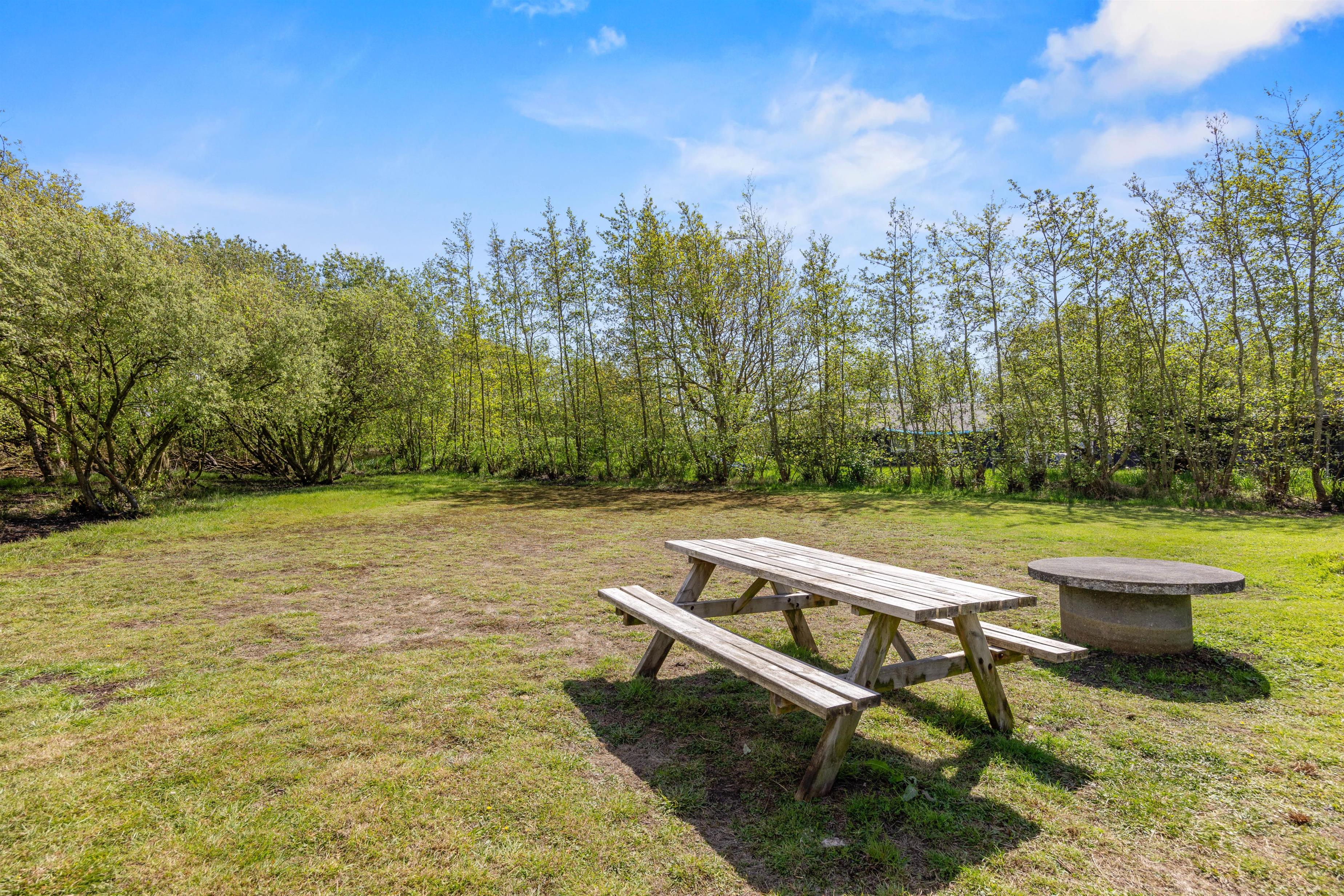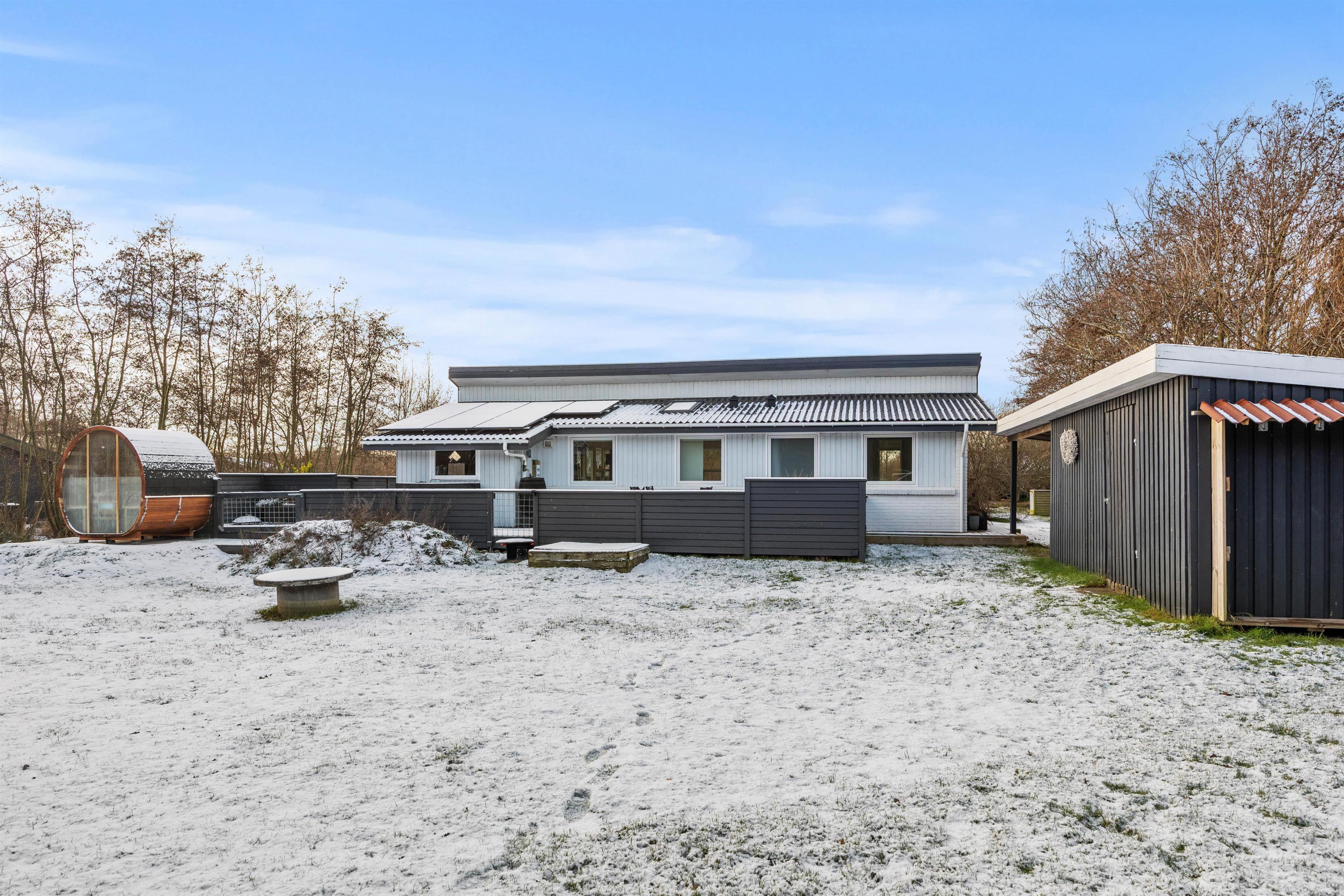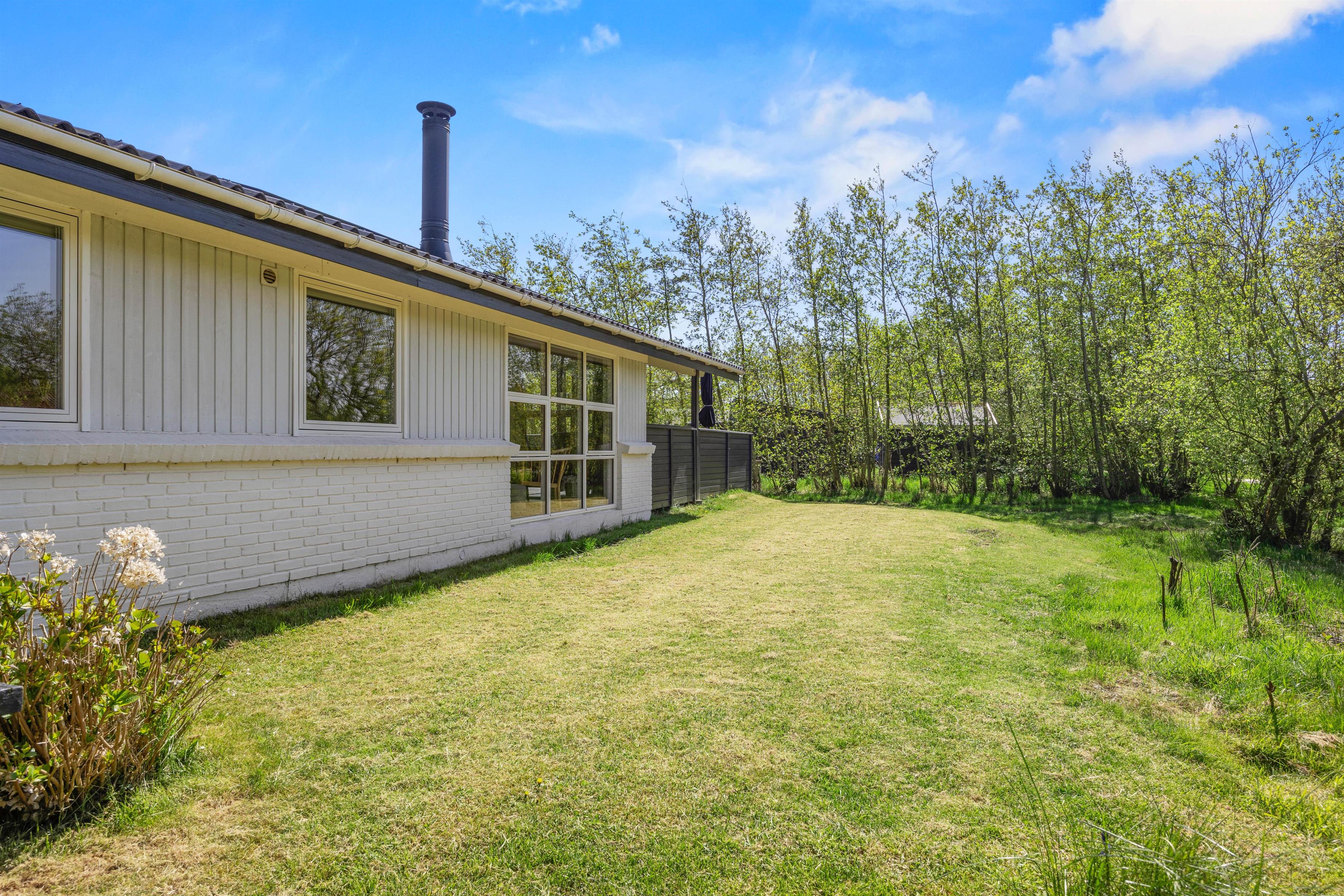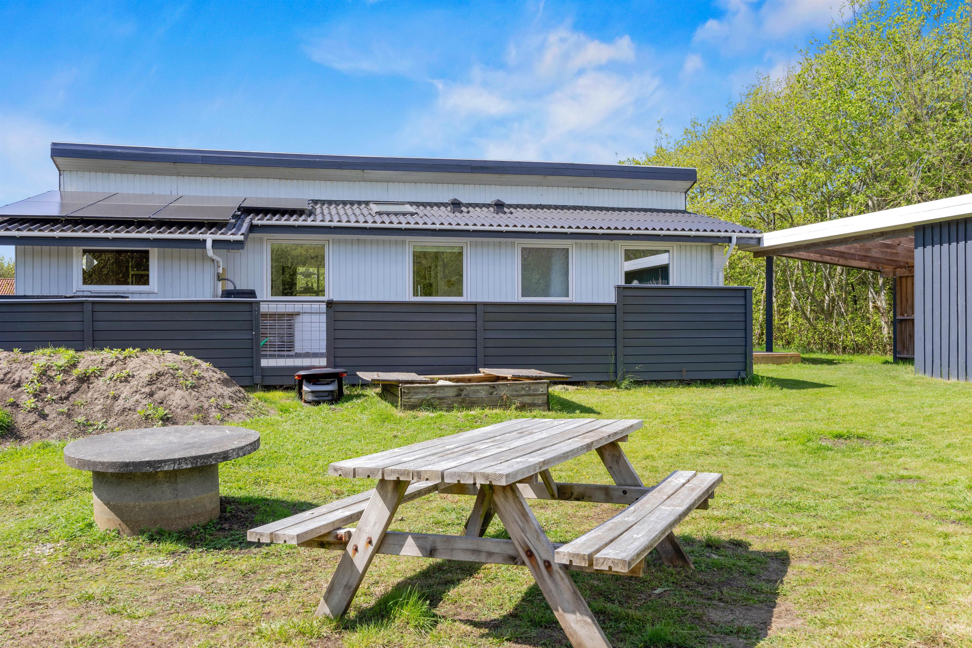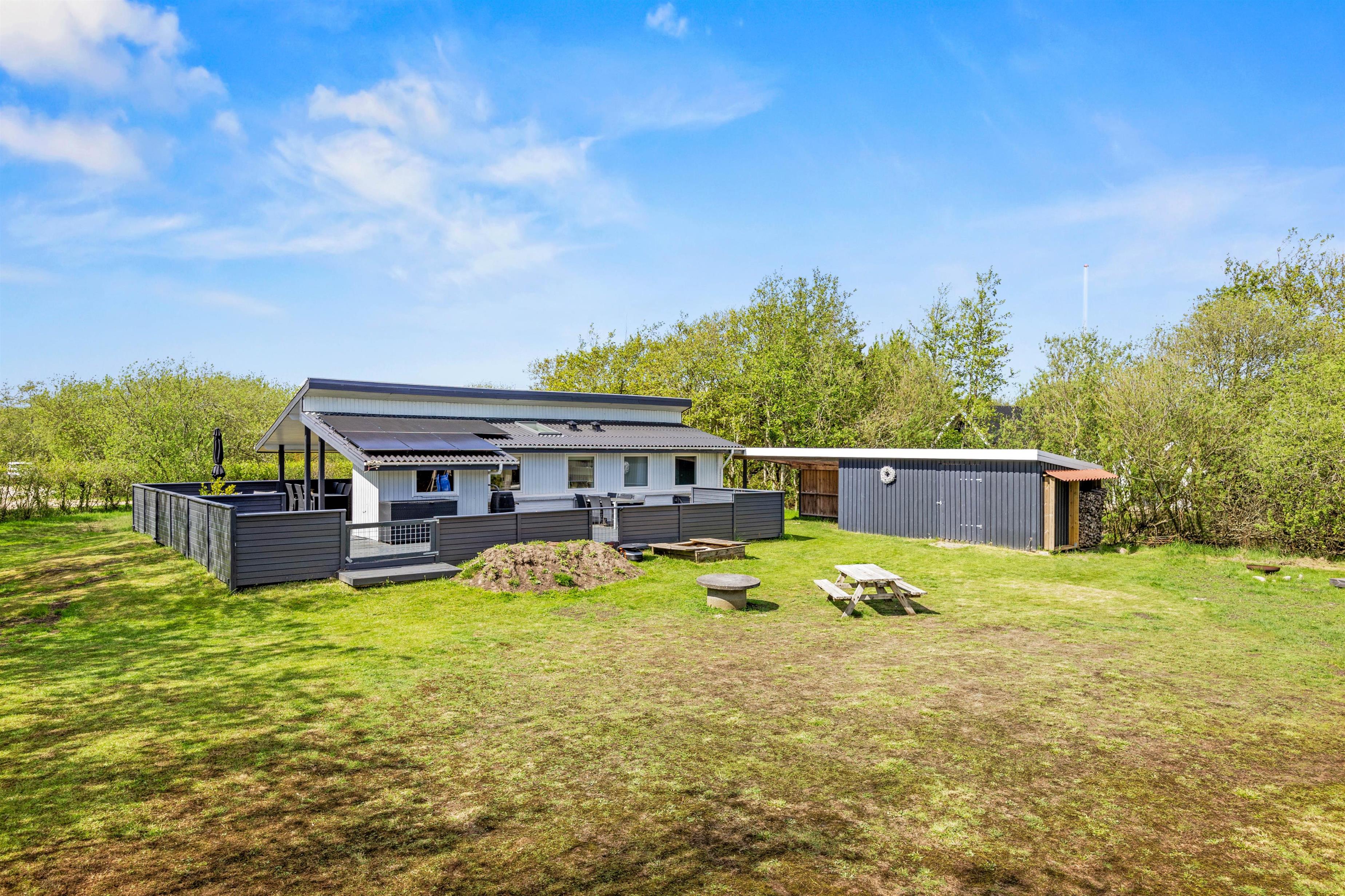 Feriehuset ligger idyllisk på en plænegrund på godt 1800 kvadratmeter. På den rummelige terrasse, som er delvist overdækket og fuldt indhegnet, finder du komfortable havemøbler og liggestole, hvor du kan slappe af, og som noget nyt: En skøn udesauna. Børnene kan lege på græsplænen, bage sandkager i sandkassen eller gynge på gyngerne.