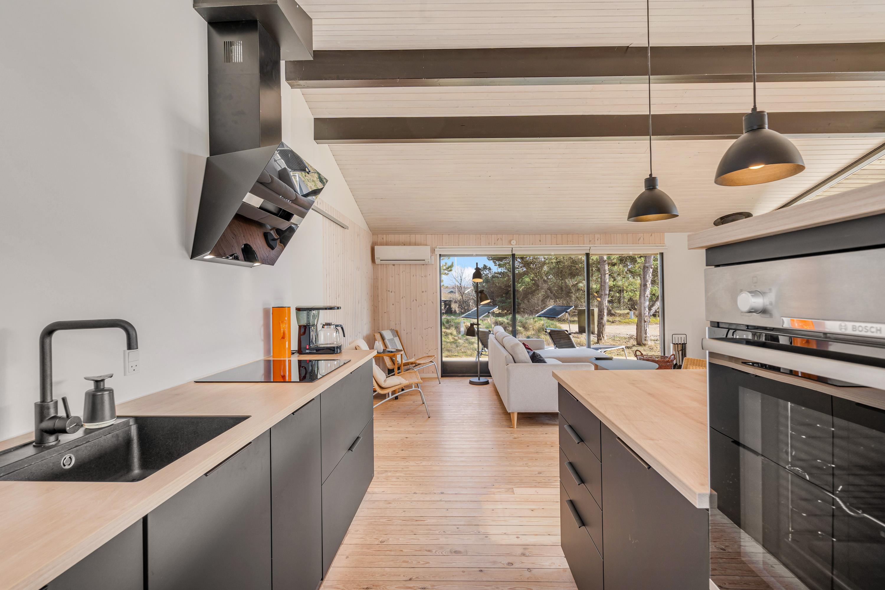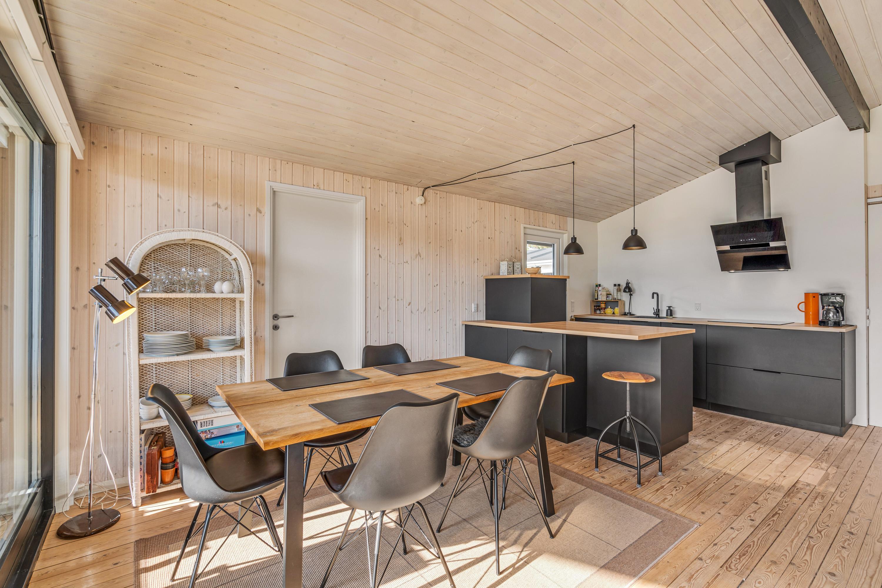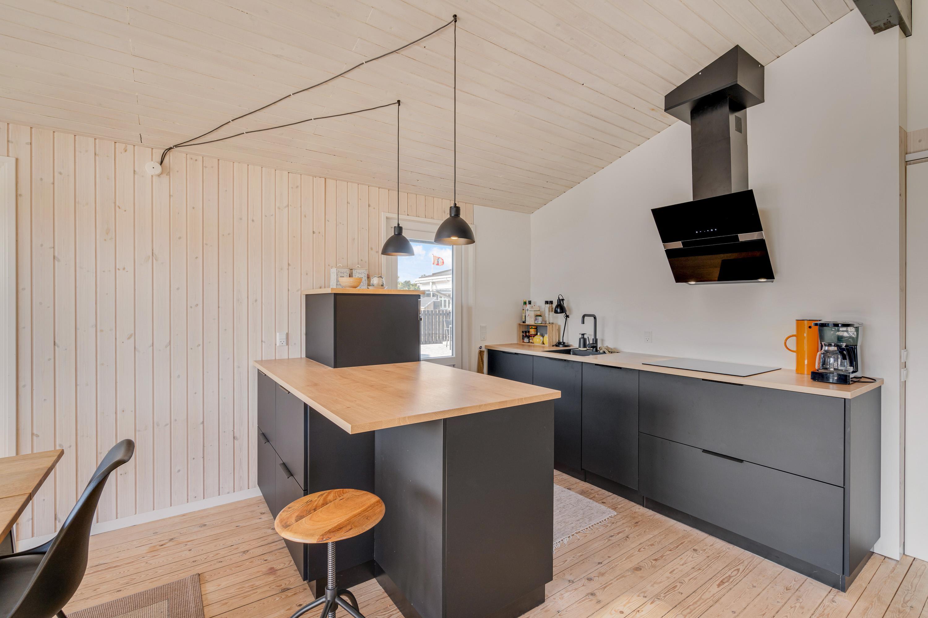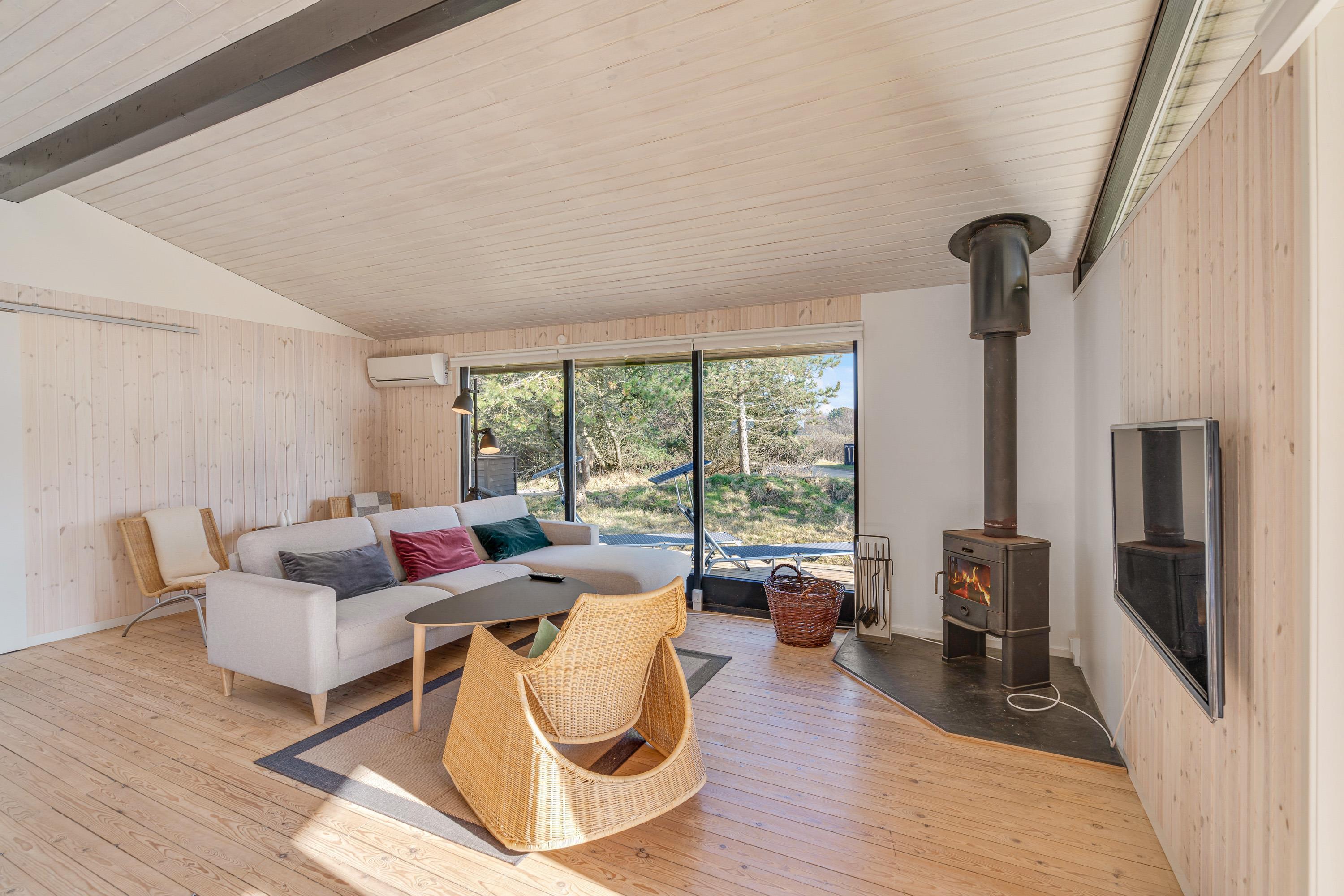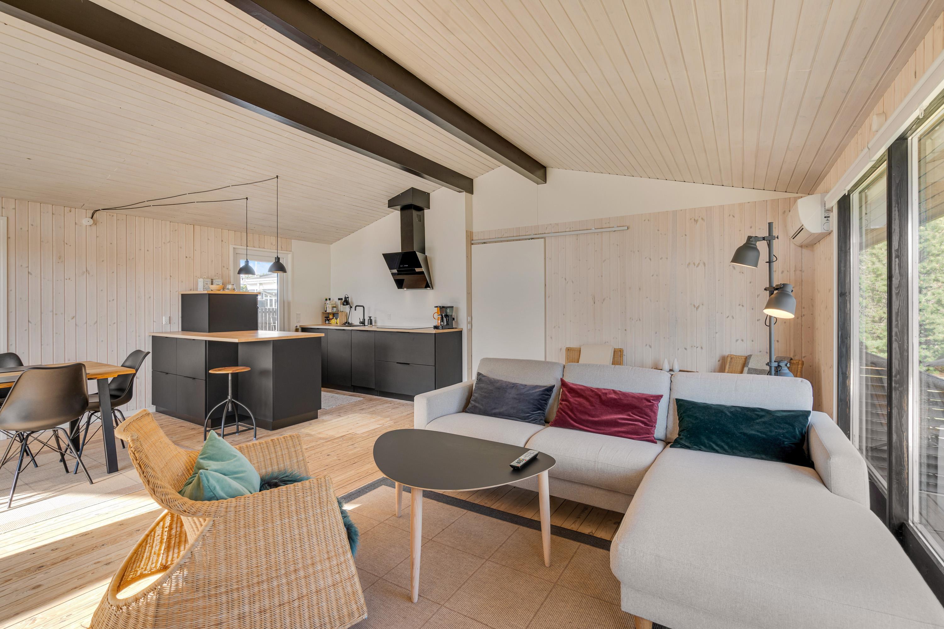 Fordelt på de i alt 78 m2 får I her masser af plads til den lille familie. Det lyse opholdsrum indbyder til hyggestunder for hele familien, mens brændeovnen sørger for den rette feriestemning. Læn jer tilbage i de komfortable møbler og nyd hinandens selskab i brændeovnens skær, mens den beroligende knitren fylder rummet. Alternativt kan I benytte varmepumpen, der sørger for hurtig, effektiv og energibesparende opvarmning.