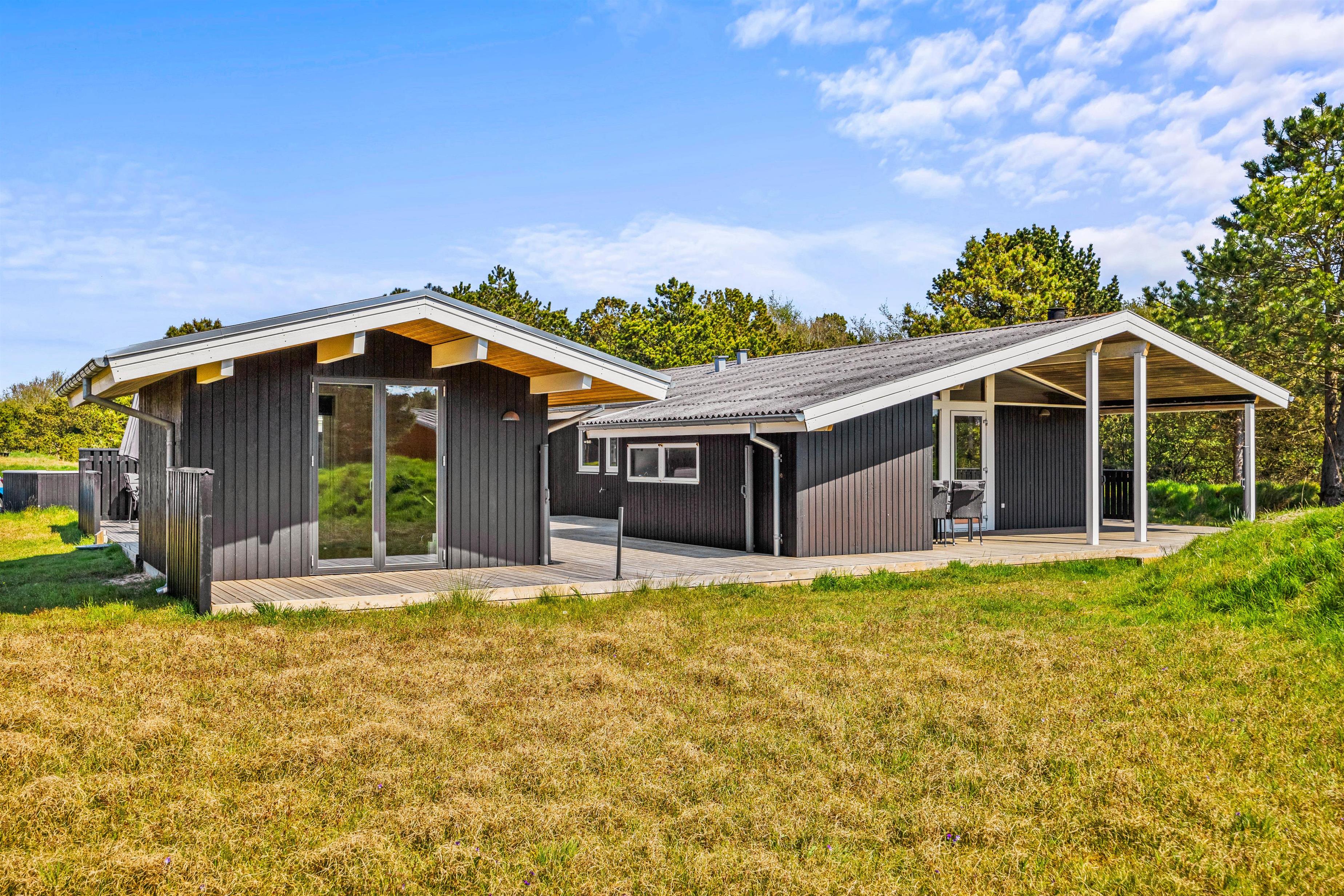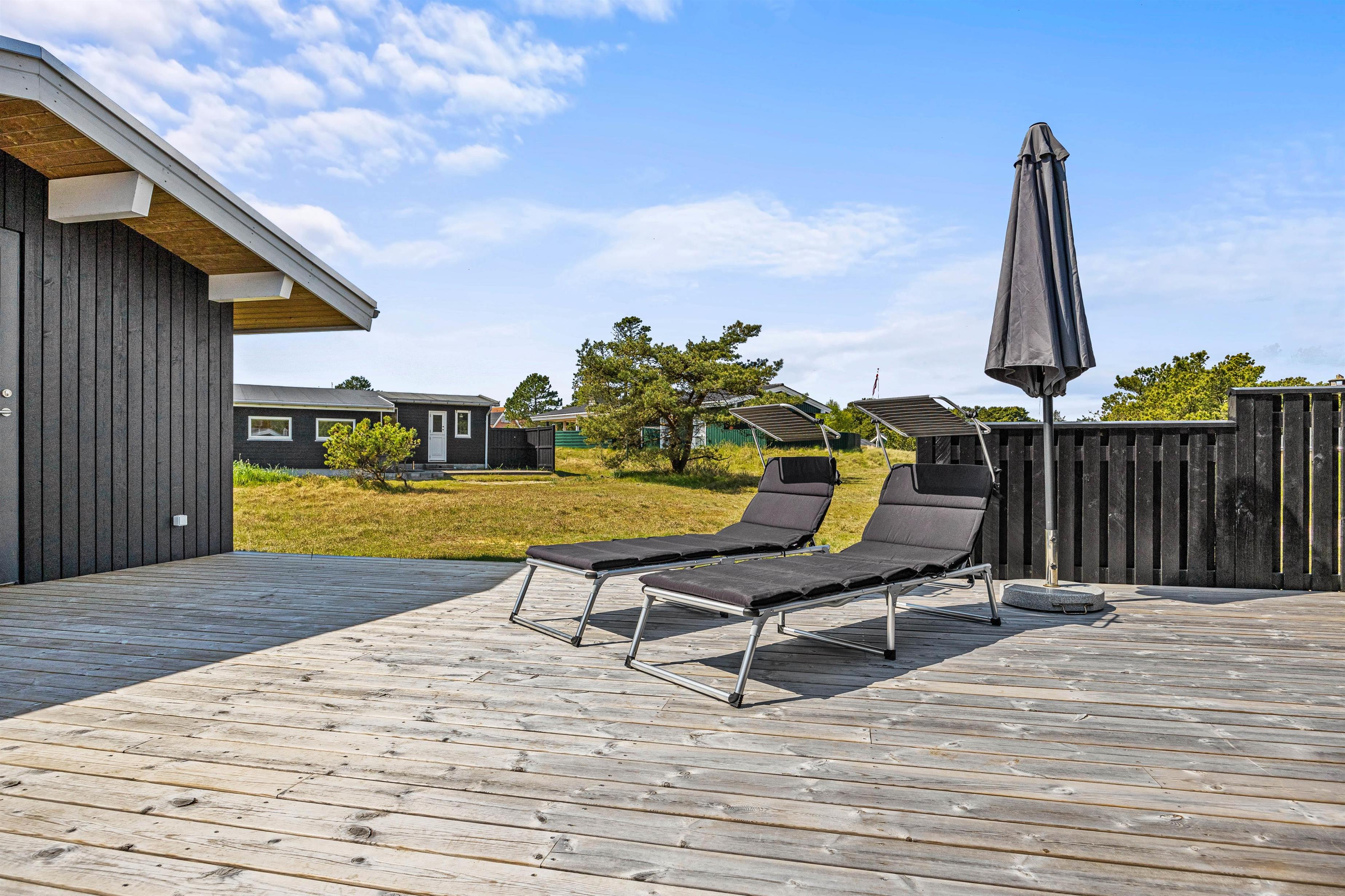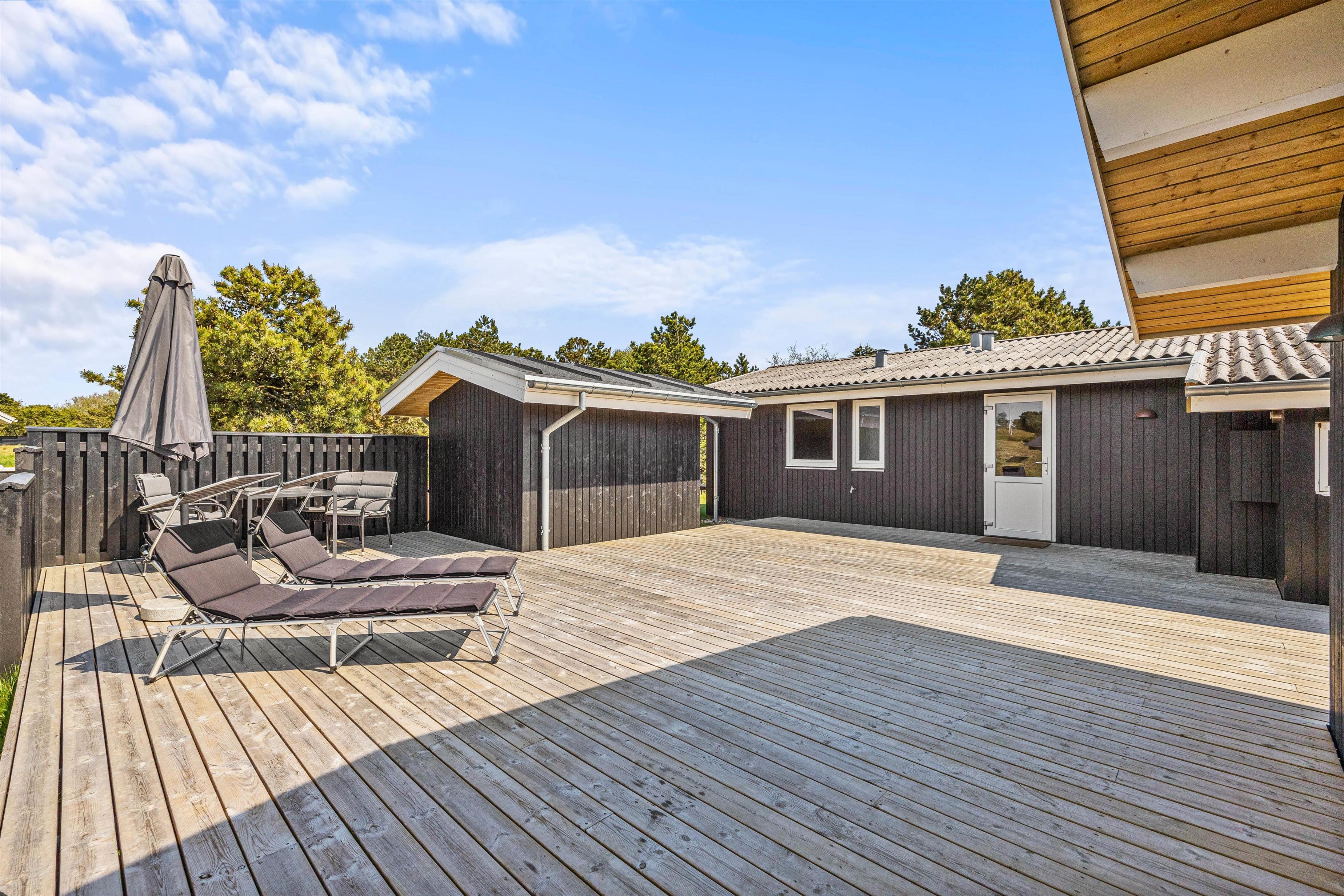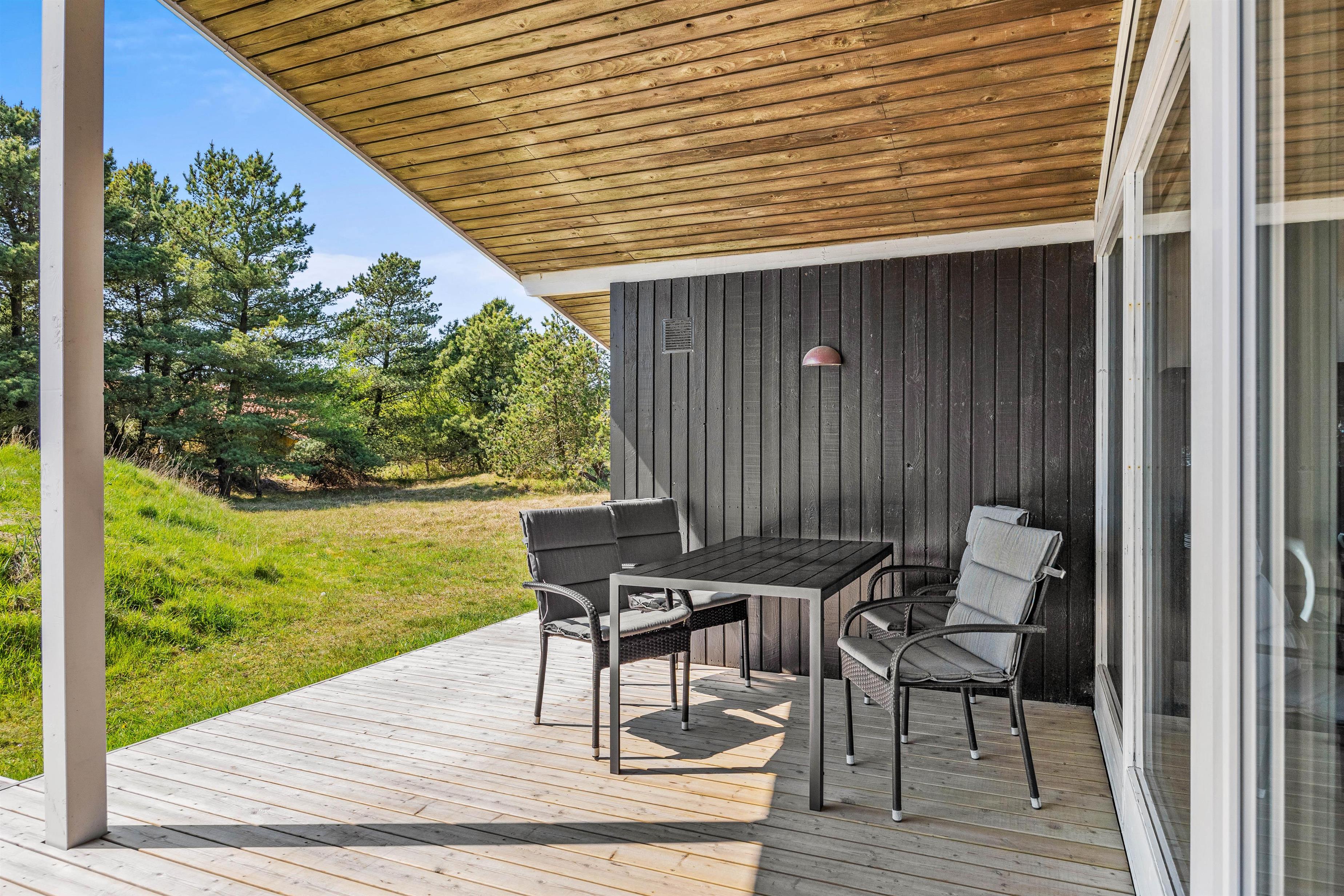 Udeområdet i dette feriehus er blevet renoveret og redesignet i 2021. Den flotte terrasse, der både er åben og delvist overdækket, omkranser smukt feriehuset og indbyder til solrige dage med afslapning og frisk luft. I sommerhalvåret bliver feriehuset derved udvidet med et ekstra opholdsområde, da terrassen er udstyret med pæne havemøbler, liggestole og en grill, hvorfra I kan nyde aftensmad.