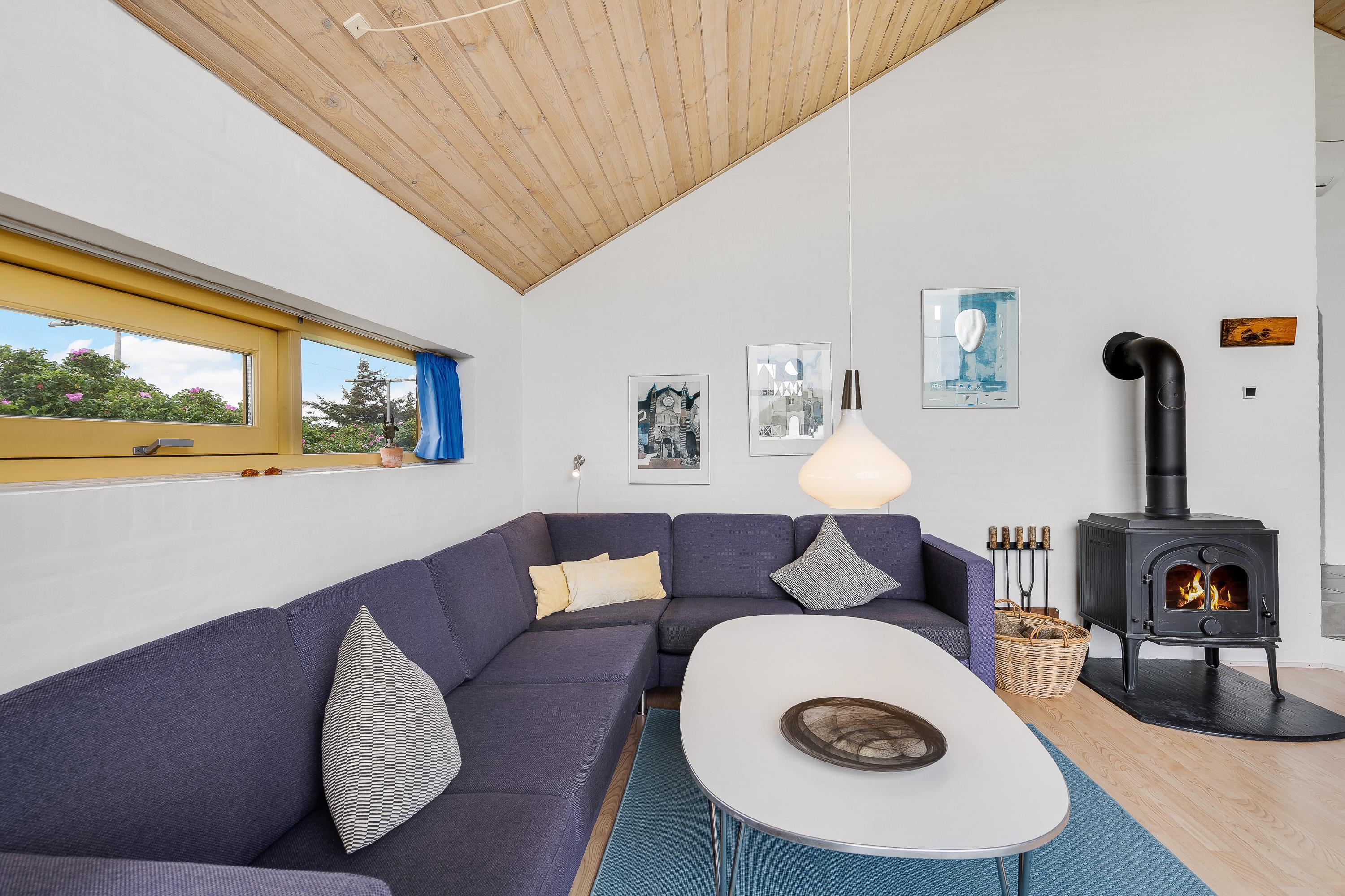 Sommerhuset er indrettet i typisk skandinavisk ”hygge”-stil. Opholdsrummet består af et veludstyret køkken i åben forbindelse til spiseplads samt stue, der er i forskudt niveau. Stuen er indrettet med komfortable møbler og en brændeovn, så I her kan læne jer tilbage efter en lang feriedag fuld af aktiviteter, og streame en god film på sommerhusets Chromecast.