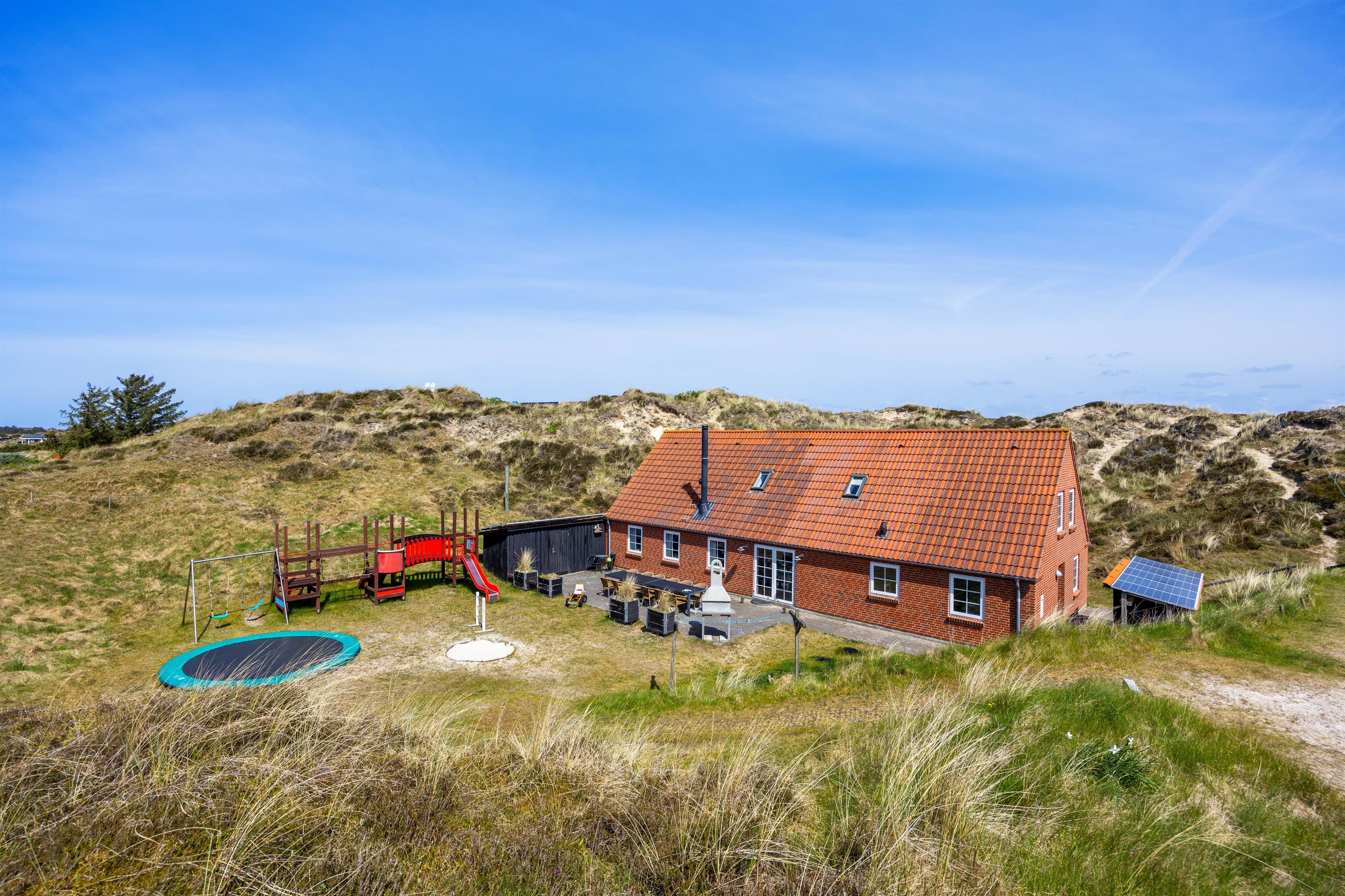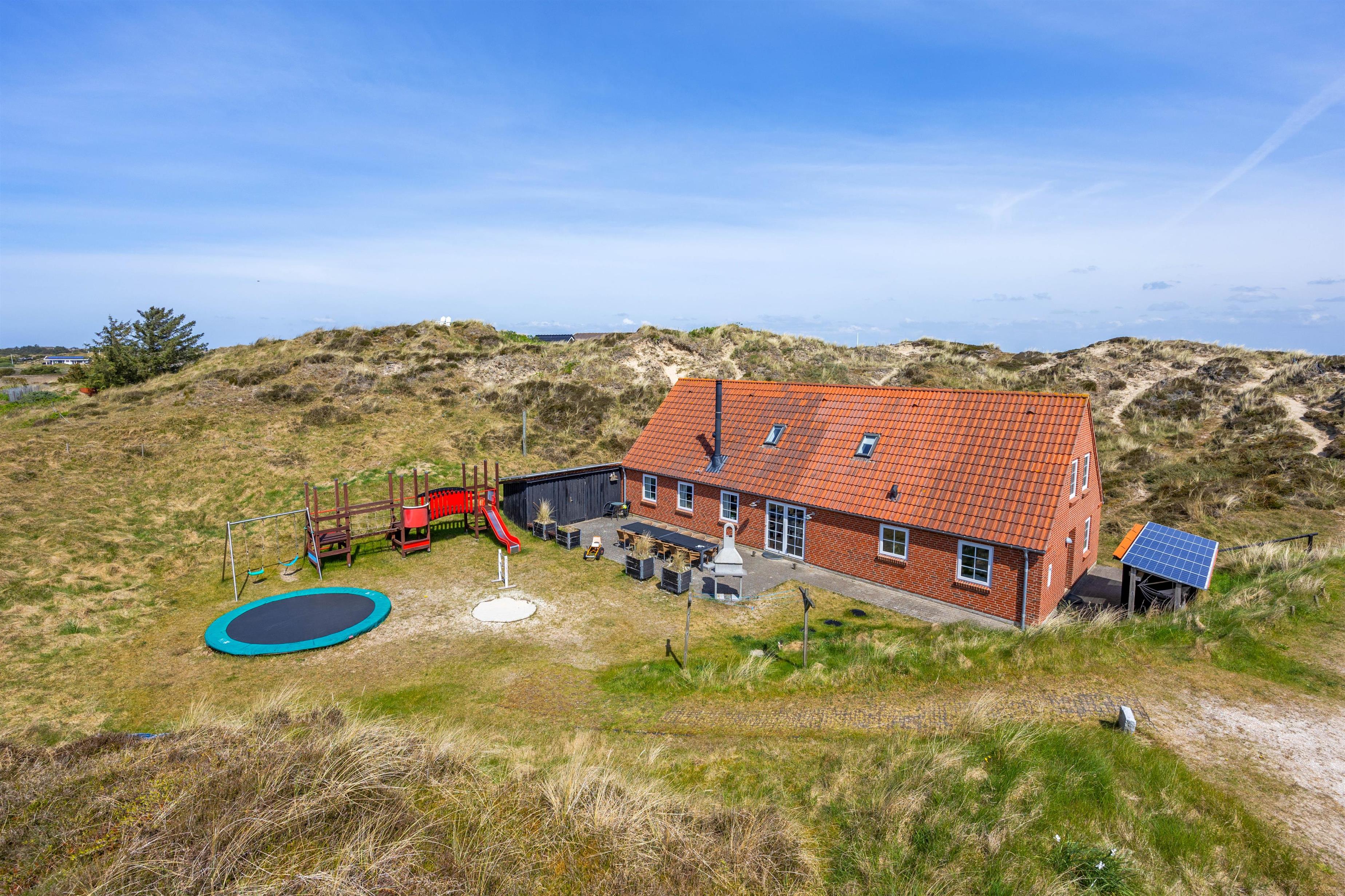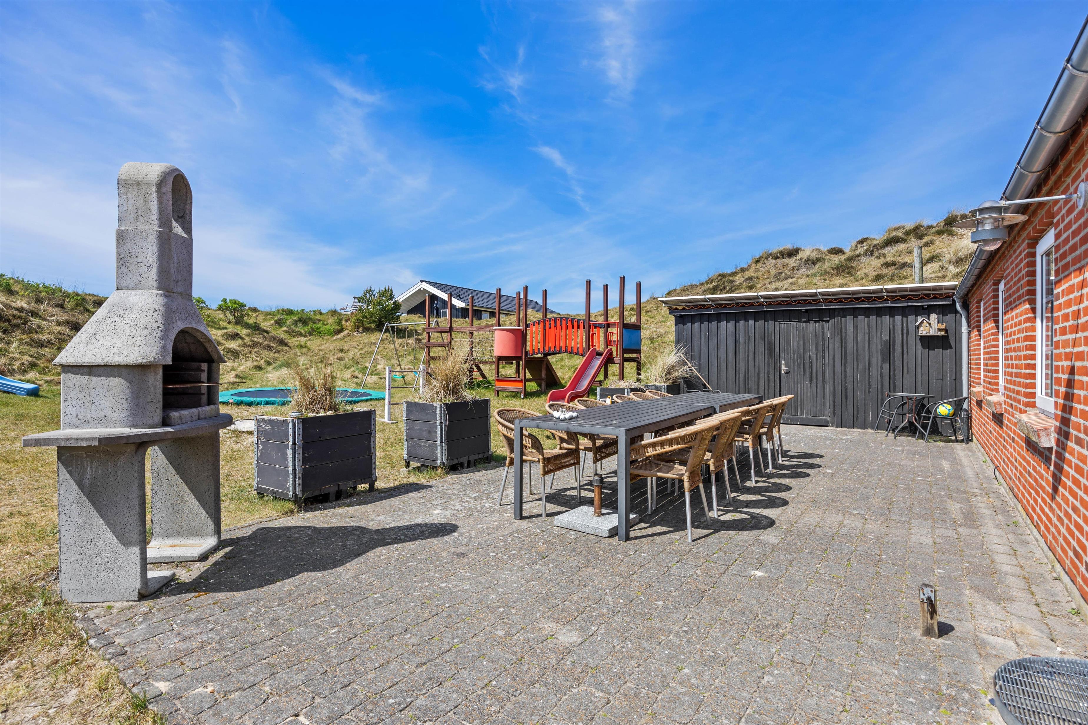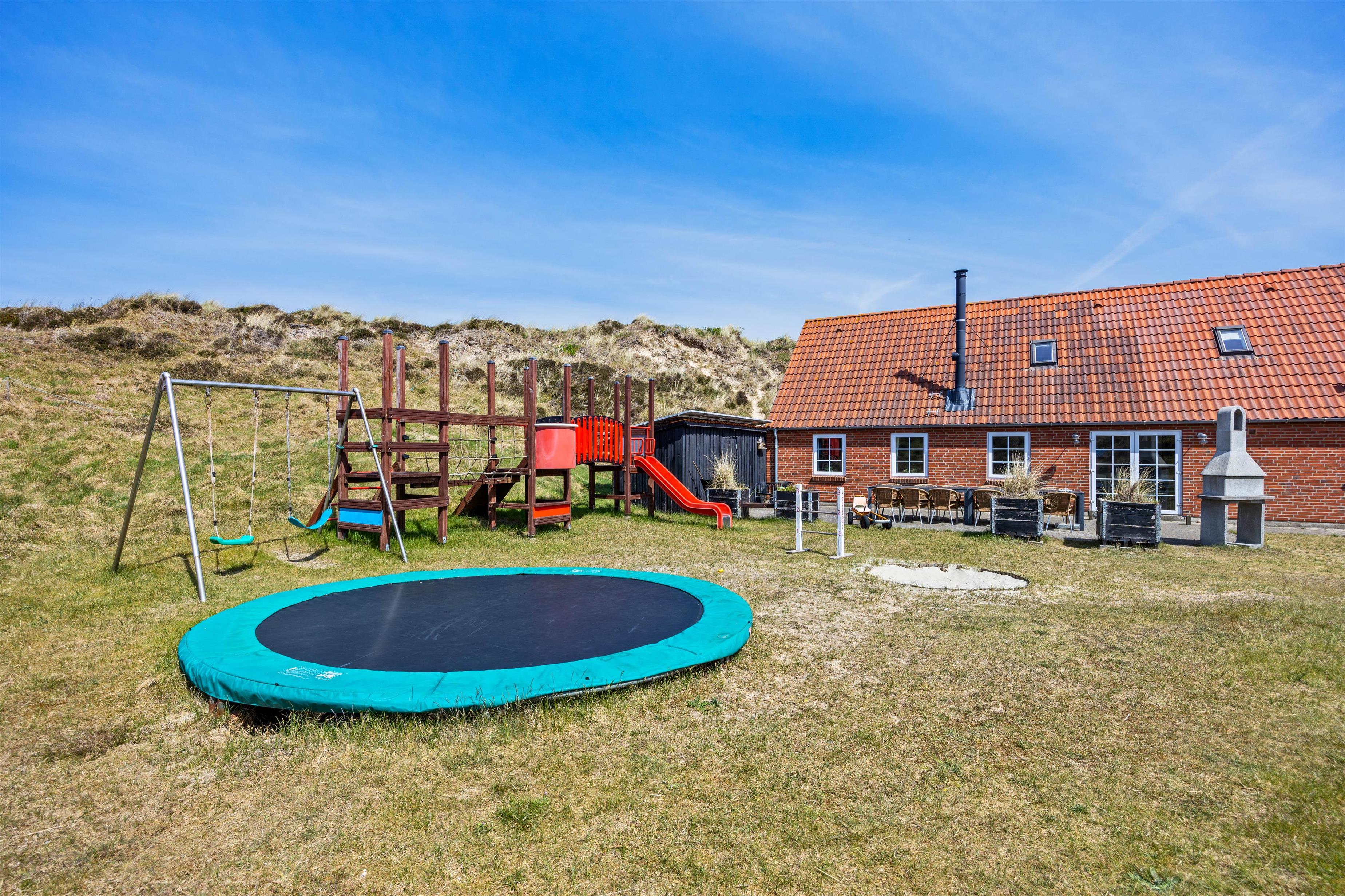 Fra stuen er der direkte adgang til den afskærmede terrasse og have, som er omgivet af det smukke, vilde klitlandskab. Her kan I nyde middagssolen med en god bog, slikke sol og holde nogle dejlige grillaftner. Mens de voksne slapper af med et koldt glas vin, kan ungerne give den gas i haven. Legetårn, rutsjebane, sandkasse, gynger og trampolin – her mangles ikke noget.