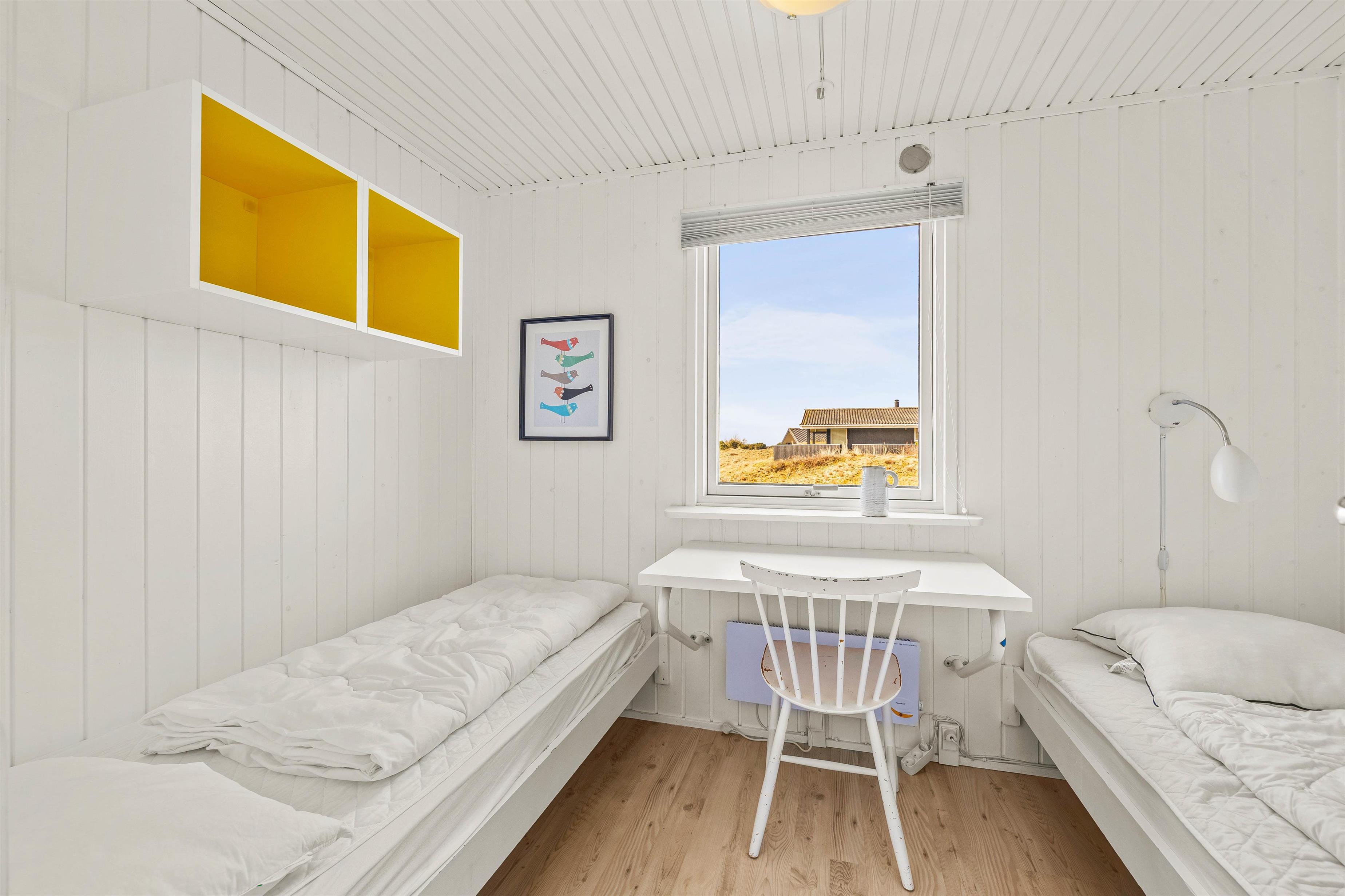 På Meldbjergvej 17 i Rindby finder I det hyggelige sommerhus, ideelt til en familieferie ved Vesterhavet. Beliggenheden på en klitgrund med kun 800 meter til stranden gør, at I kan nyde både stranden, Vesterhavet og den friske luft hver dag. Feriehuset er moderne udstyret med både induktionskomfur, vaskemaskine og en energibesparende varmepumpe, og slutrengøringen er inkluderet i prisen, så den behøver I heller ikke at bekymre jer om. NB Adgangsvejen er noget stejl, så den er ikke egnet til gangbesværede.
