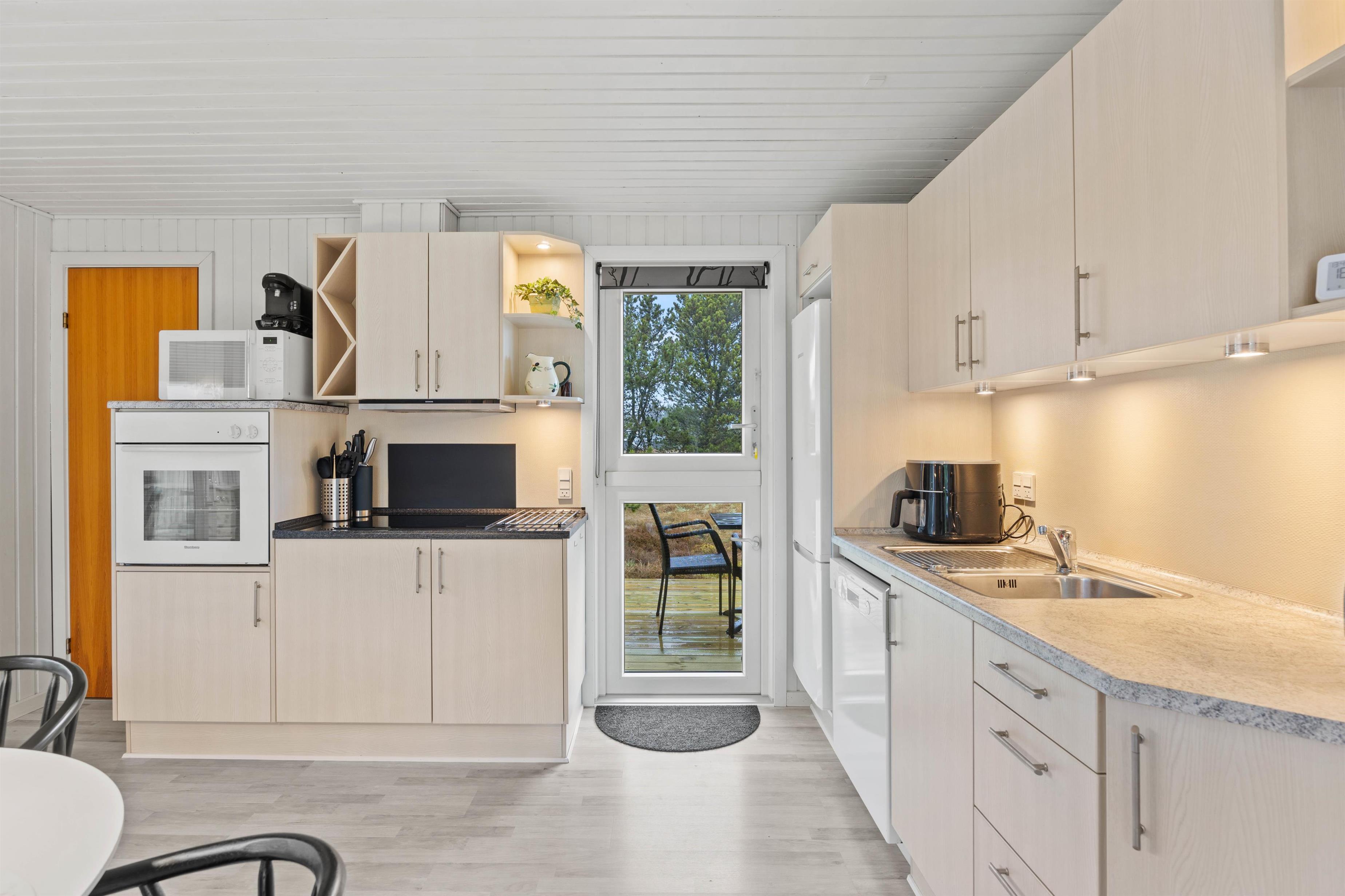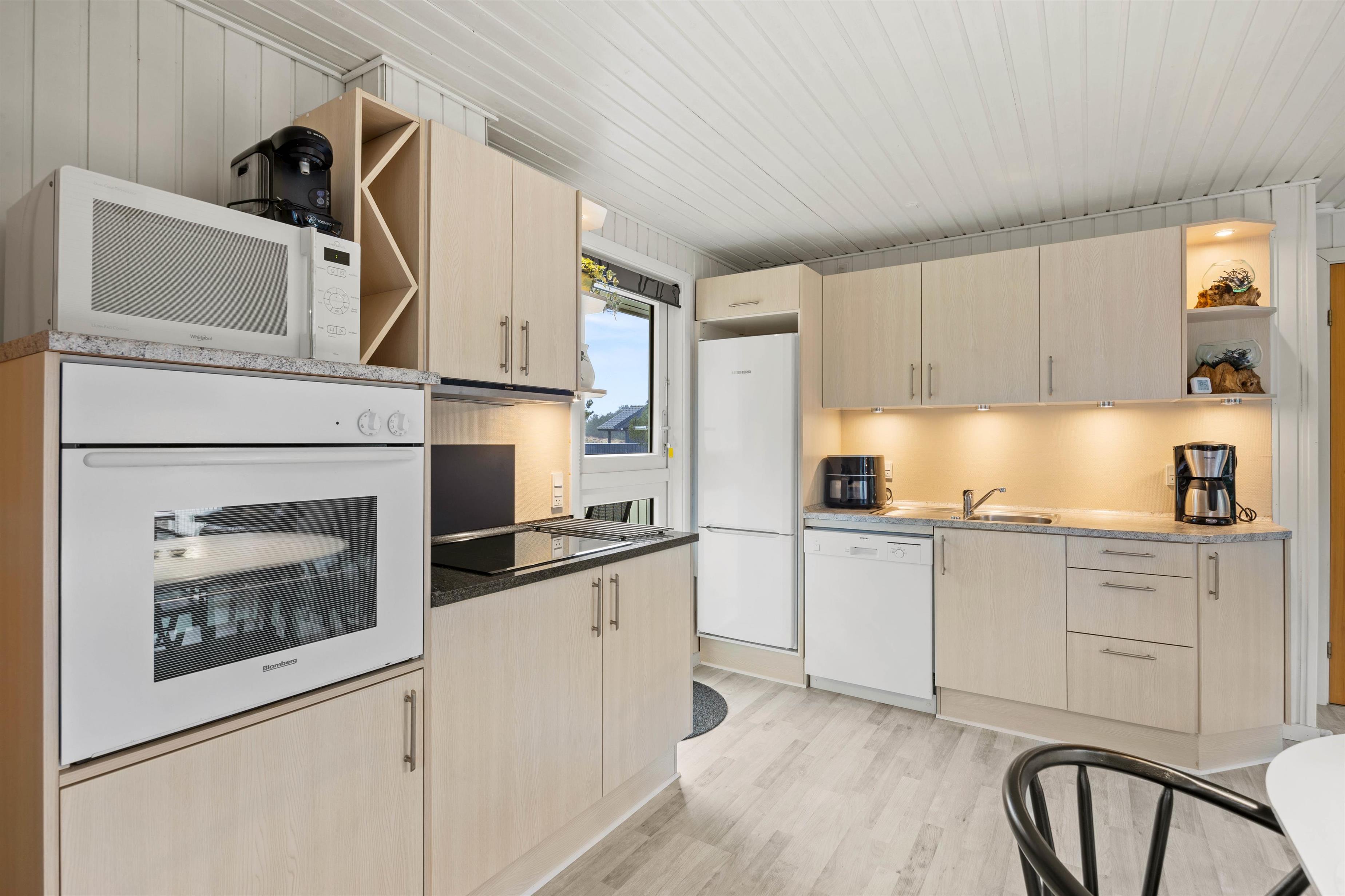 Sommerhuset er praktisk udstyret med gulvvarme på badeværelset, opvaskemaskine i køkkenet og ikke mindst en energibesparende varmepumpe i stuen. På denne måde er I sikret et behageligt indeklima året rundt! Der er solceller til feriehuset.