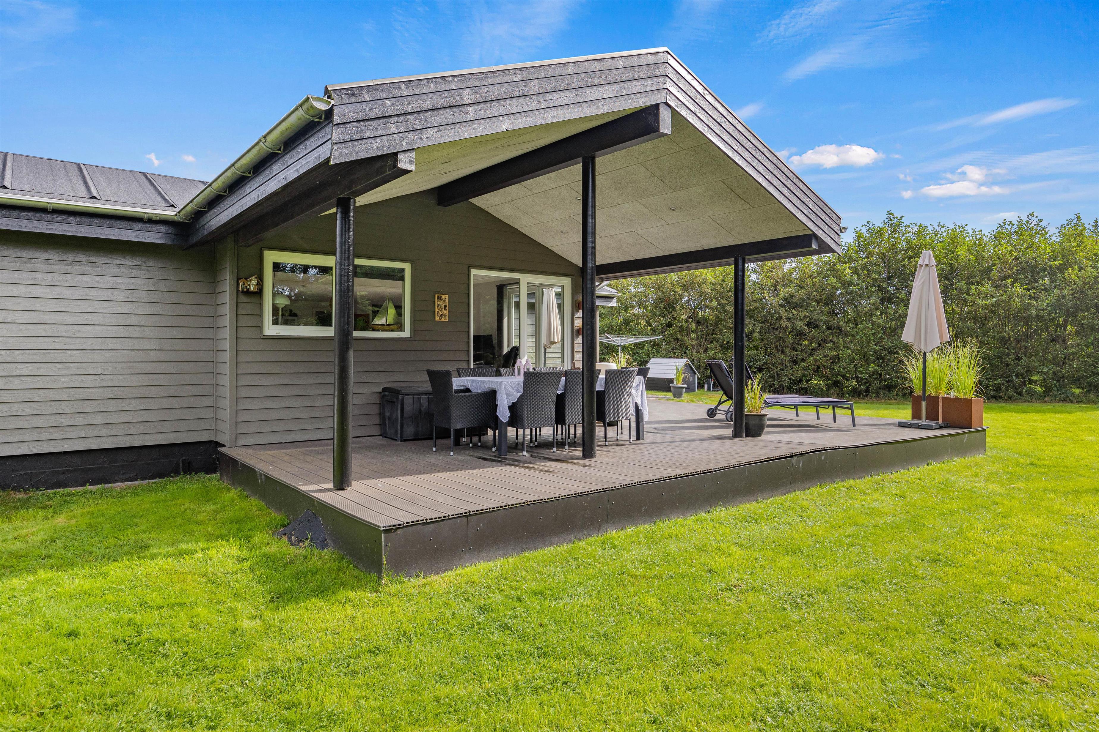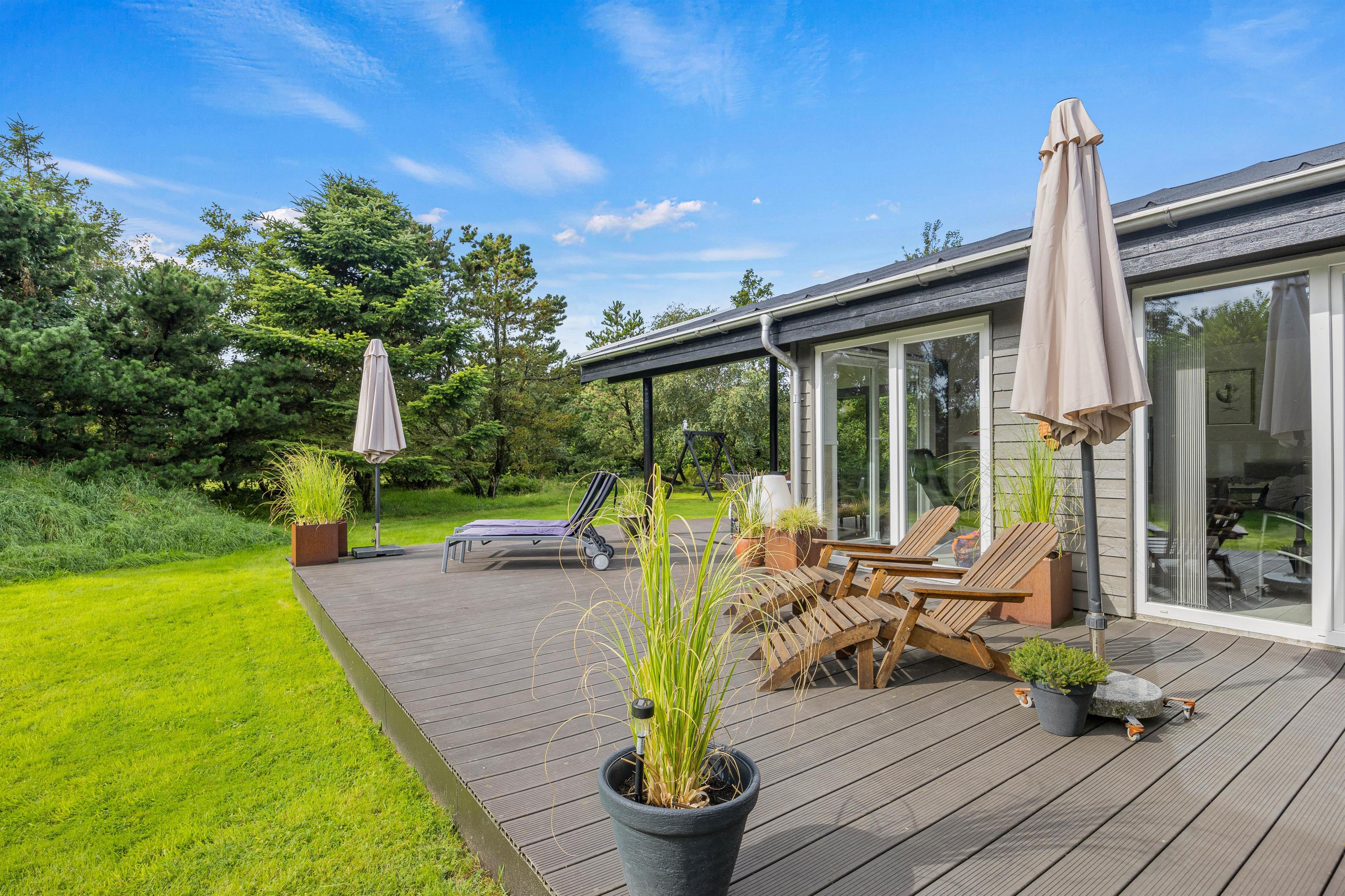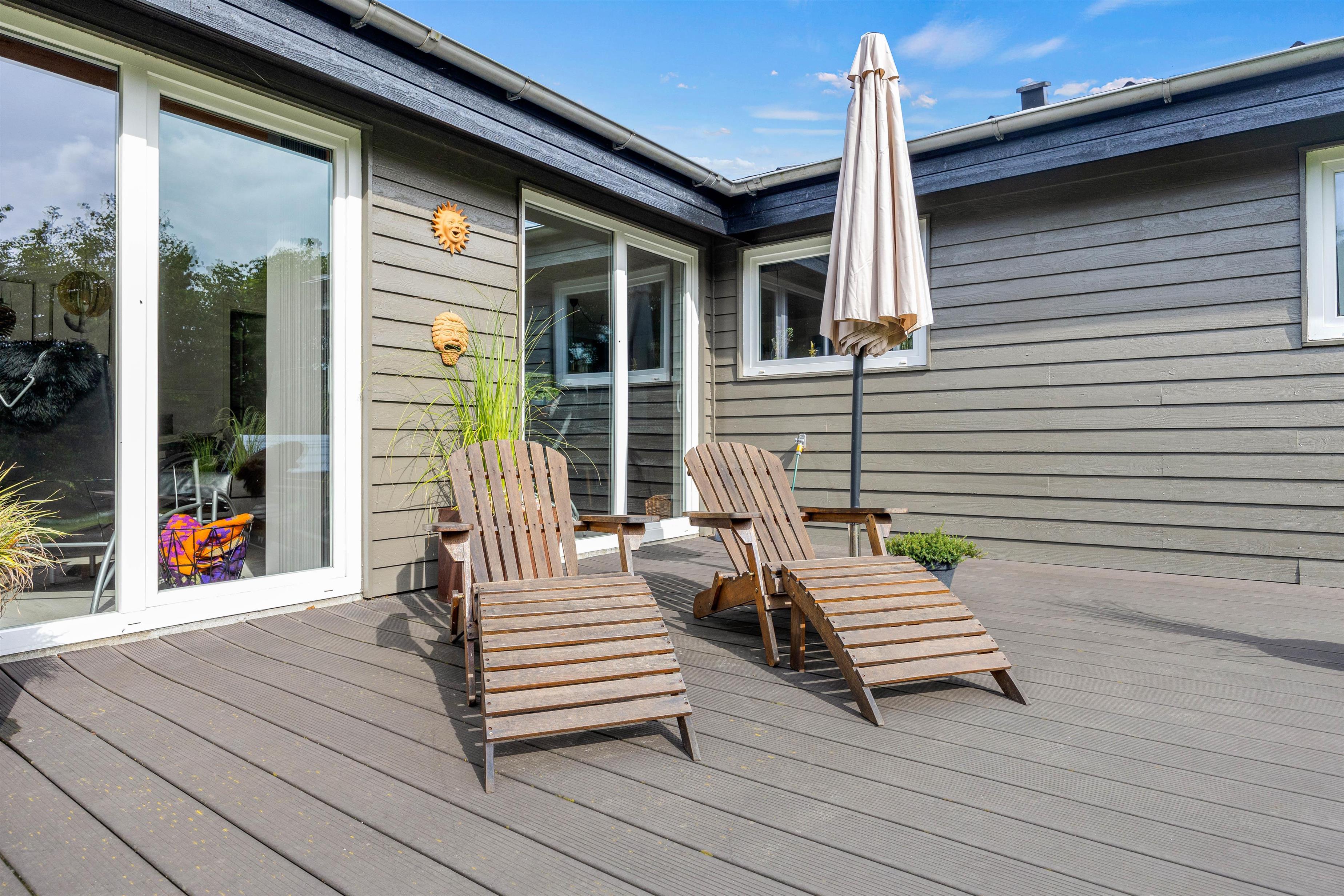 Den store indbydende træterrasse er det ideelle sted at nyde solrige dage på. Terrassen er sydvestvendt, og I kan derfor nyde solen hele dagen. Foretrækker I et skyggefuldt sted, er en del af terrassen overdækket, så I altid kan finde et godt sted at sidde uanset behov.