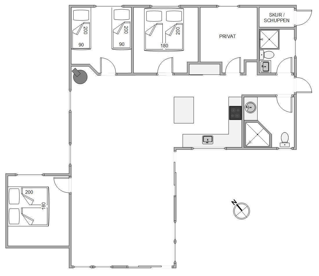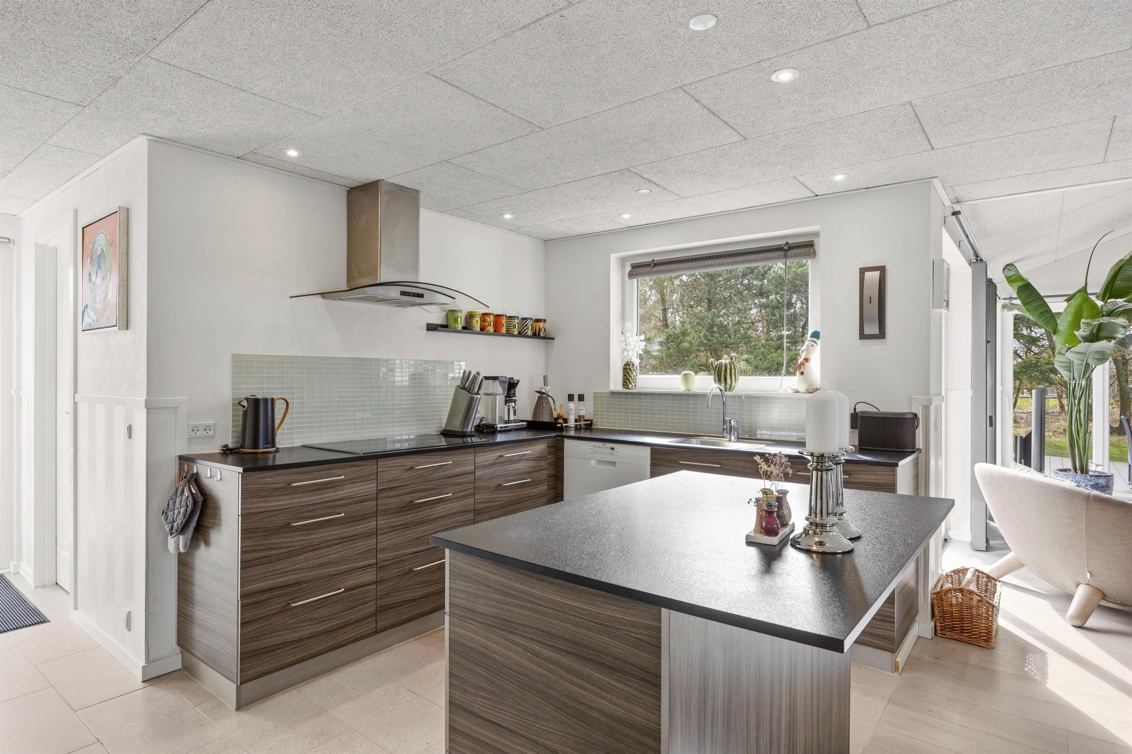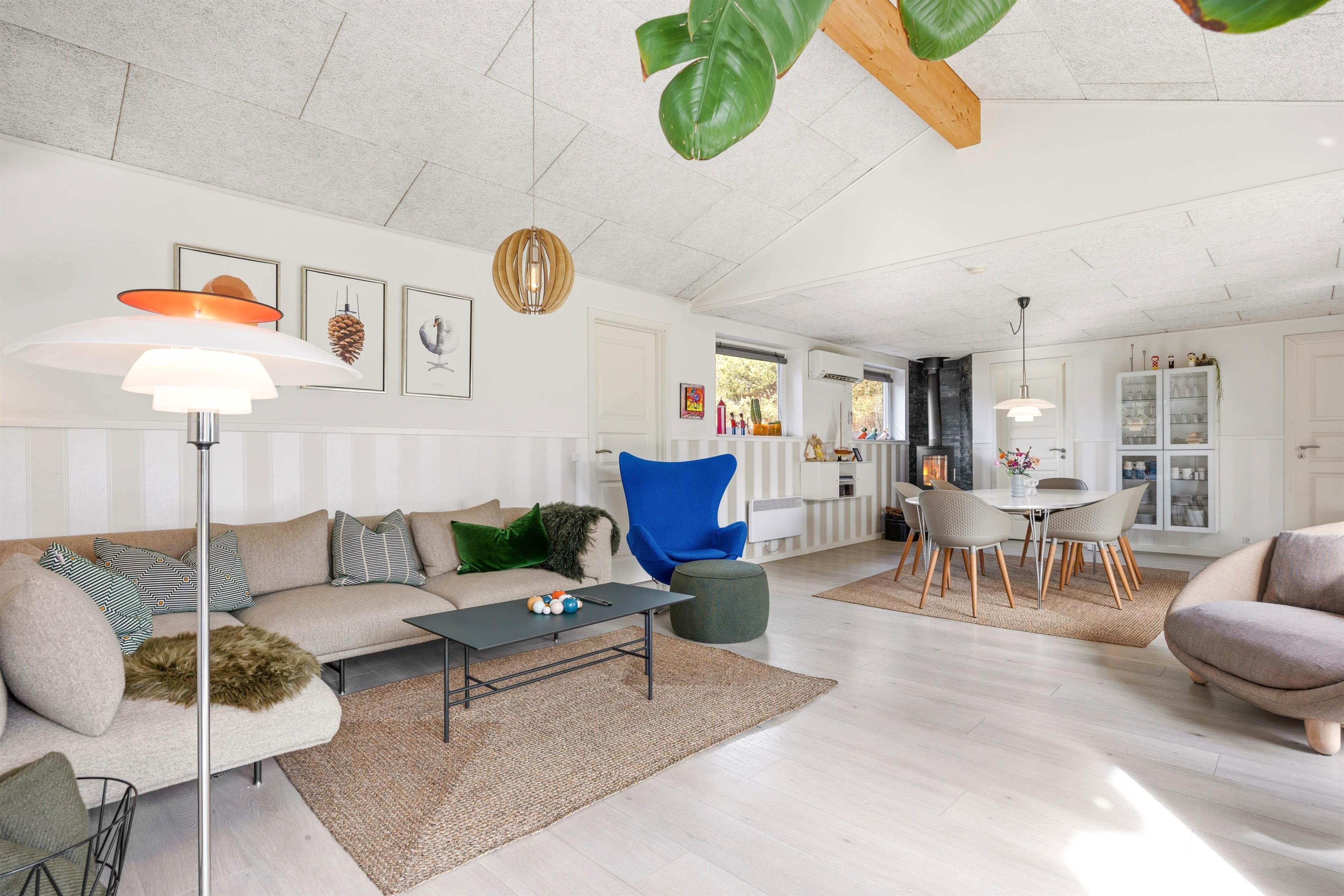 Feriehuset er indrettet således, at der er plads til hele familien. Det store opholdsrum med integreret køkken og spiseplads er moderne indrettet og er udstyret med en brændeovn, som sørger for hygge og varme. Alternativt kan I benytte den energibesparende varmepumpe, som hurtigt og effektivt varmer feriehuset op.