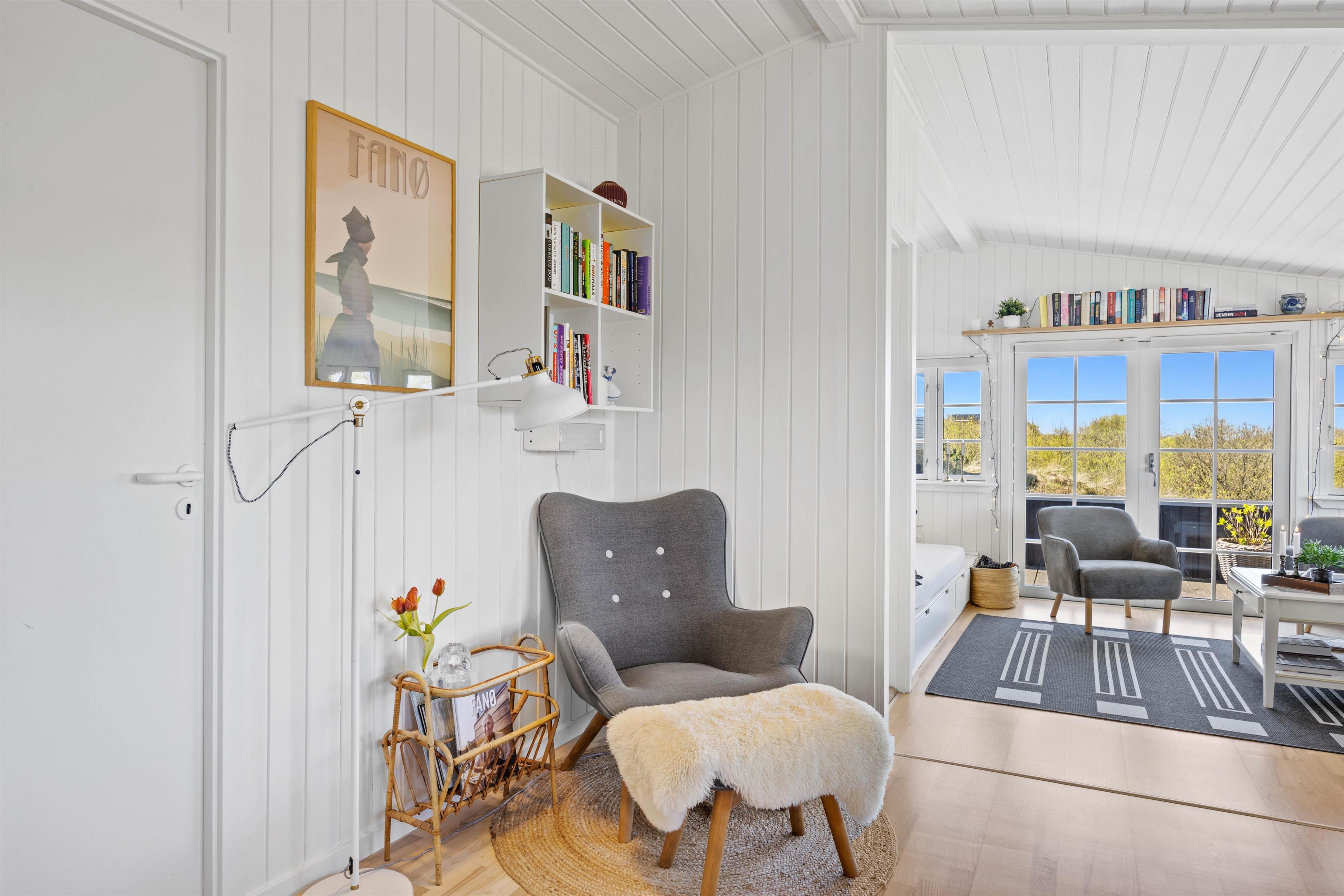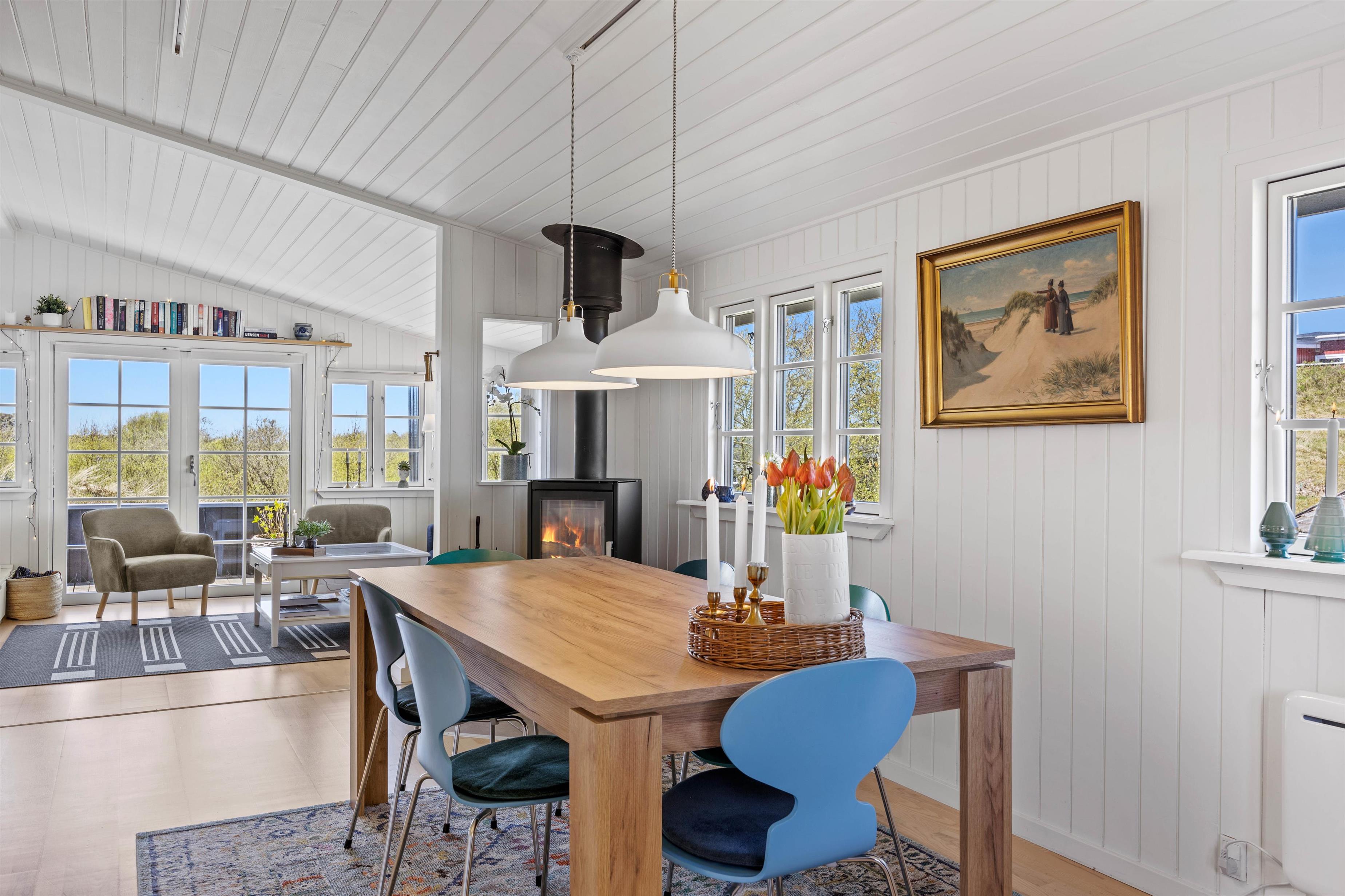 Når I træder ind i sommerhuset, vil I straks mærke den hyggelig stemning, der kendetegner en sommerhusferie. De lyse, træbeklædte vægge og lofter skaber en indbydende atmosfære, og de mange vinduer giver et skønt naturligt lys i det åbne opholdsrum. Uanset hvor I befinder jer i stuen, kan I altid nyde den smukke udsigt til naturen omkring jer.