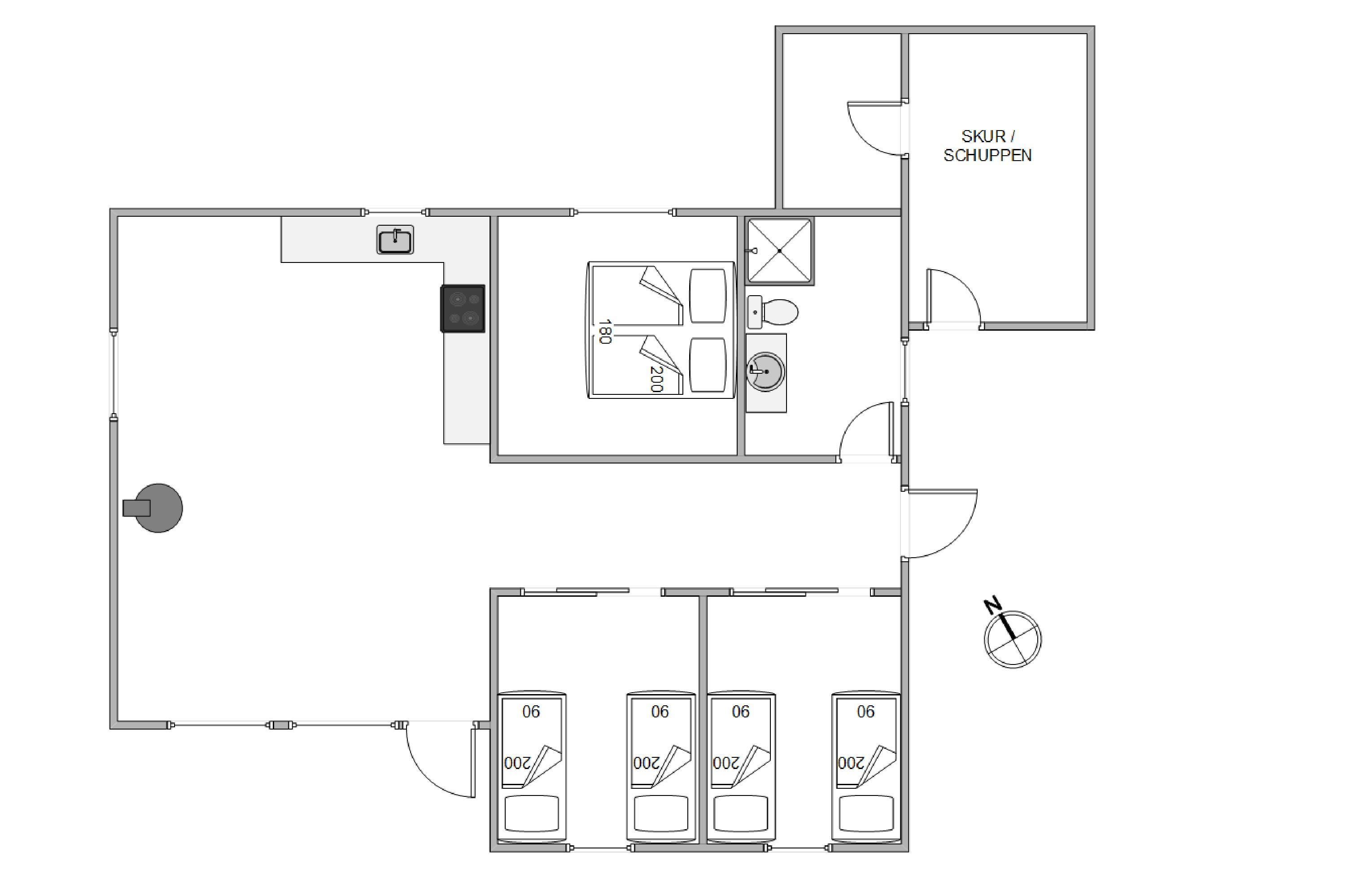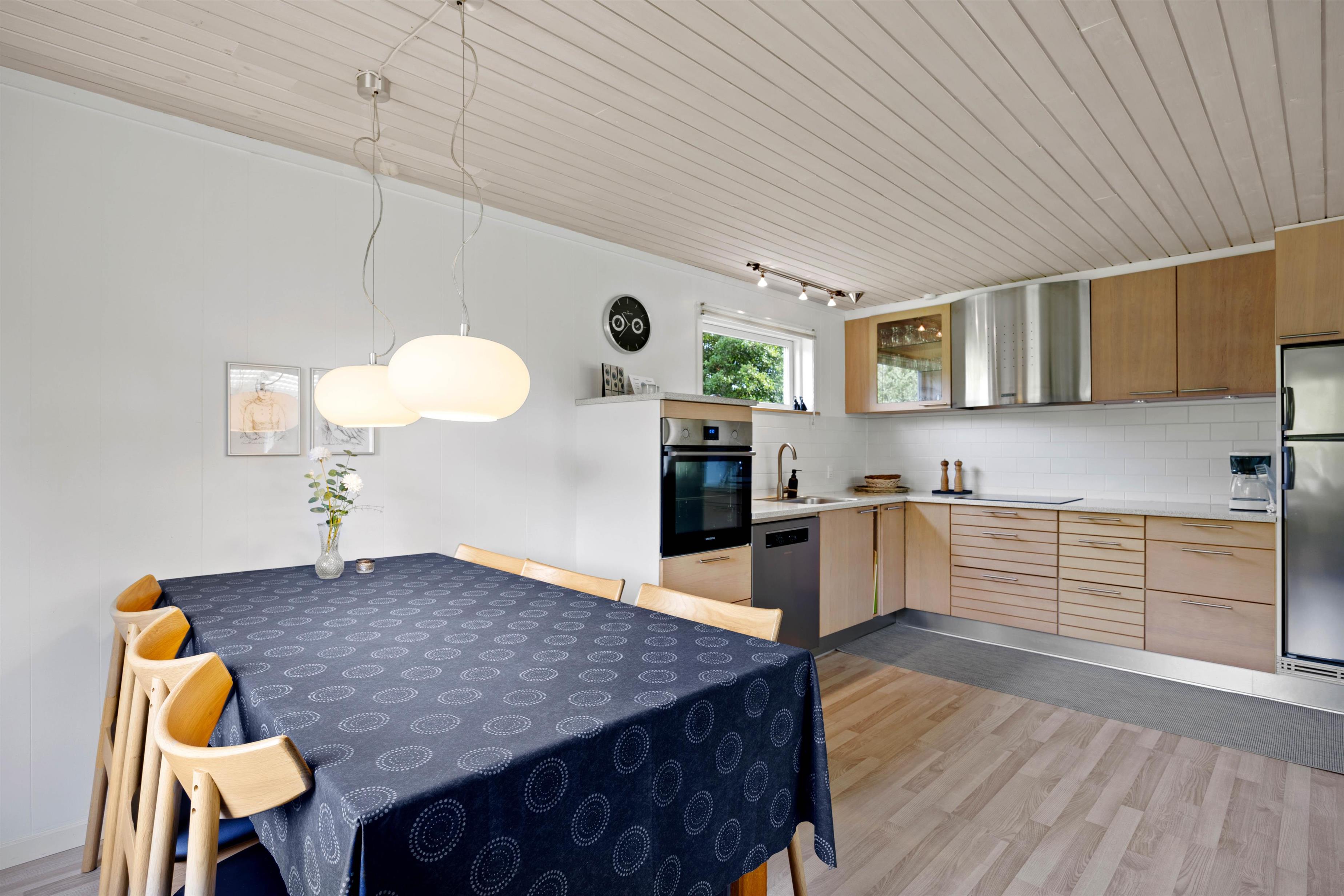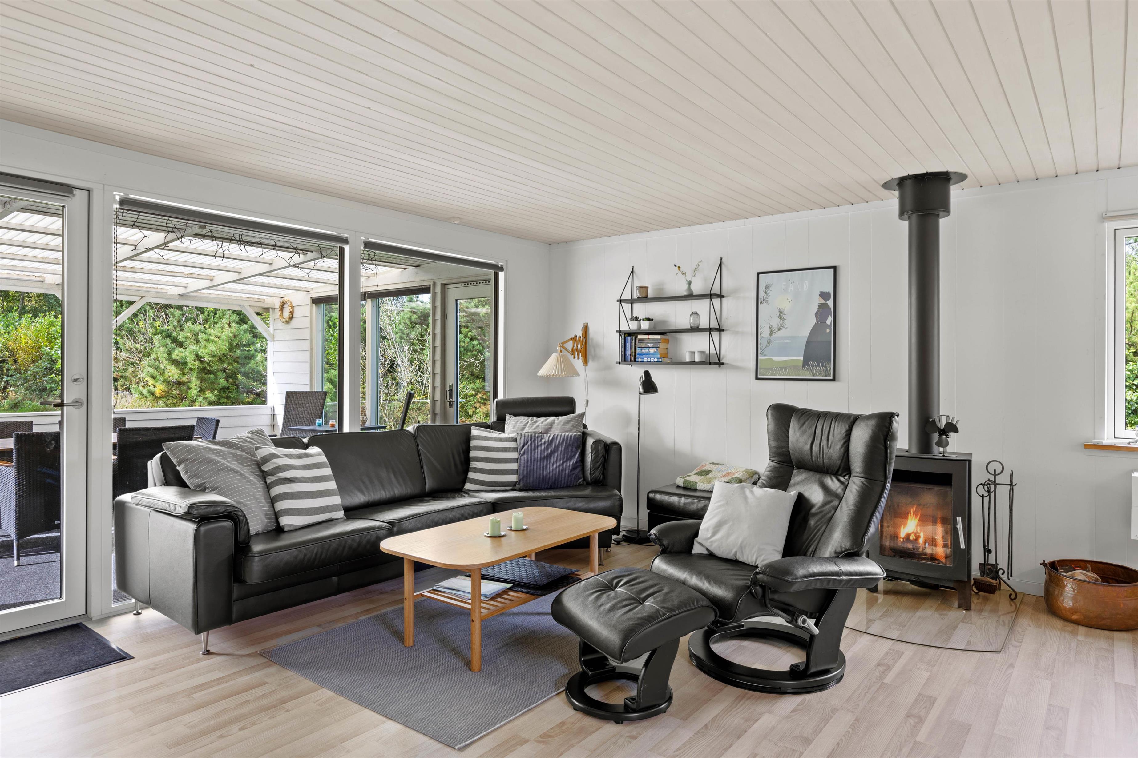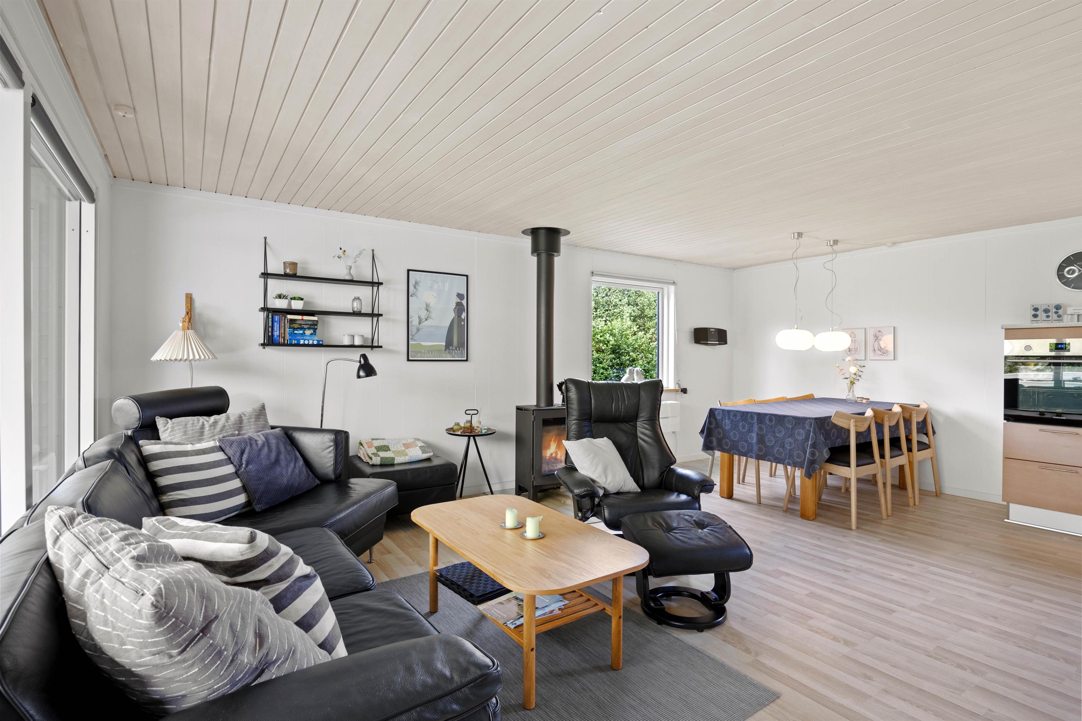 Her smelter køkken, spiseplads og stuen sammen som ét – på den måde kan I grine og snakke på tværs, selvom der slappes af på sofaen og laves mad i køkkenet. Fælles madlavning og hyggelige brætspilsaftner er blot ideer til, hvad ferien kan gå med. Stuens behagelige lænestol er også helt perfekt til ferielæsningen. Husk kaffen og tænd op i brændeovnen for ekstra hygge. Praktisk er her også en energivenlig varmepumpe samt direkte udgang til den dejlige overdækkede terrasse.
