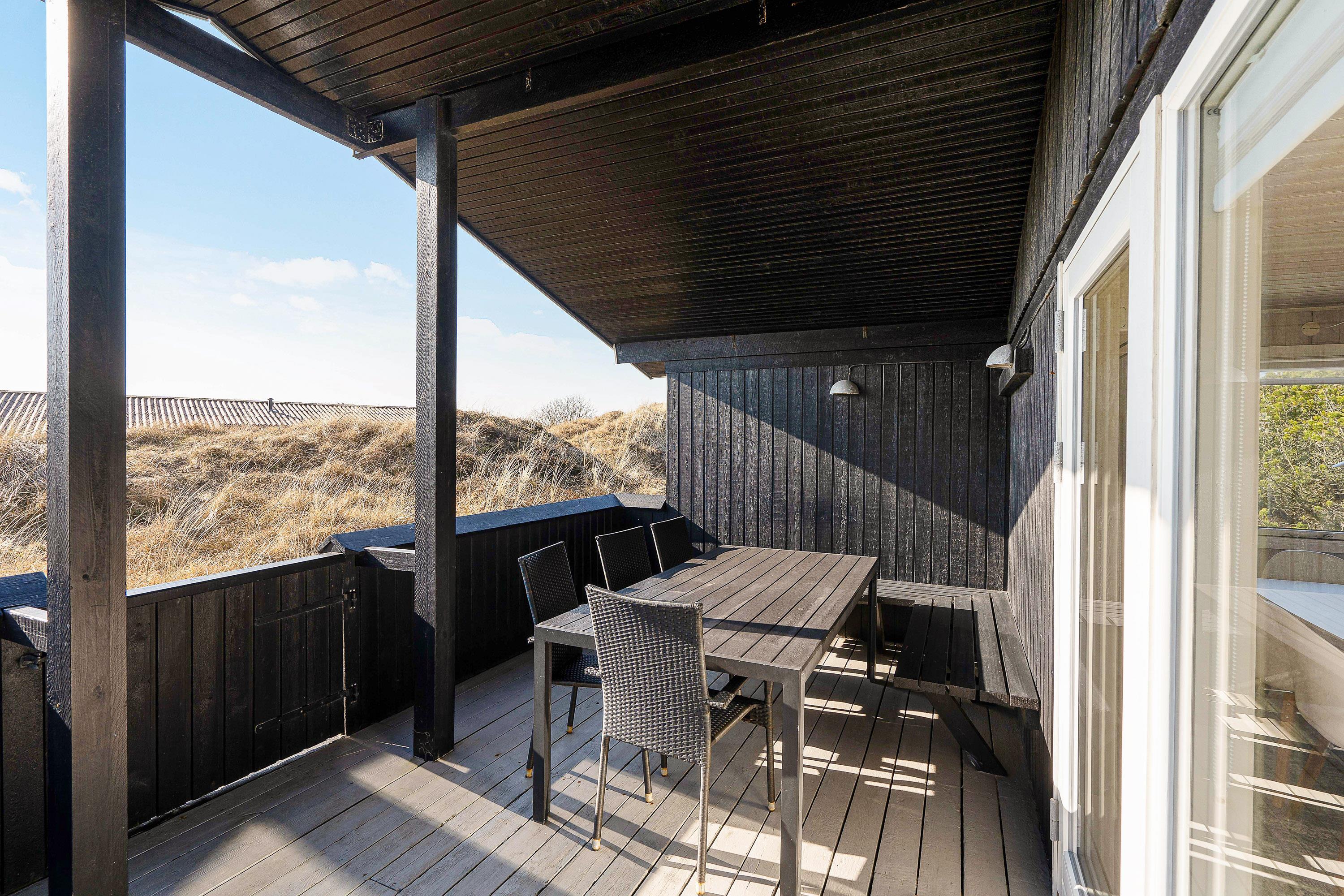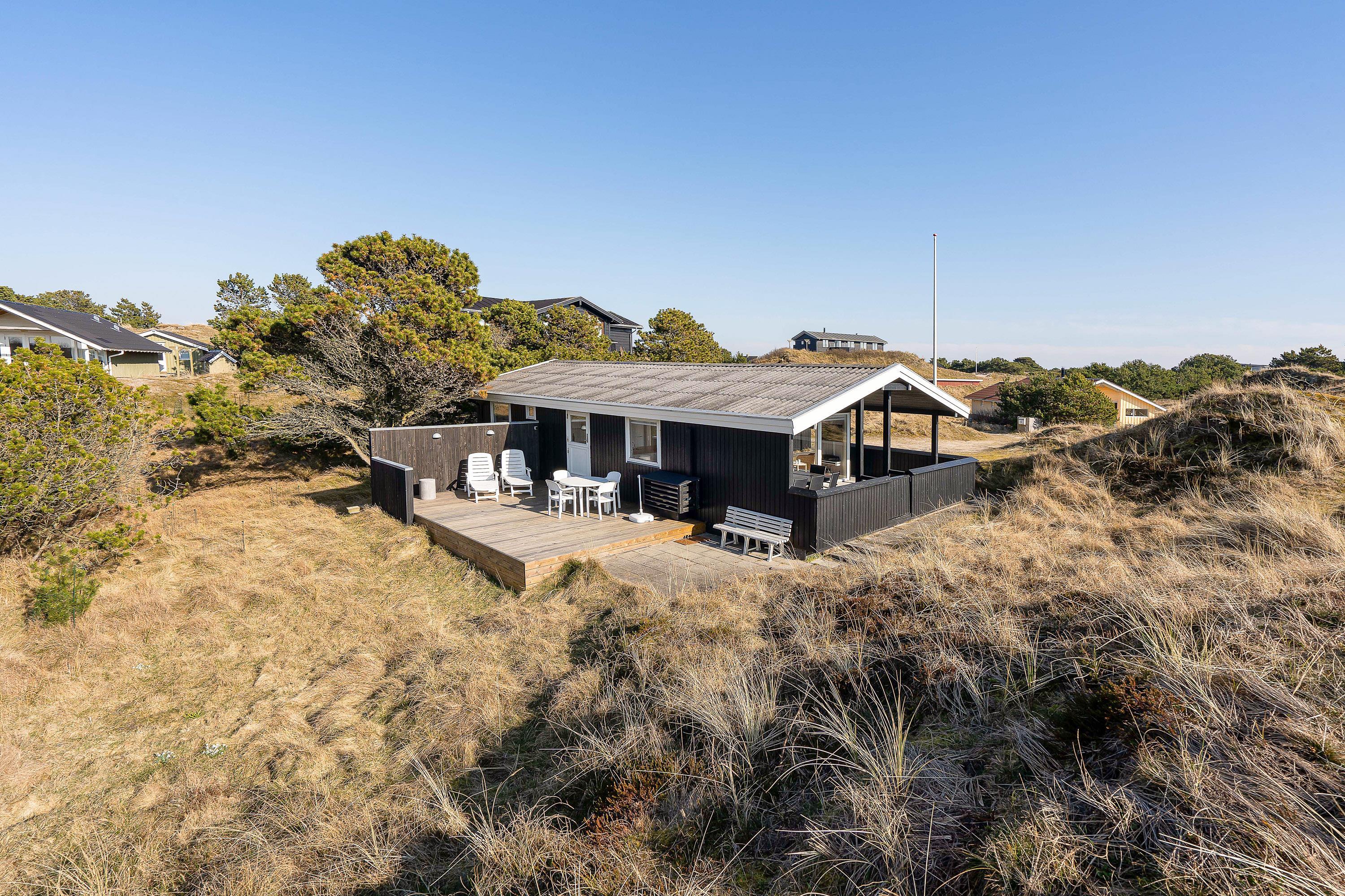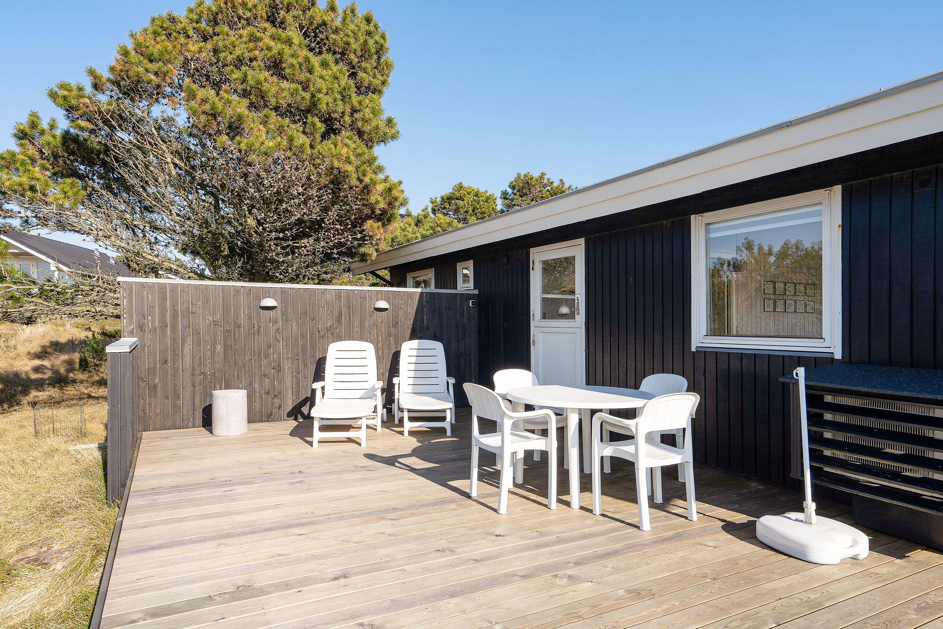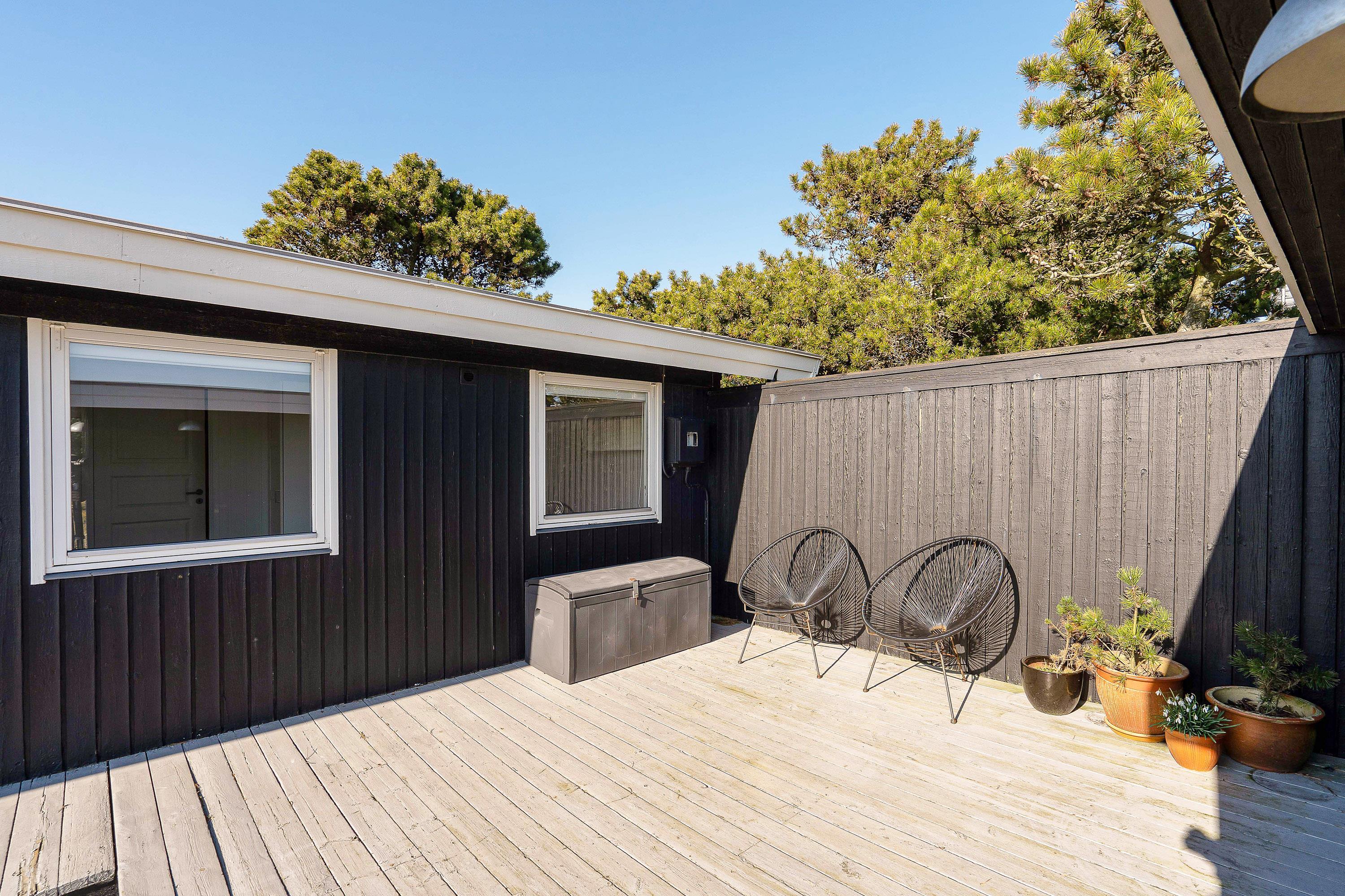 Den 1381 m² store grund ligger godt afskærmet af buske, træer og en lille høj, så I her kan nyde jeres fridage i rolige og afslappende omgivelser. I har her 3 fine terrasser, hvoraf den ene er både afskærmet og overdækket. Her kan I bestemt finde en solrig eller skyggefuld plads, alt efter hvad I ønsker. Alle terrasser er udstyrede med gode havemøbler og solvogne, og en grill står også til jeres rådighed, så I kan nyde jeres aftensmad frisk fra grillen.