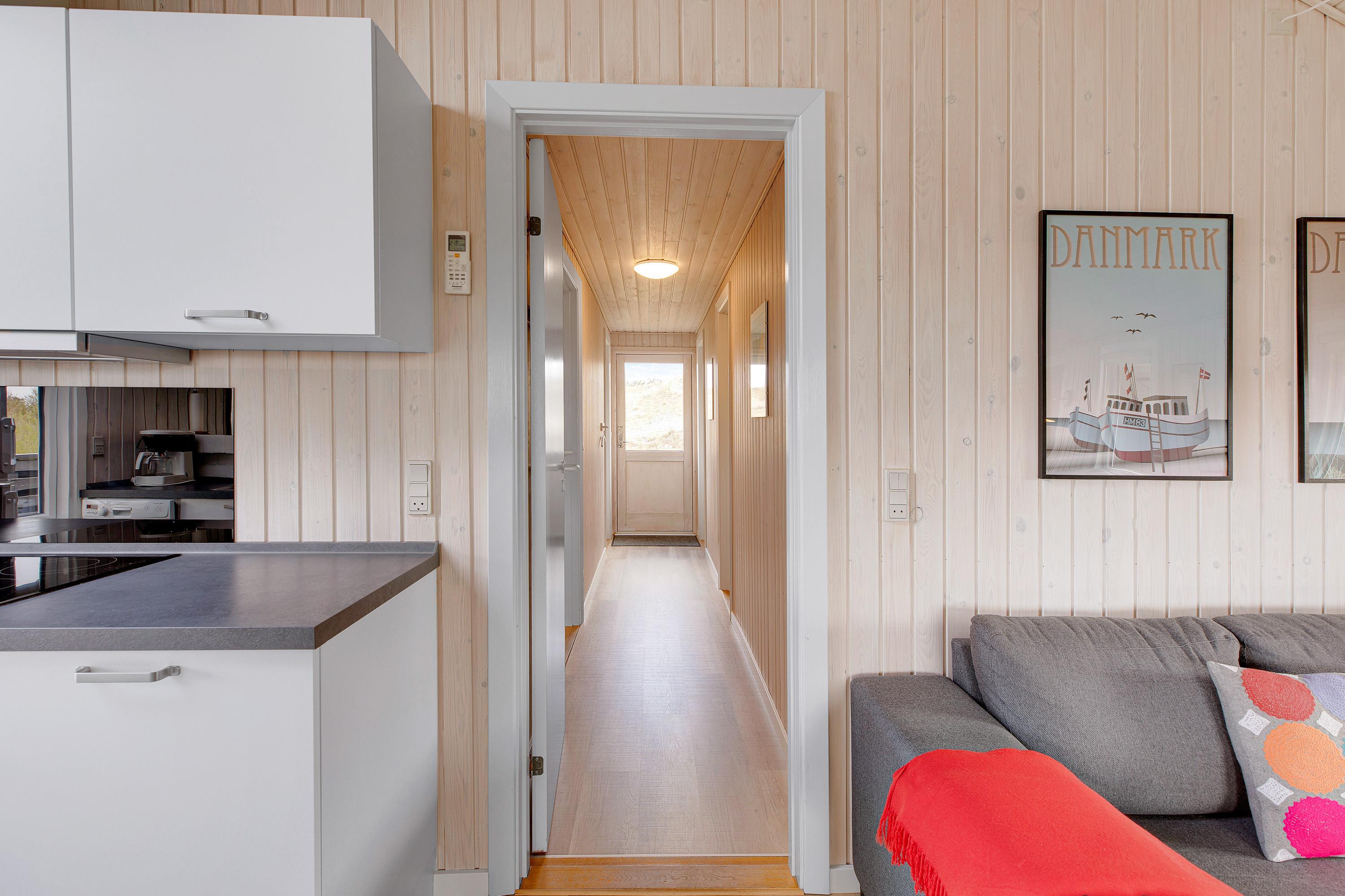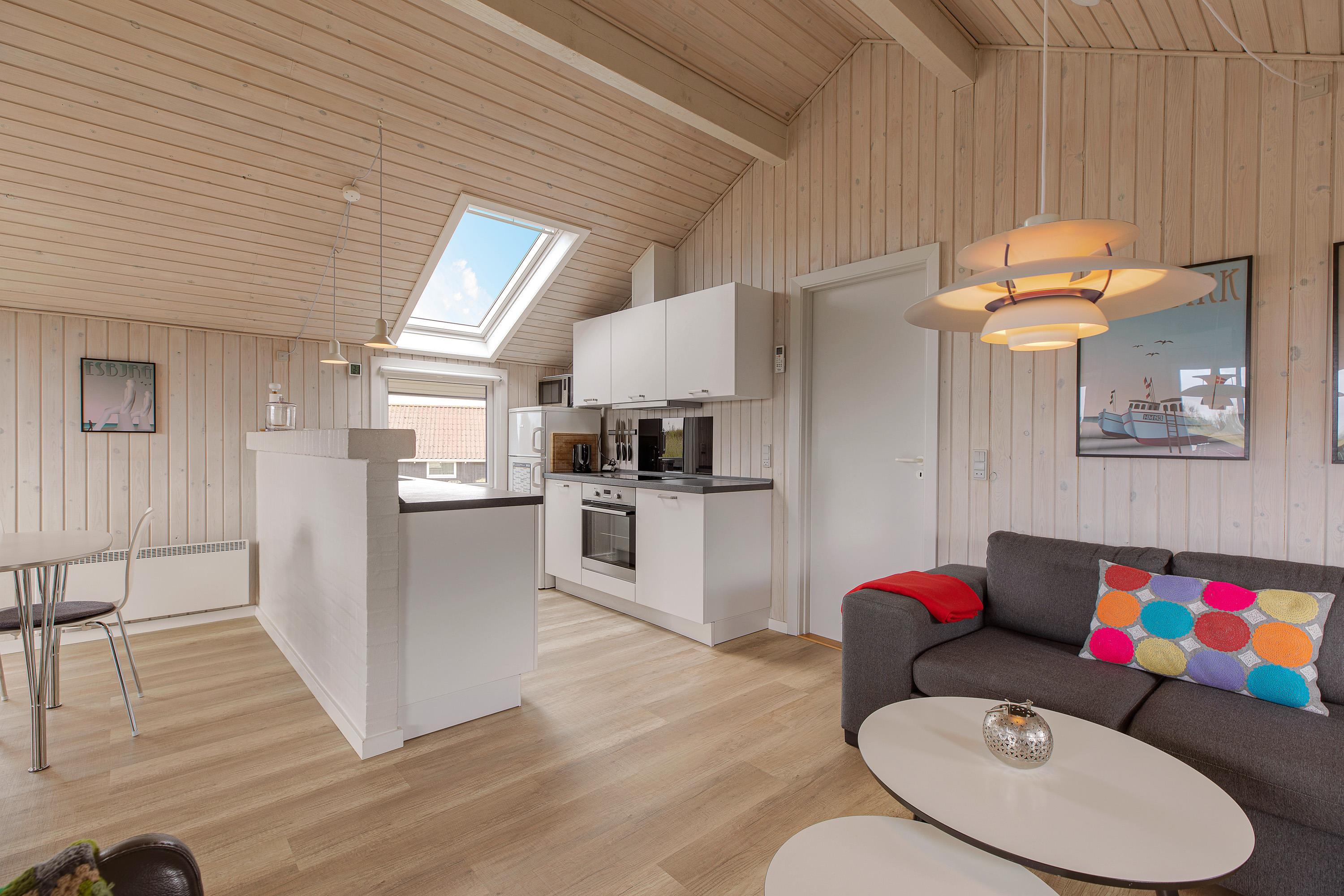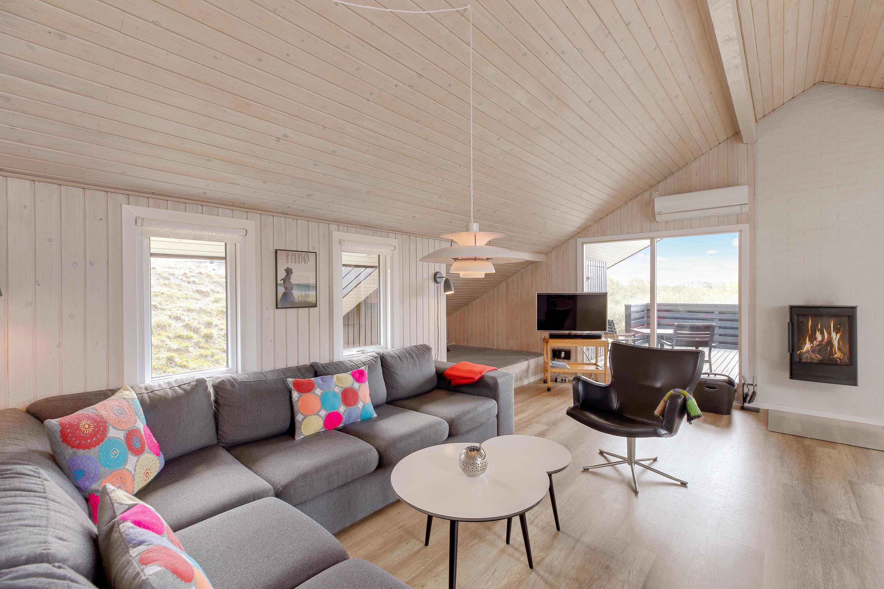 Jeres store samlingspunkt i feriehuset bliver uden tvivl alrummet, hvor der er åben forbindelse mellem køkken, stue og spiseplads. Her kan I både være sammen om at lave mad, spille sjove spil og se gode film – I kan streame jeres favoritfilm via Chromecasten. Alt imens fuldender brændeovnen feriestemningen med sine knitrende flammer i baggrunden.
