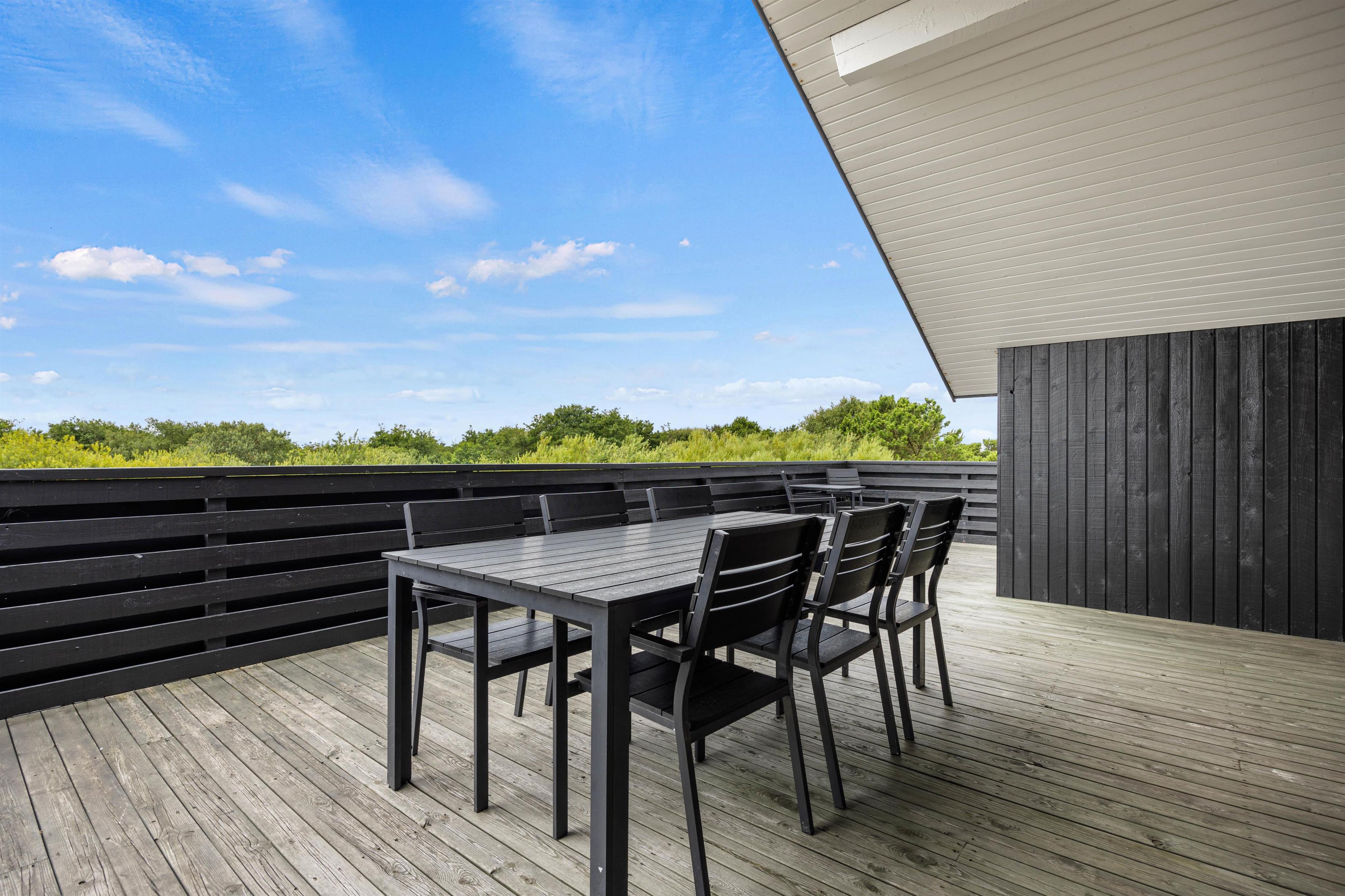 Fra sommerhusets alrum kan I træde ud på den skønne terrasse, der vender mod sydvest og er delvist overdækket. Her kan I nyde solen det meste af dagen, så find jer en god plads og sæt jer til rette i havemøbler og liggestole. Fra terrassen kan I desuden nyde en dejlig udsigt over området.