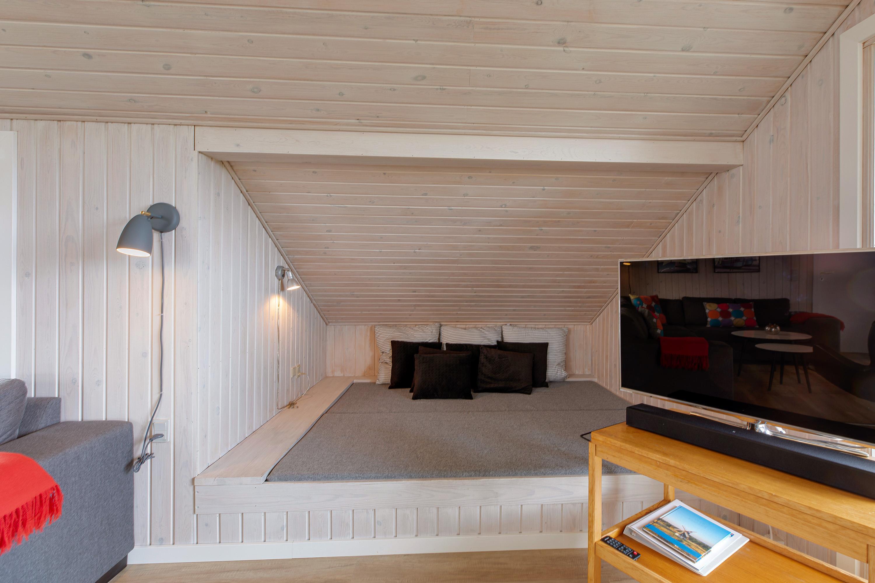 Hyggelig indretning med alkove og brændeovn