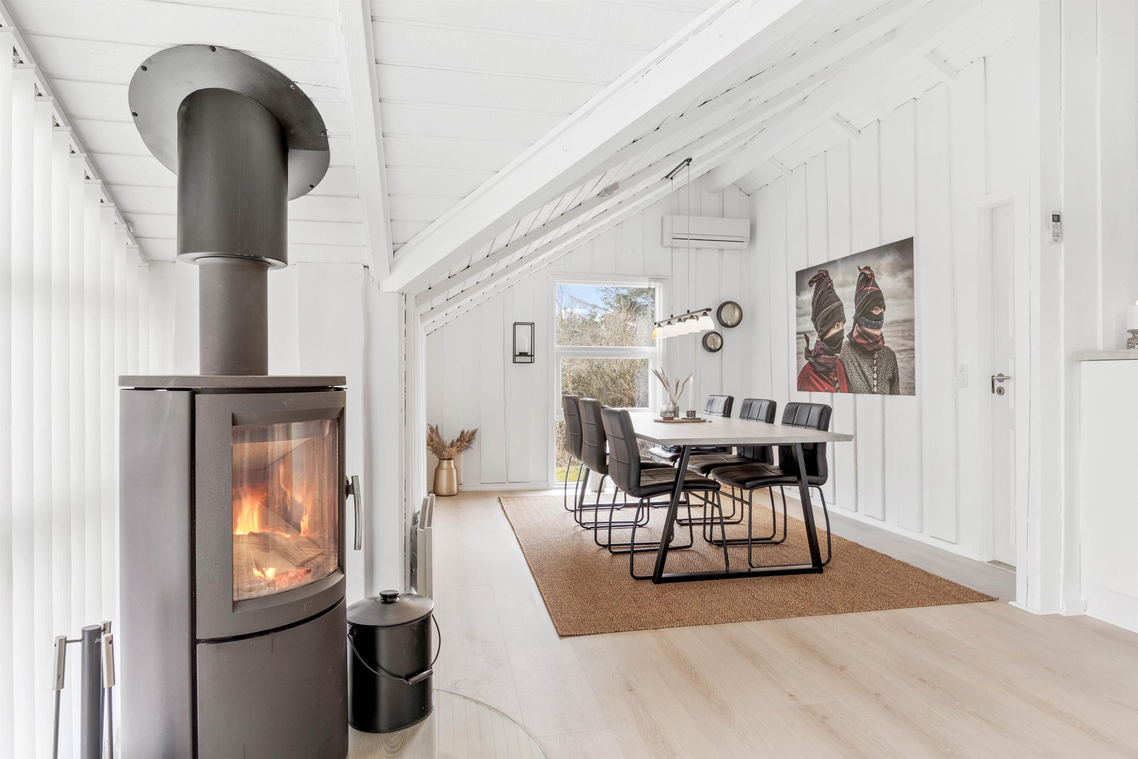 Feriehuset kan I opvarme med den energibesparende varmepumpe, som sørger for hurtig og effektiv opvarmning af feriehuset. Alternativt kan I tænde op i brændeovnen, og slappe af til lyden af sen sagte knitren i baggrunden samt flammernes dans hen over væggene. Det er afslapning der vil noget.