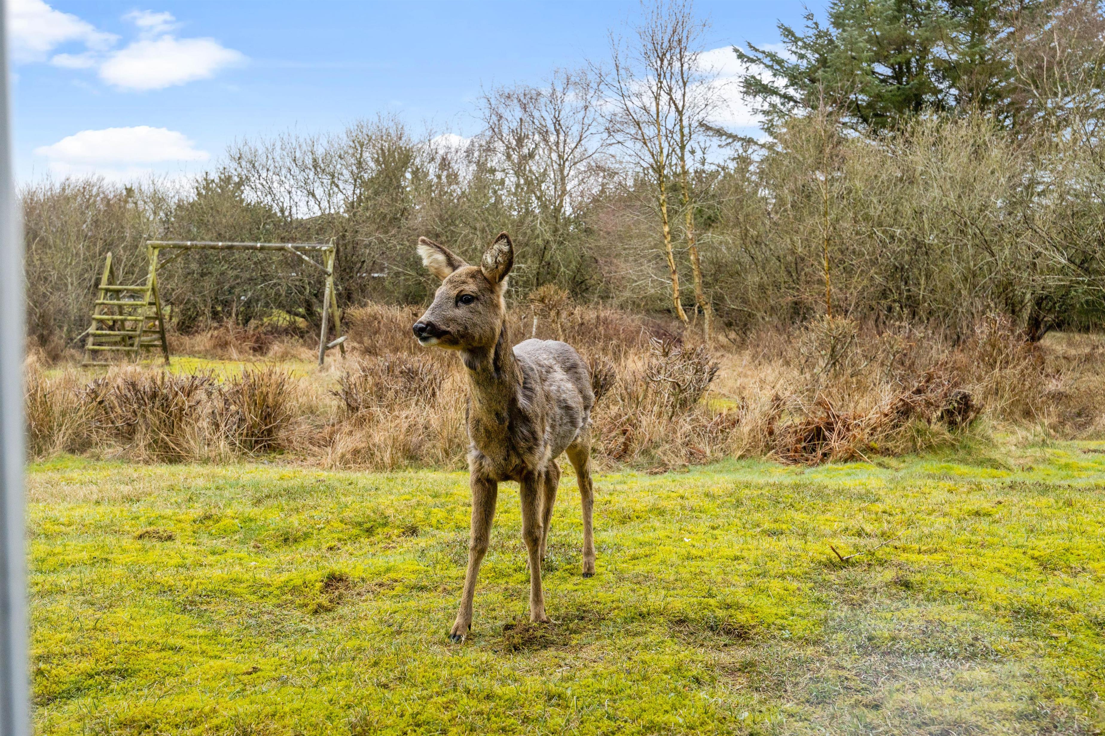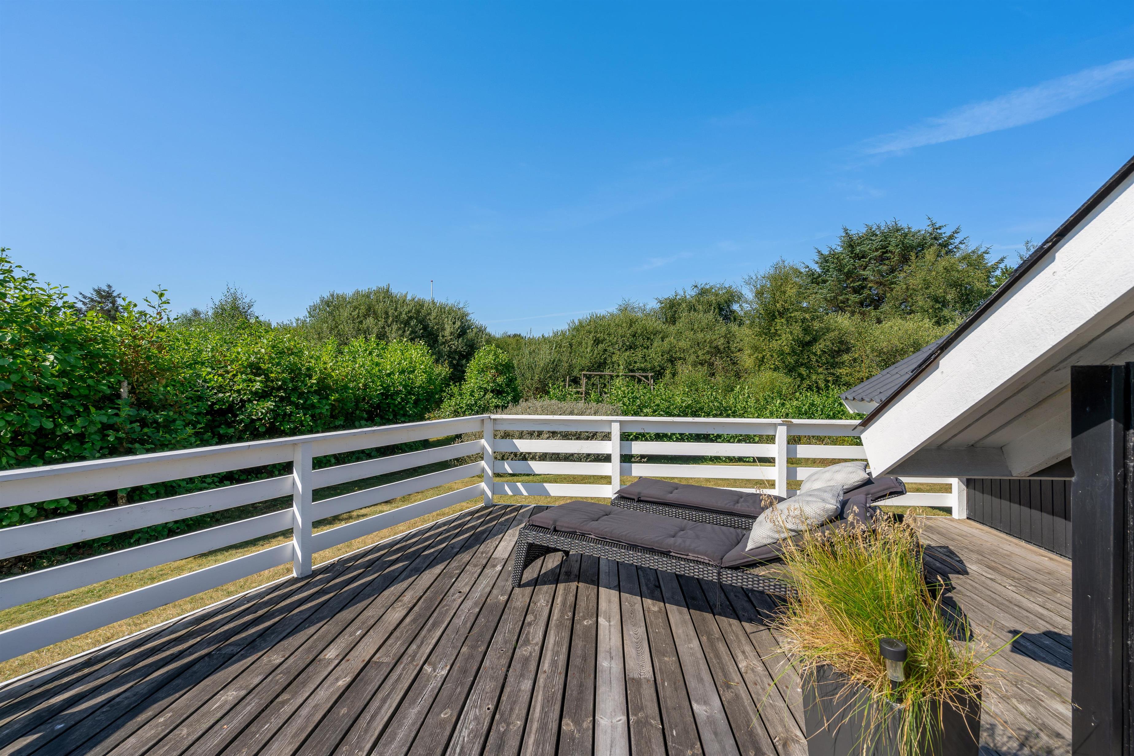 Sommerhuset ligger ugeneret, da grunden er omkranset af træer og buske. Her kan I nyde roen og lyden af fuglekvidder omkring jer. Den store flotte terrasse, der løber langs syd/sydøst siden af sommerhuset, er indrettet med gode havemøbler, så I altid kan finde et godt spot i solen. Læn jer tilbage i solvognene mens familiens mindste leger på plænen – her er også både sandkasse og gynge, så de ikke kommer til at kede sig.