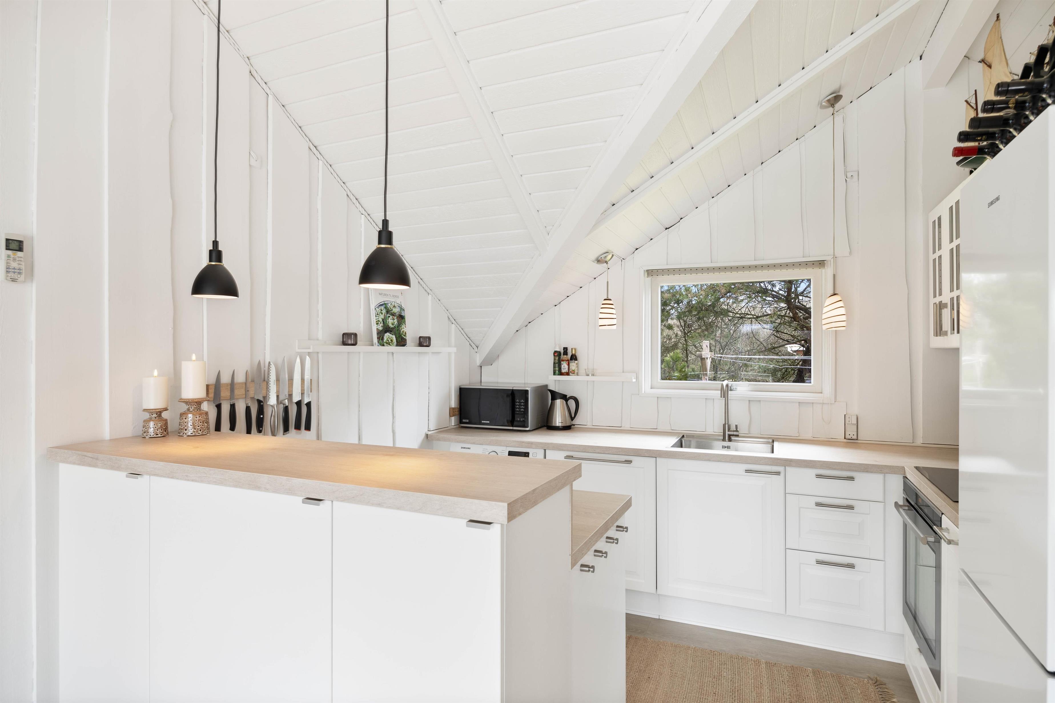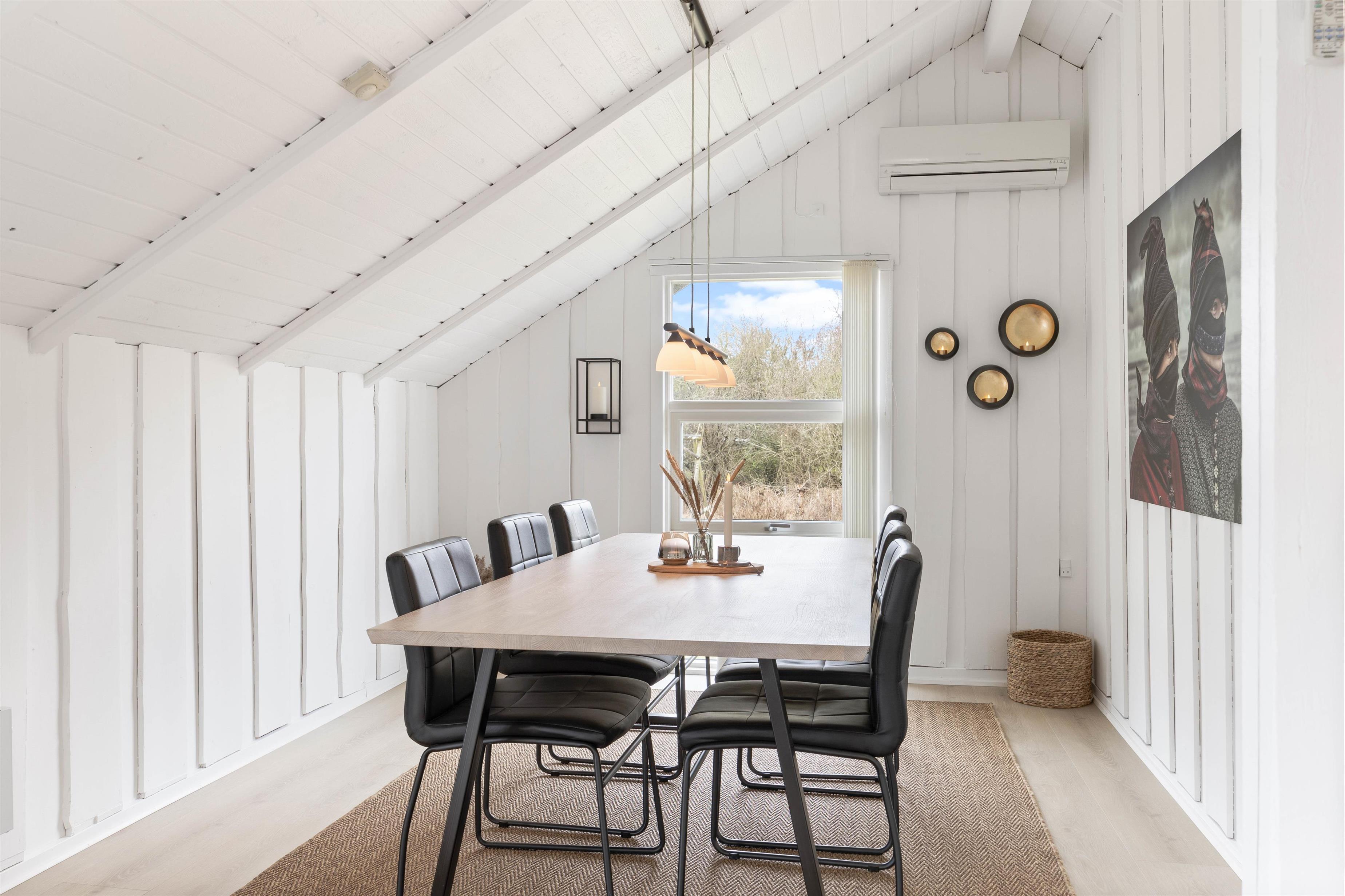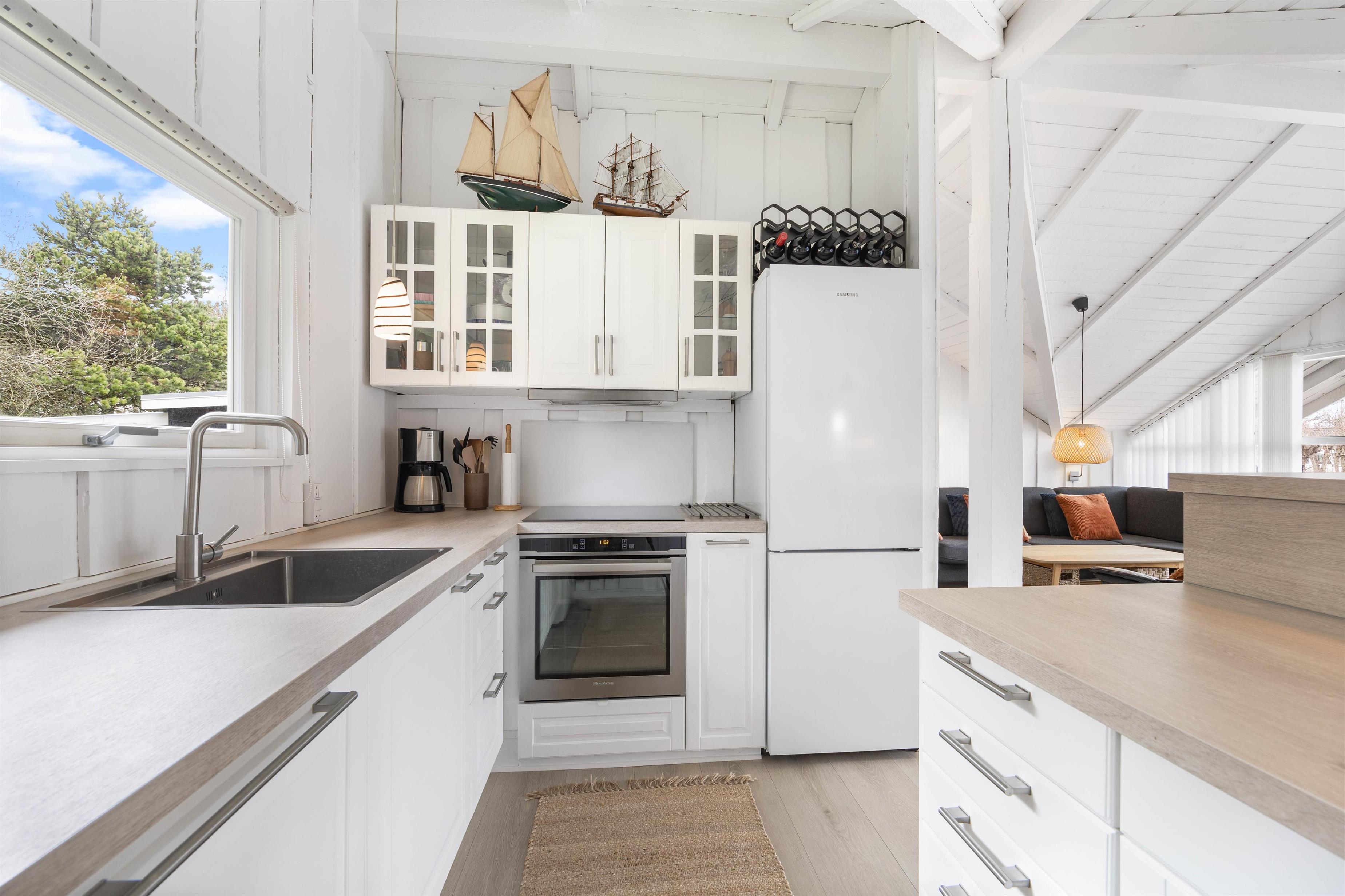 Hjertet af feriehuset er det fine alrum, hvor det veludstyrede køkken med opvaskemaskine er forenet med spiseplads og stue i et, så her er rammerne sat for mange timer sammen i hyggeligt samvær. Se en god film i TV, som I kan streame over Chromecast, eller snup et brætspil ved spisebordet. Mulighederne er mange.