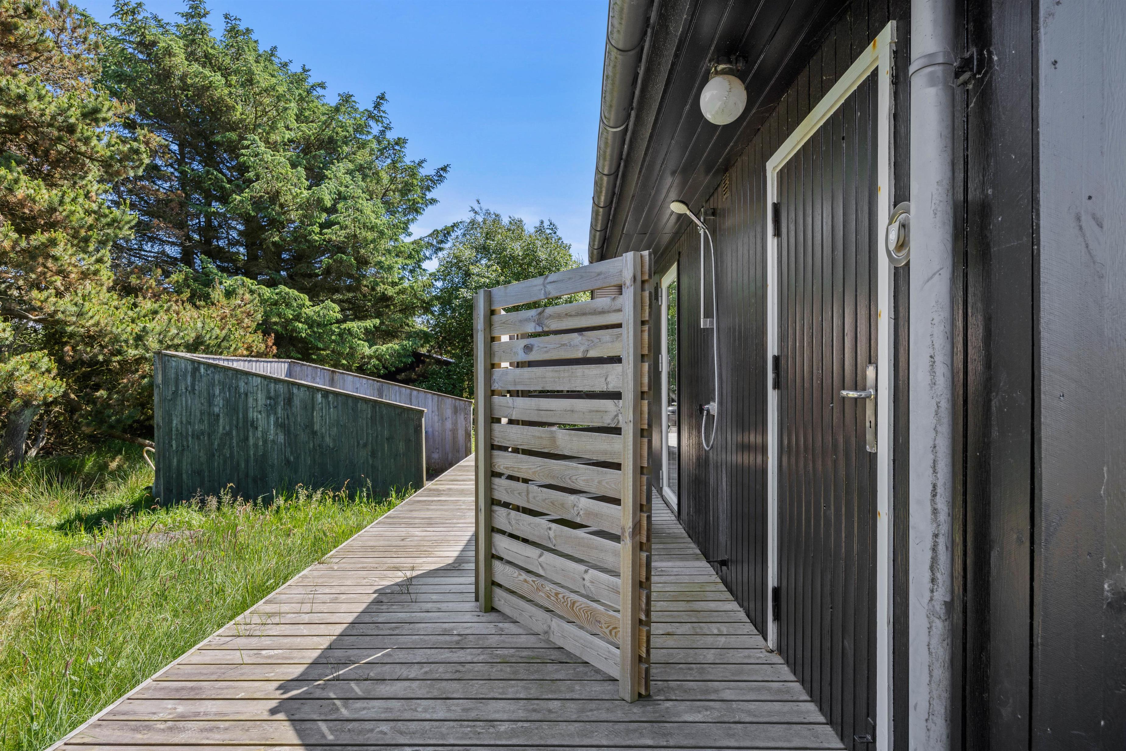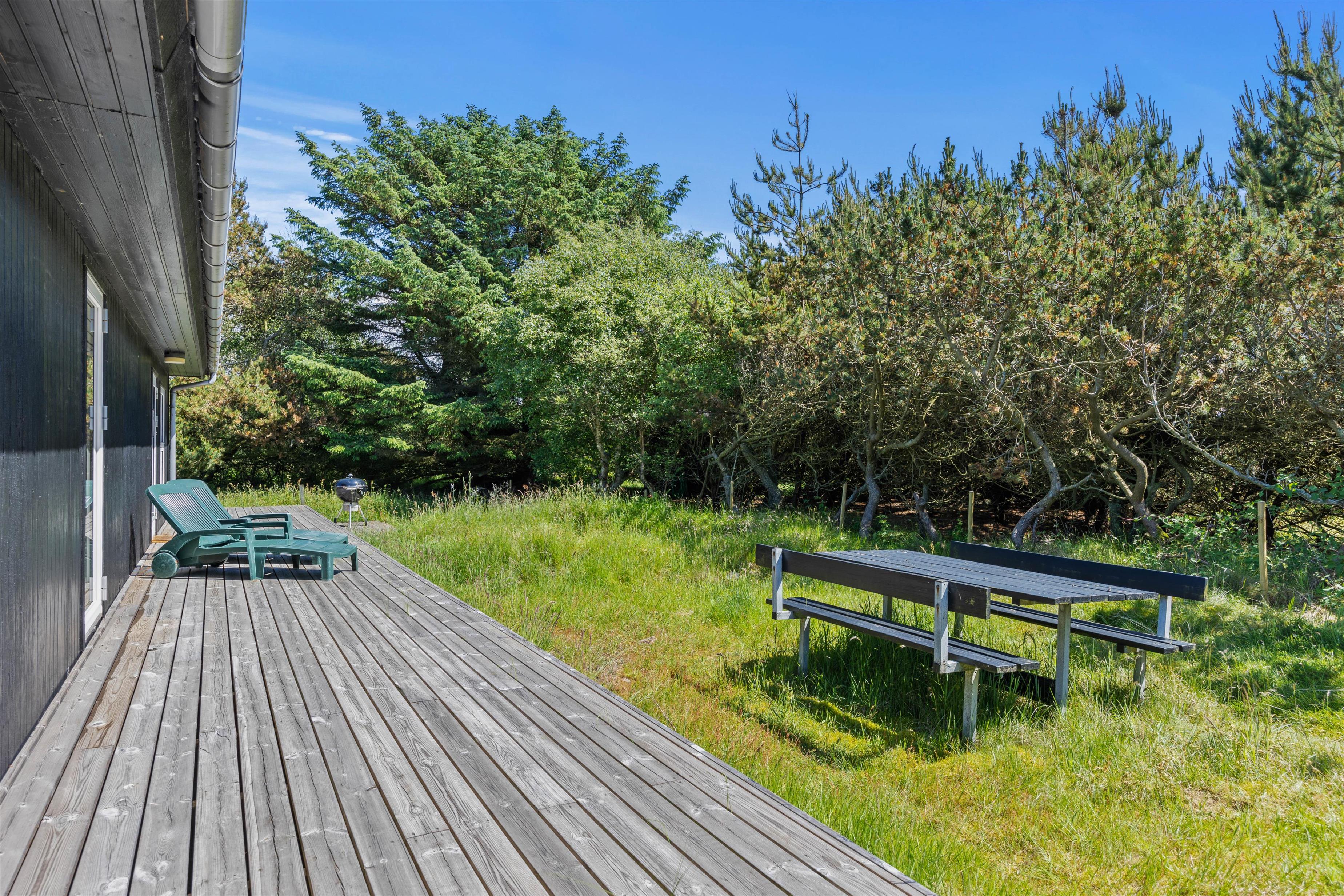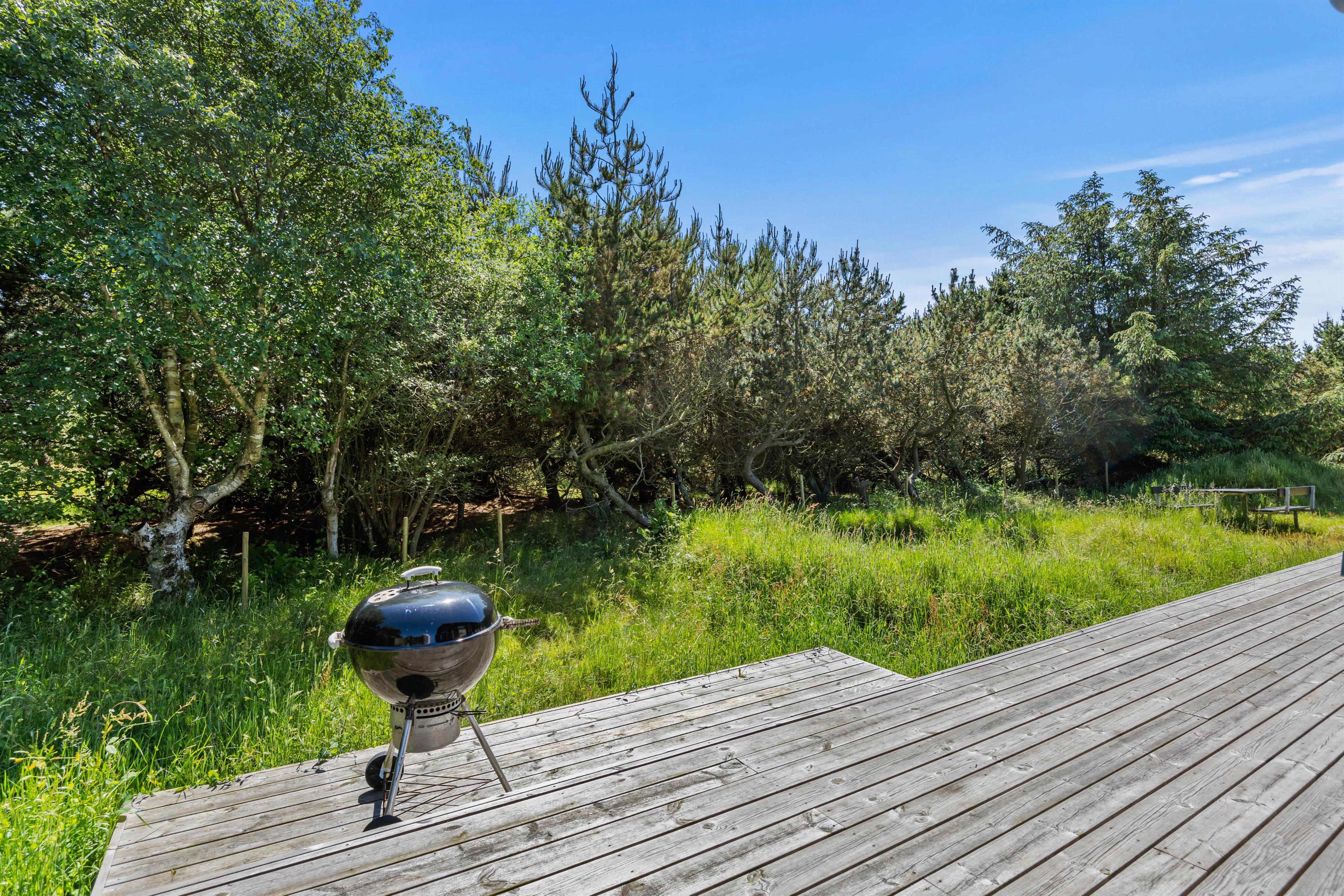 Udenfor venter den store terrasse på at byde jer velkommen til solrige dage. Terrassen er indrettet med havemøbler, solvogne og en grill, så I kan prøve kræfter med lokale specialiteter direkte fra grillen, der kan nydes under åben himmel. Her forefindes også en udebruser, så I kan blive kølet ned efter en solrig sommerdag på terrassen. Denne kan benyttes fra april til november.
