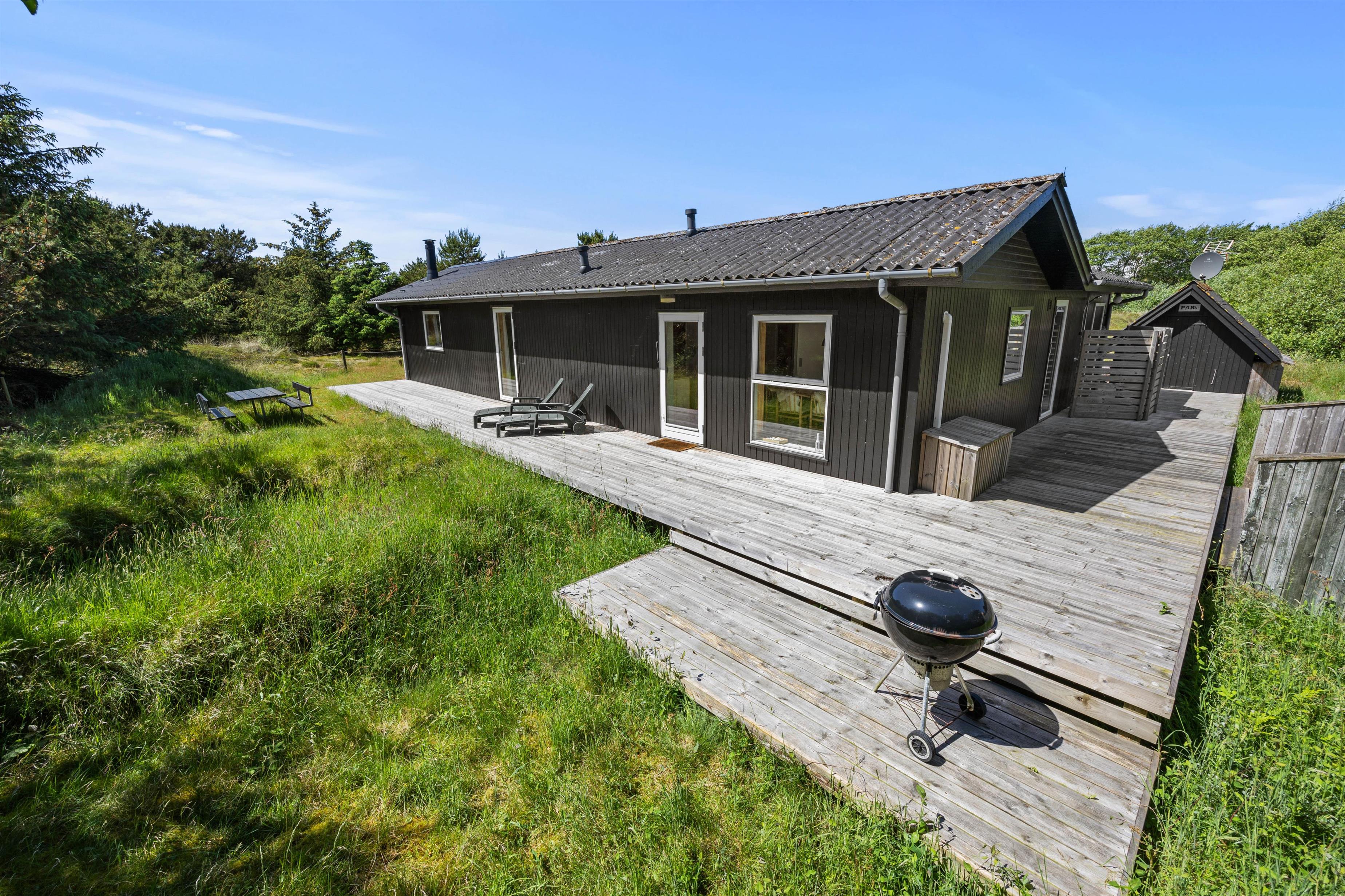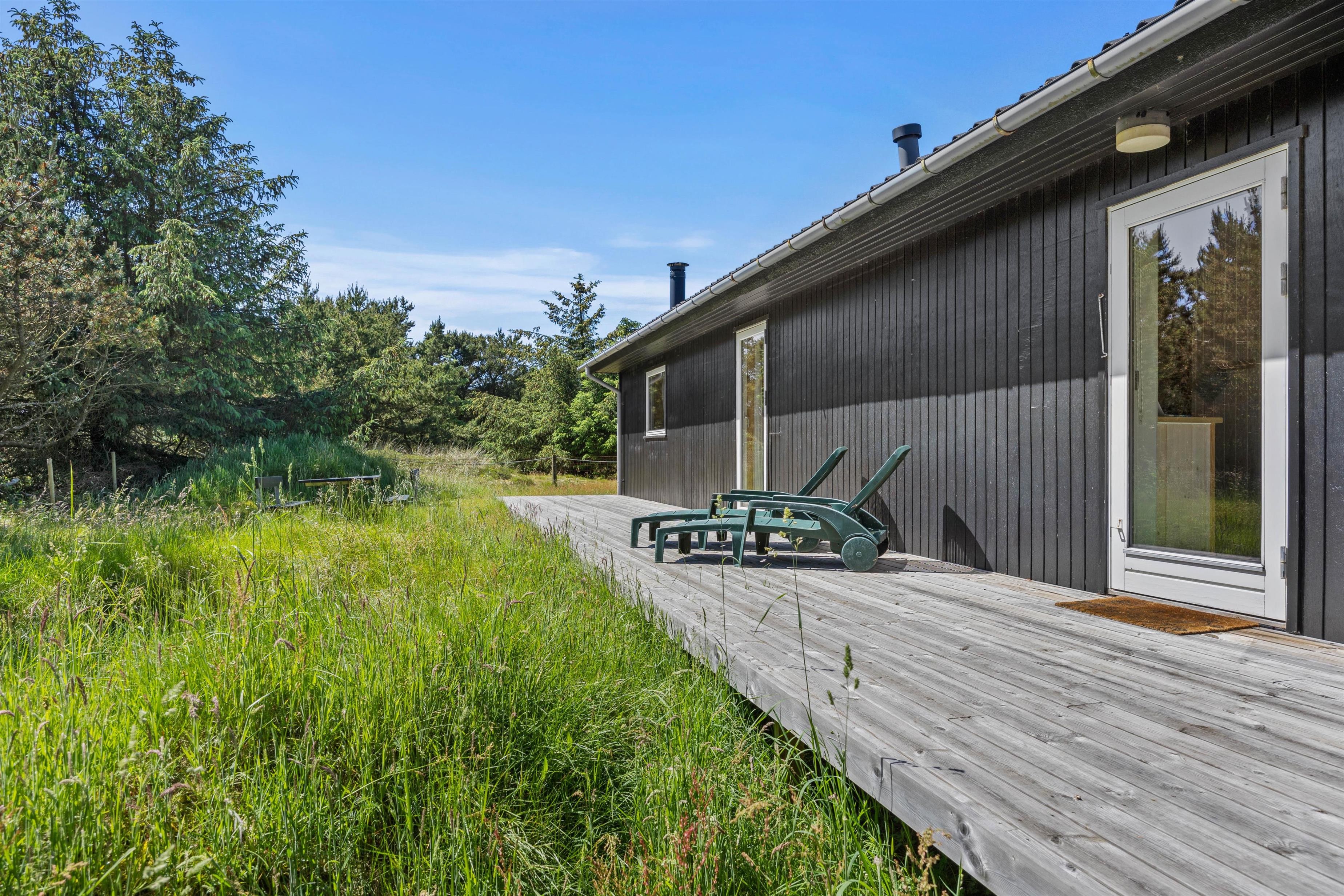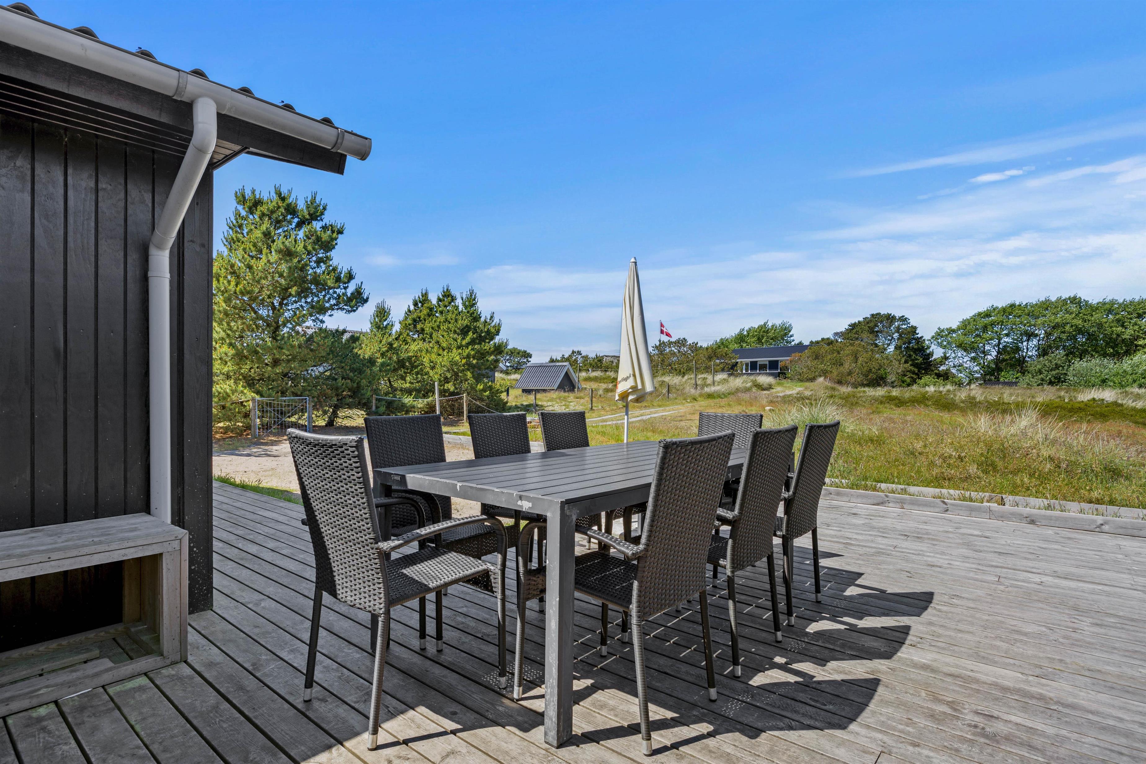 Udenfor venter den store terrasse på at byde jer velkommen til solrige dage. Terrassen er indrettet med havemøbler, solvogne og en grill, så I kan prøve kræfter med lokale specialiteter direkte fra grillen, der kan nydes under åben himmel. Her forefindes også en udebruser, så I kan blive kølet ned efter en solrig sommerdag på terrassen. Denne kan benyttes fra april til november.