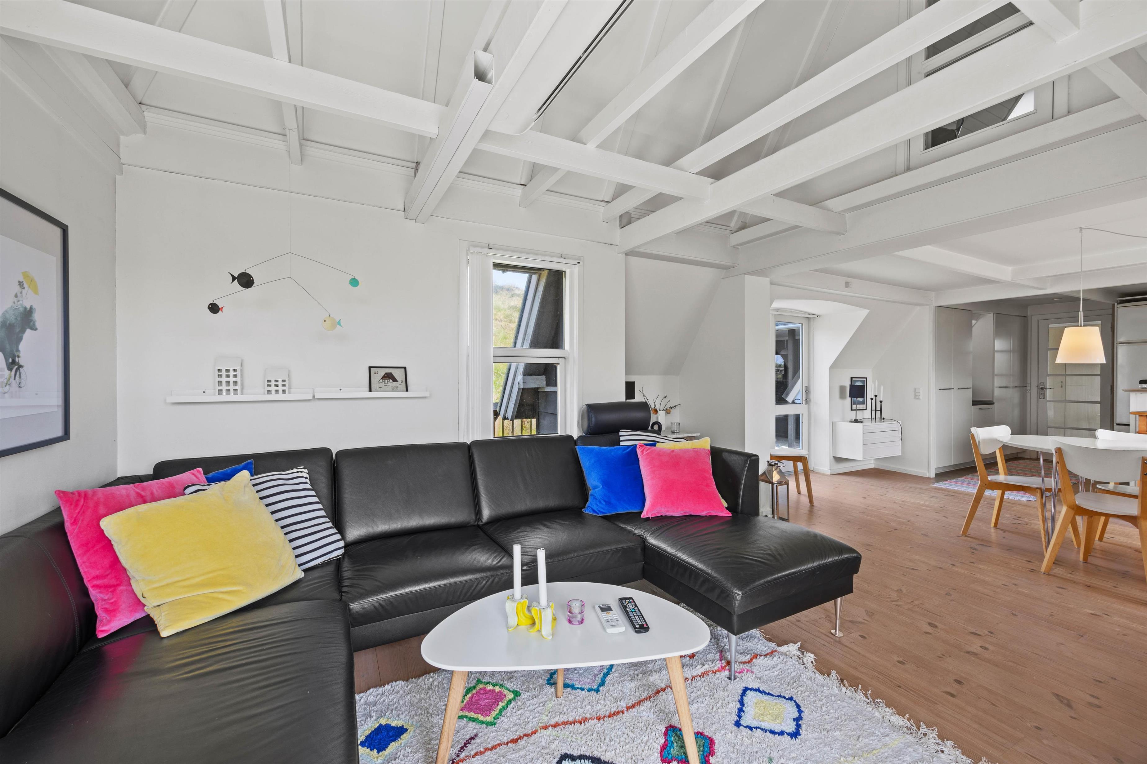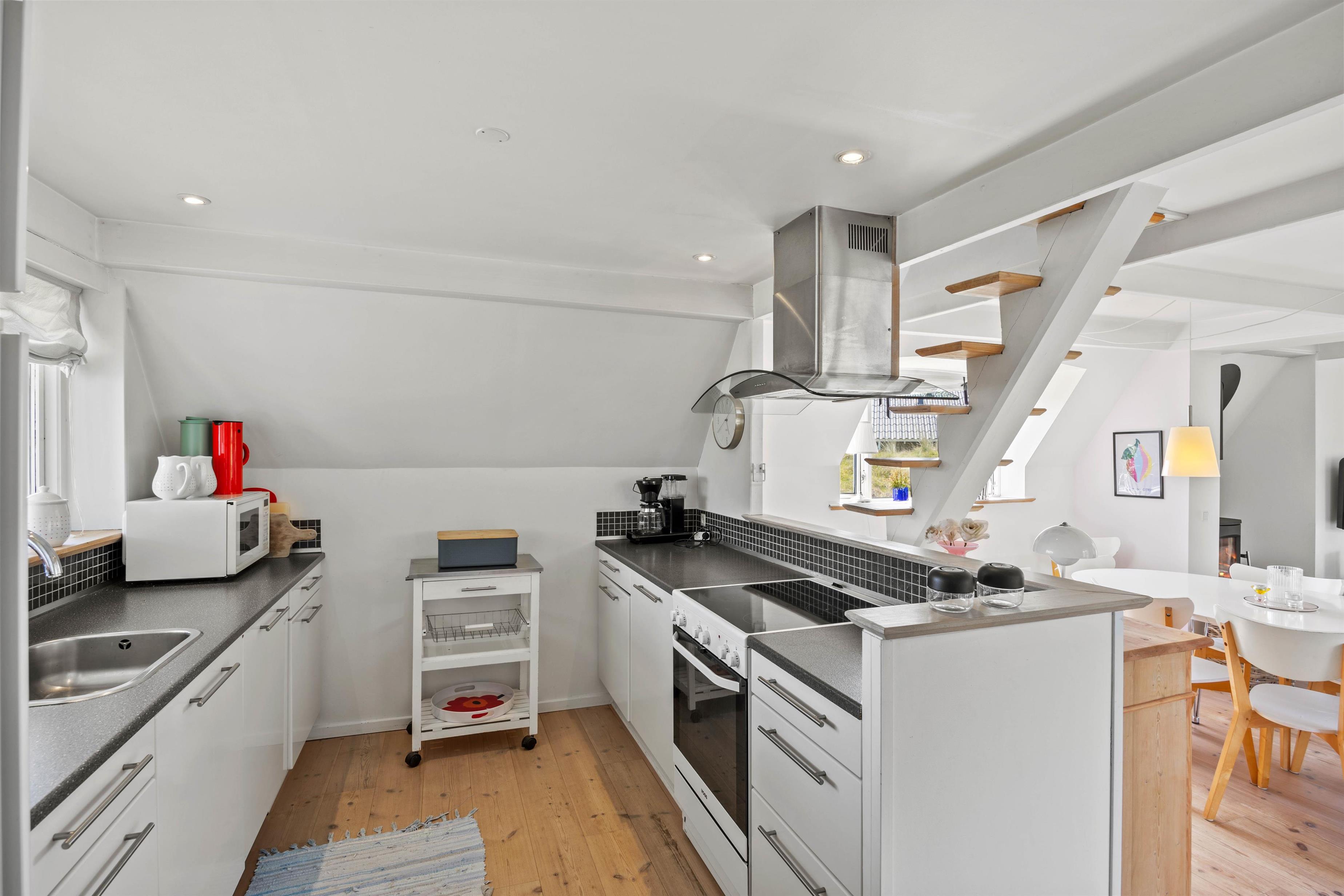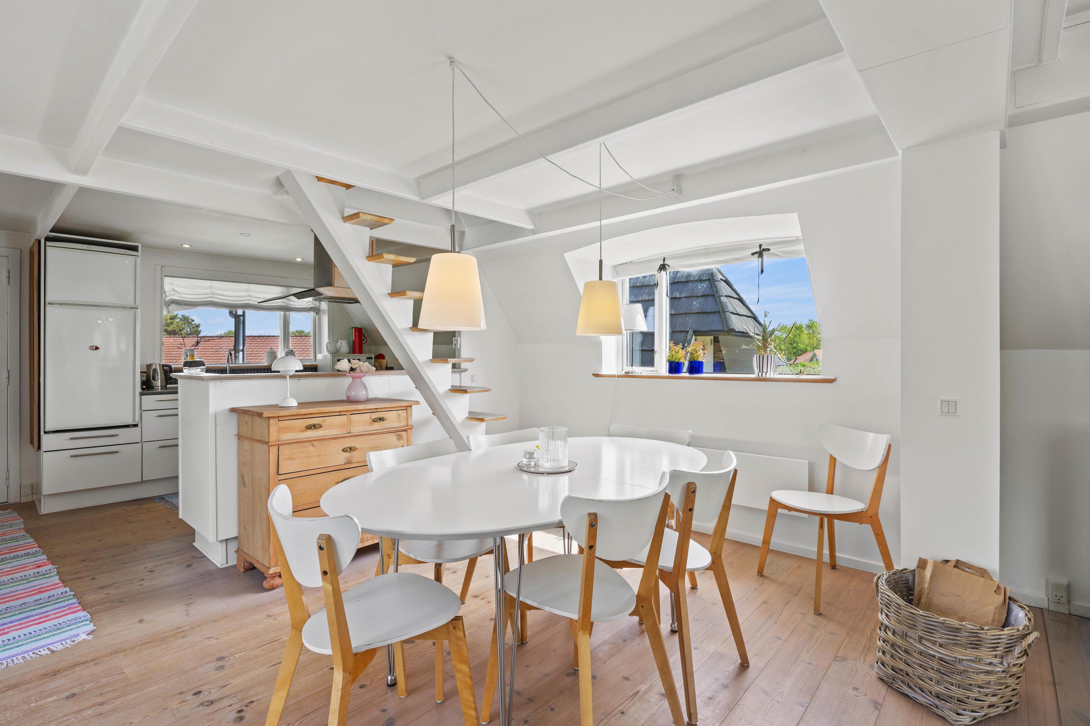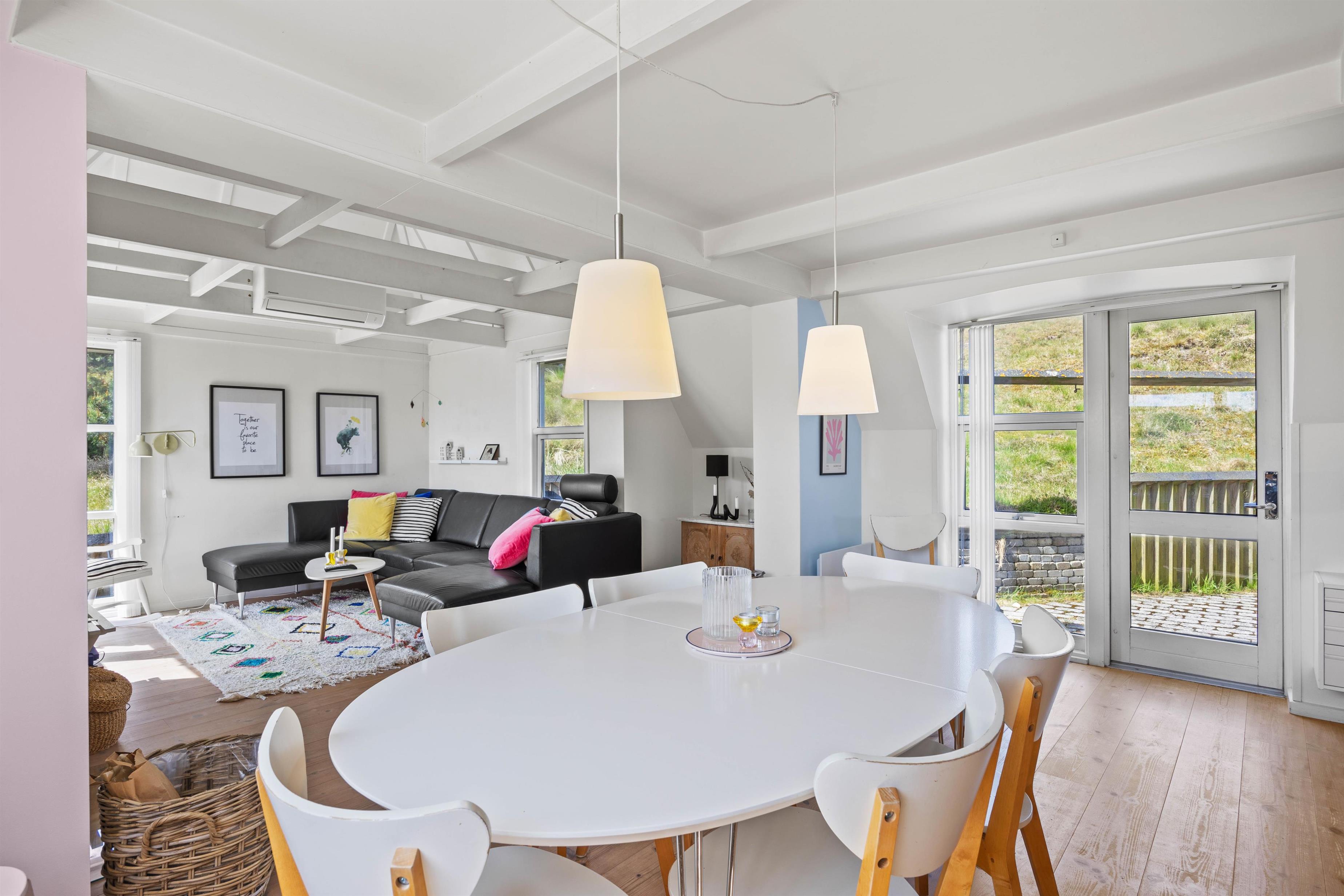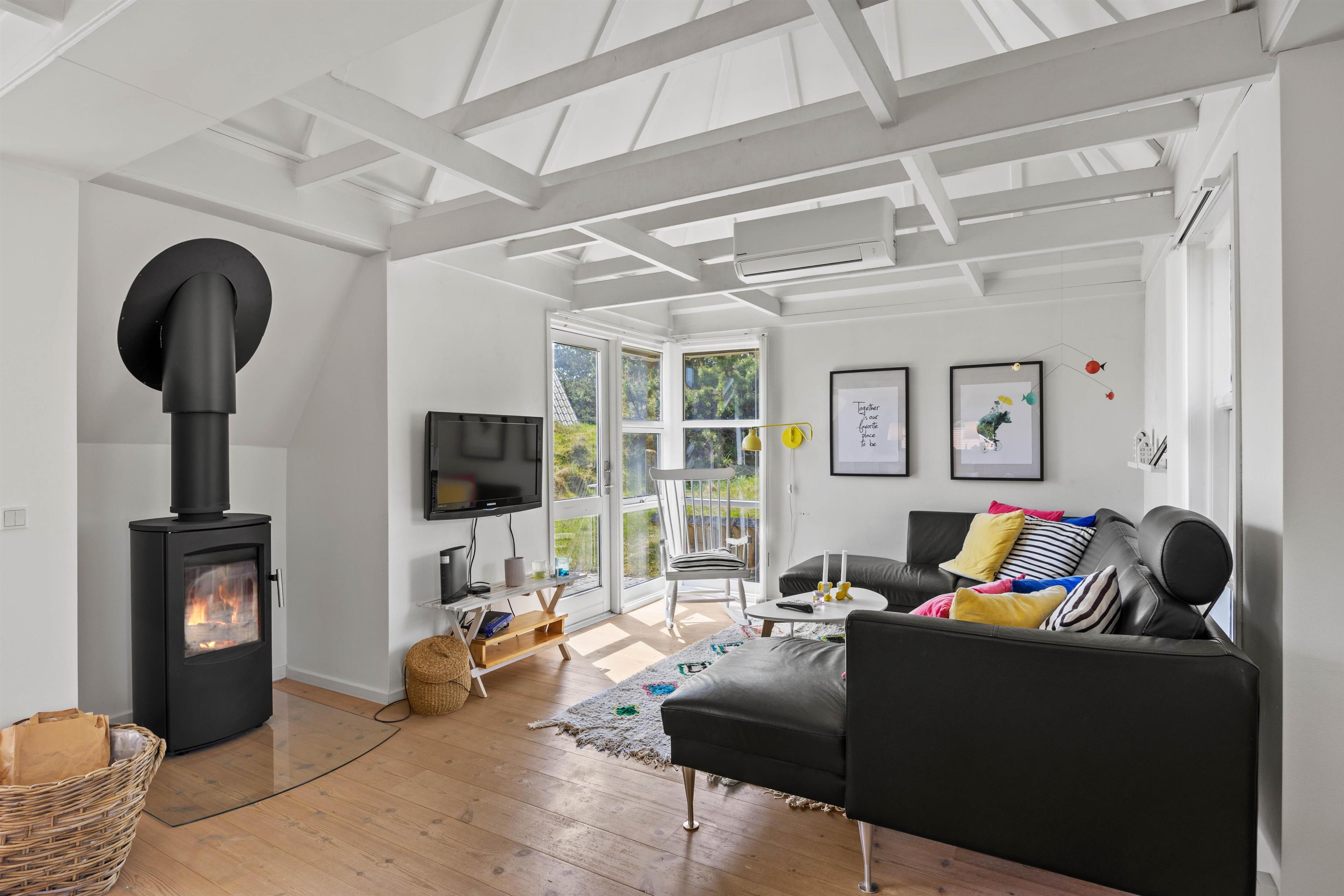 Det åbne opholdsrum kombinerer stue, spiseplads og køkken på en måde, der skaber både hygge og funktionalitet. Køkkenet er veludstyret med bl.a. opvaskemaskine, så de praktiske opgaver hurtigt er klaret, og I i stedet kan nyde tiden sammen. Midt i stuen sørger brændeovnen for varme og ekstra stemning på kølige aftener, mens en moderne luft-til-luft varmepumpe sikrer et behageligt indeklima året rundt. Når det kommer til underholdning, er der både Chromecast og danske tv-kanaler, så I nemt kan streame film, serier eller følge med i nyhederne – alt efter humør og vejr.