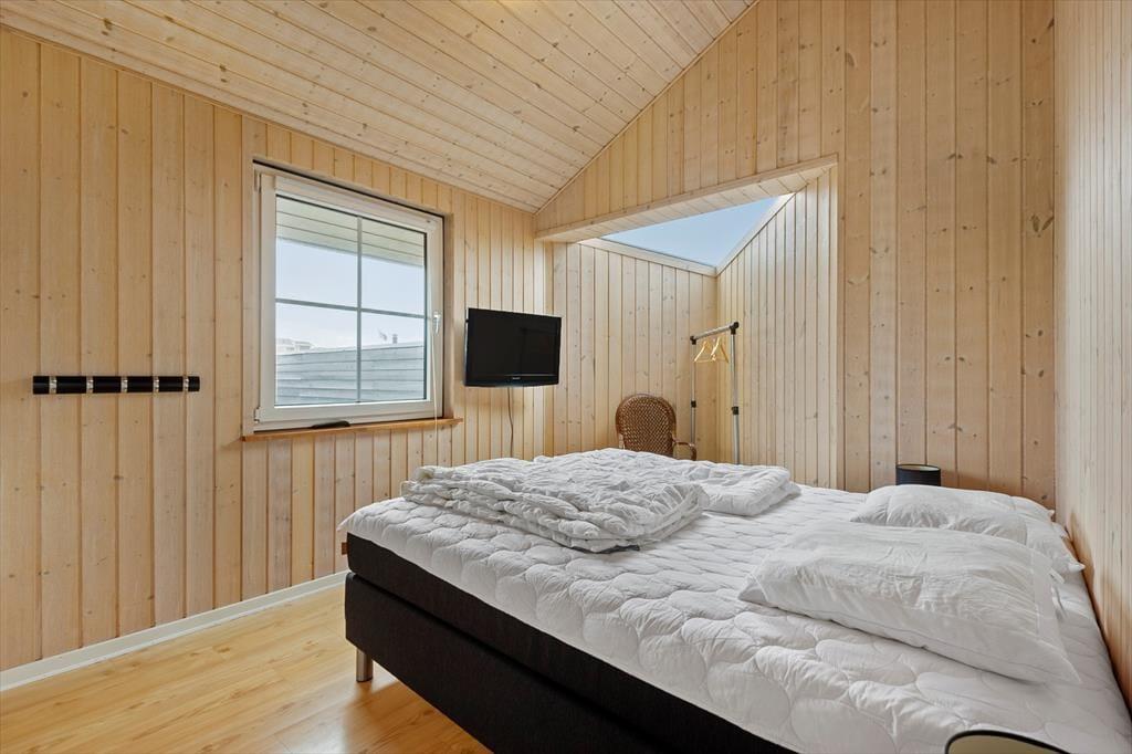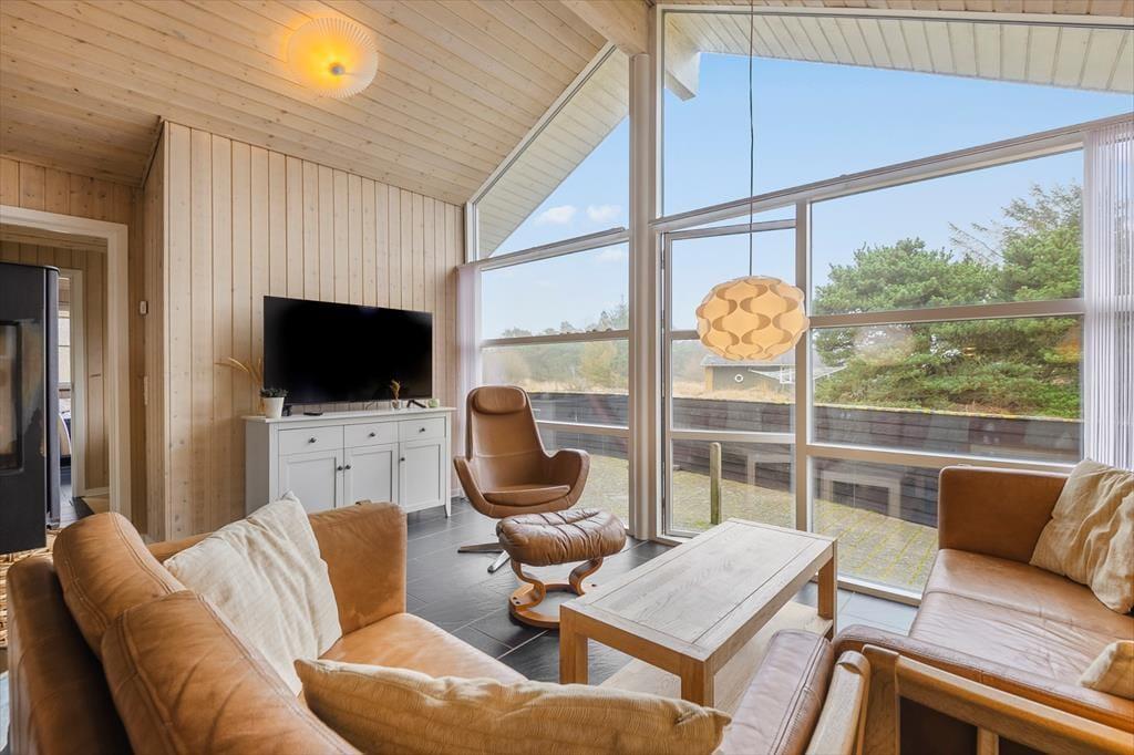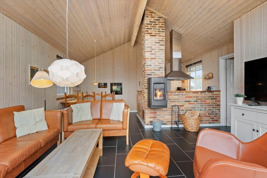 I ferieboligens stue går et kæmpe vinduesparti fra gulv til loft i gavlen, så selv på en kølig efterårsdag kan du blive badet i sol og nyde det naturskønne sommerhusområde fra sofaen eller lænestolen. Du kan endda tænde op i den væghængte brændeovn og lade varmen sprede sig – og hvis vejret er alt for sommerligt til det, kan du i stedet åbne havedøren op og smutte direkte ud på terrassen. Uanset årstiden har du gode arbejdsforhold, når du vil lave mad i det åbne og moderne indrettede køkken, og bordfodboldbordet skal nok vække glæde i familien blandt både store og små.