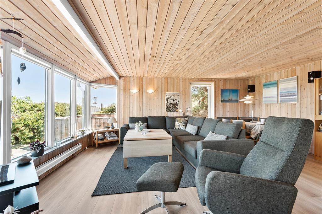 Når vejret er lunt og sommerligt, er det oplagt at flytte feriehyggen ud i det fri på den 2400 m2 store naturgrund. Rundt om sommerhuset er der flere gode terrasser at vælge imellem, så der er gode chancer for at finde både sol og læ i de ugenerede omgivelser. Hvis du sætter dig på det træklædte terrassedæk på den nordøstlige side af huset, kan du se langt ud over områdets hybenbuske og nyde synet af de drivende skyformationer højt på himlen. Det er en glimrende udsigt at have, når du sidder der med morgenkaffen og nyder freden på den lille, lukkede sidevej.