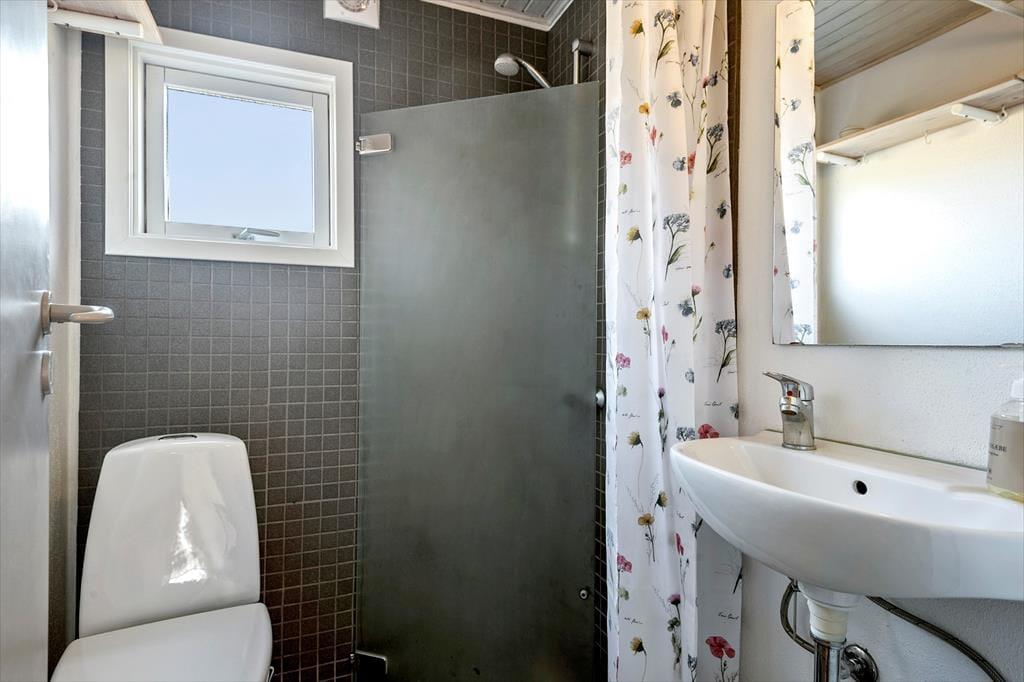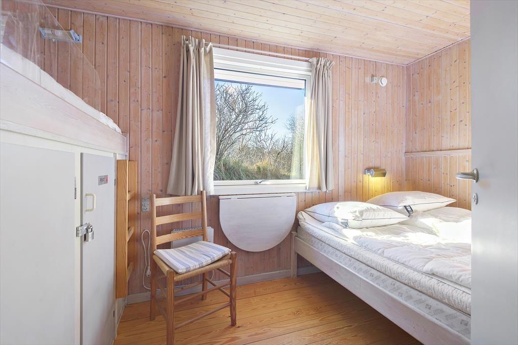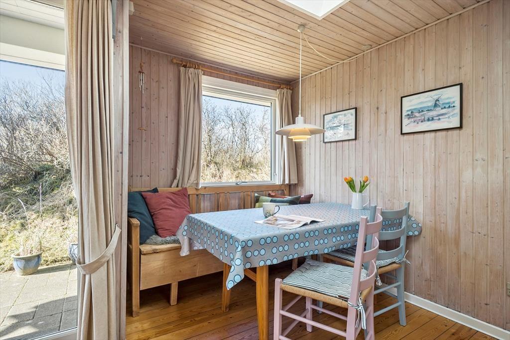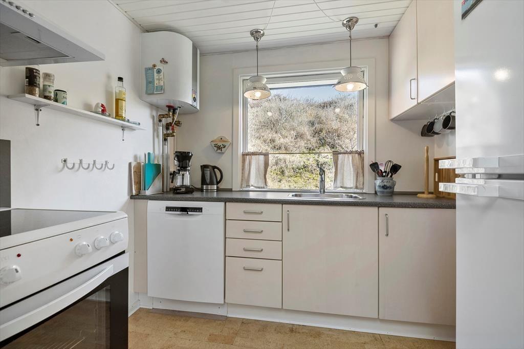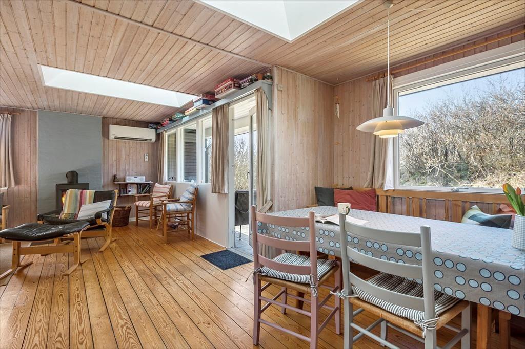 Når I træder indenfor, mødes I af en varm og indbydende atmosfære. Huset er gennemført i lyse træpaneler, der understreger den klassiske sommerhusstemning. I opholdsrummet strømmer dagslyset ind gennem de store vinduer og ovenlysvinduer, hvilket giver en skøn rummelig fornemmelse. Stuen er indrettet med bløde møbler, hyggelige lænestole og en brændeovn, der knitrer på kølige aftener og skaber den perfekte ramme for afslapning. Spiseområdet ligger i åben forbindelse med stuen, så I let kan samles om måltiderne ved det hyggelige spisebord. Køkkenet er funktionelt indrettet med opvaskemaskine og alt, hvad I behøver for at tilberede feriens måltider – her kan I nyde morgenkaffen med udsigt til klitterne gennem det store vindue. De to soveværelser er velindrettede med gode senge og opbevaringsplads, mens badeværelset er moderne og praktisk indrettet med en bruseniche.