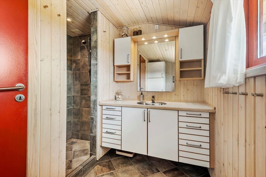 Det første, du lægger mærke til, når du træder ind i sommerhuset på Krebsestien 7, Rindby, er det særlige lys, der strømmer ind gennem de store vinduer og falder blødt ind over rummene. Den lyse indretning, kombineret med charmen fra husets originale islæt, skaber en varm og imødekommende atmosfære, hvor det er nemt at falde helt ned i gear. Opholdsrummet byder på forskudte niveauer, som giver oplevelsen af flere små zoner i ét samlet rum – en indbydende spiseplads ligger let hævet i forhold til stue og køkken, og det skaber en spændende dynamik i rummet. Her kan du lave mad i det åbne køkken og samtidig følge med i snakken ved spisebordet eller nyde udsigten til det omgivende klitlandskab fra sofaen. Når aftenen falder på, er det oplagt at tænde op i brændeovnen og finde ro i de bløde møbler, mens dagens indtryk langsomt falder på plads.