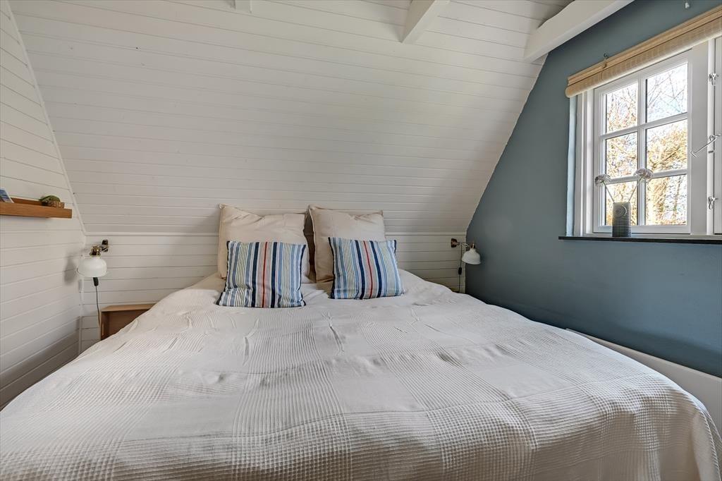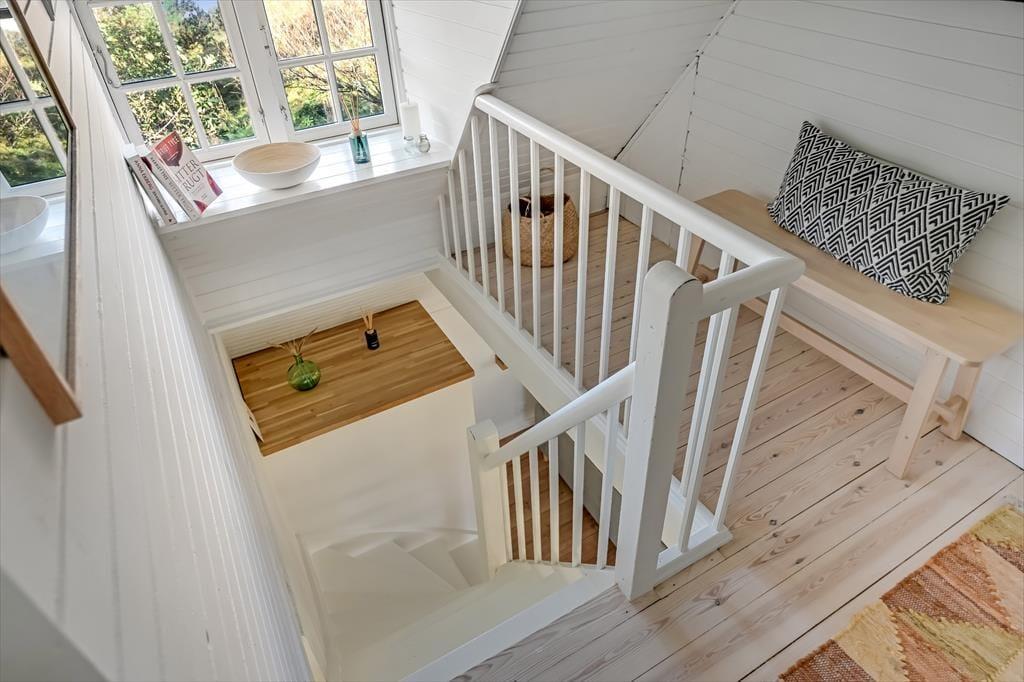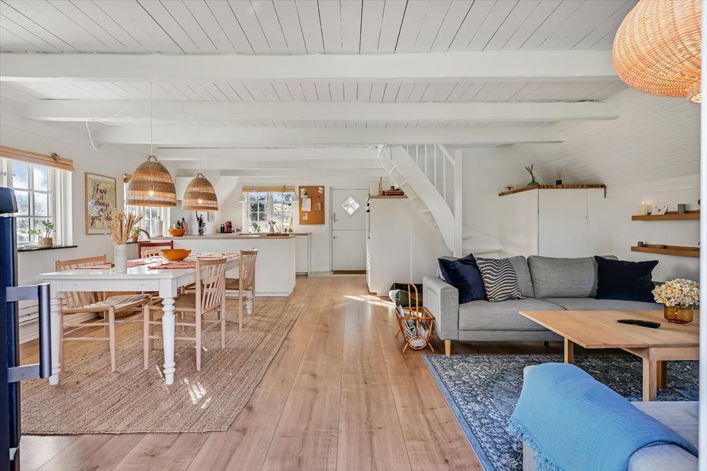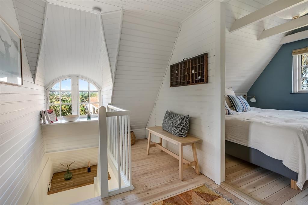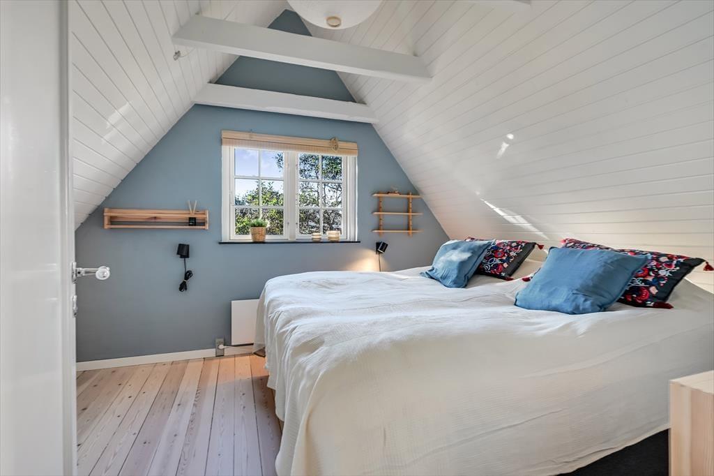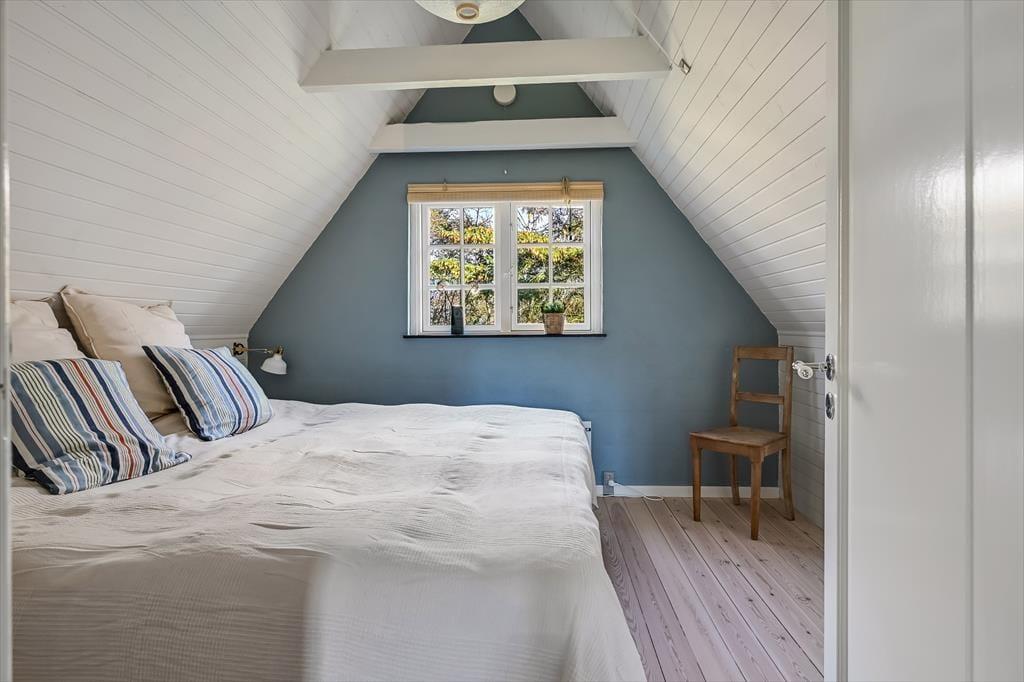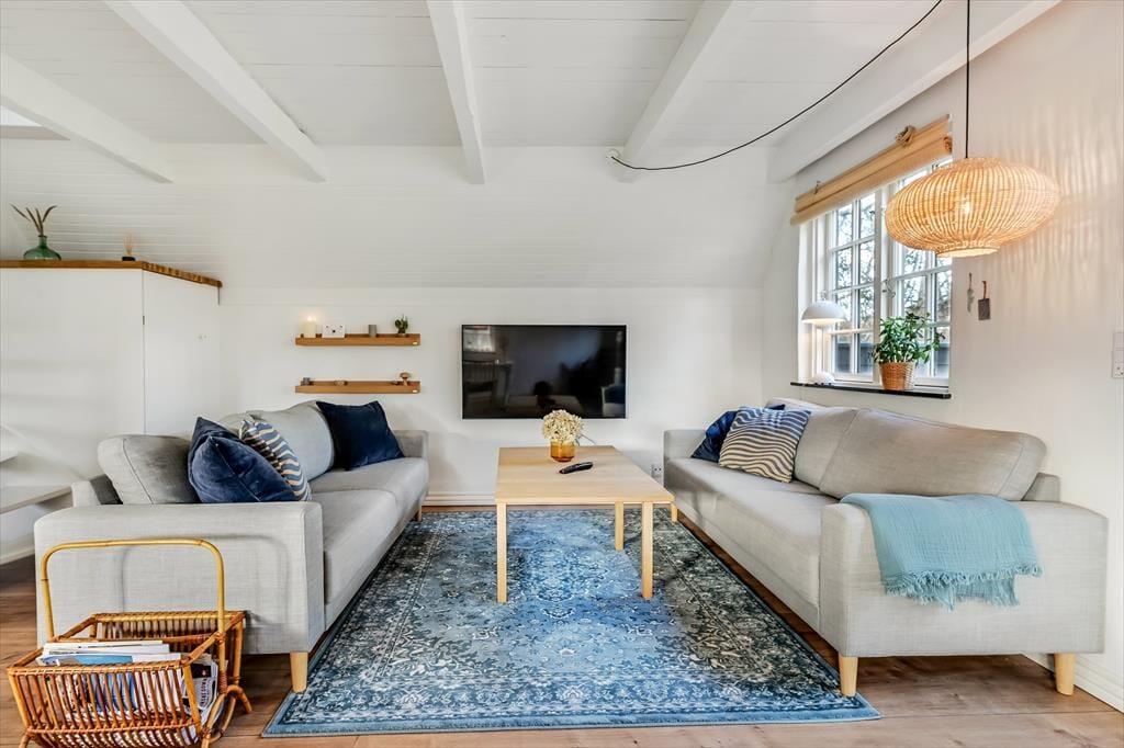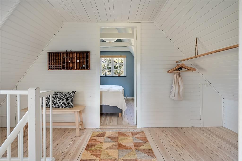 Inde i sommerhuset mødes du af en lys og venlig indretning, hvor hvide flader, bløde farvetoner og naturlige materialer går hånd i hånd og giver rummene et let og indbydende udtryk. Opholdsområdet danner et naturligt samlingspunkt, hvor samtalerne kan flyde frit, mens dagens måltider tilberedes, og sollyset strømmer ind gennem vinduerne. Atmosfæren er afslappet og hjemlig – præcis den slags rammer, der indbyder til at sænke skuldrene og nyde ferien i fulde drag. På førstesalen venter hyggelige værelser, hvor skrå vægge og bløde tekstiler skaber en næsten redeagtig stemning, der gør det ekstra rart at krybe under dynen efter en lang dag i den friske havluft. Også badeområdet følger husets rolige stil og understøtter følelsen af et gennemført og velplejet sommerhus, hvor der er tænkt på både komfort og æstetik.