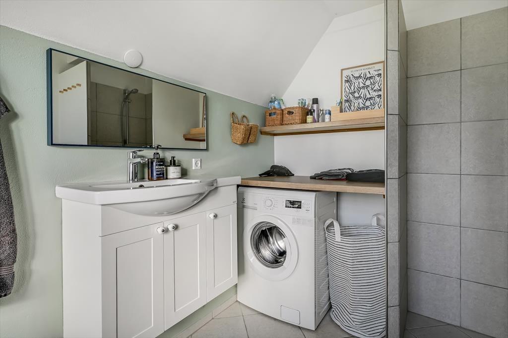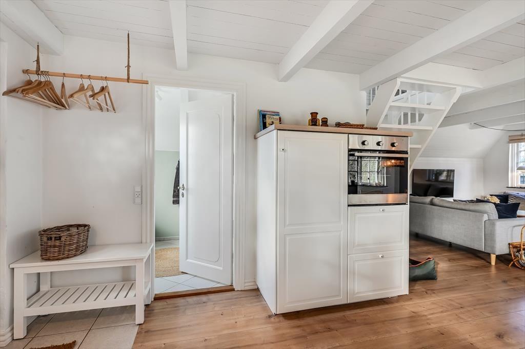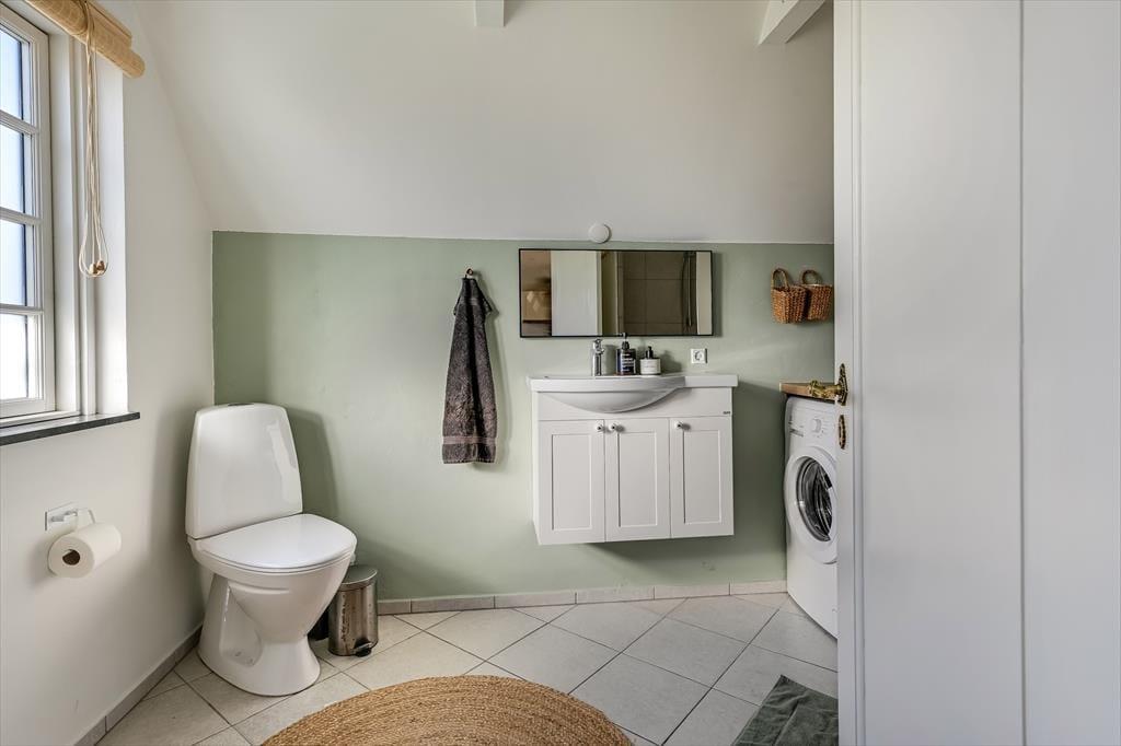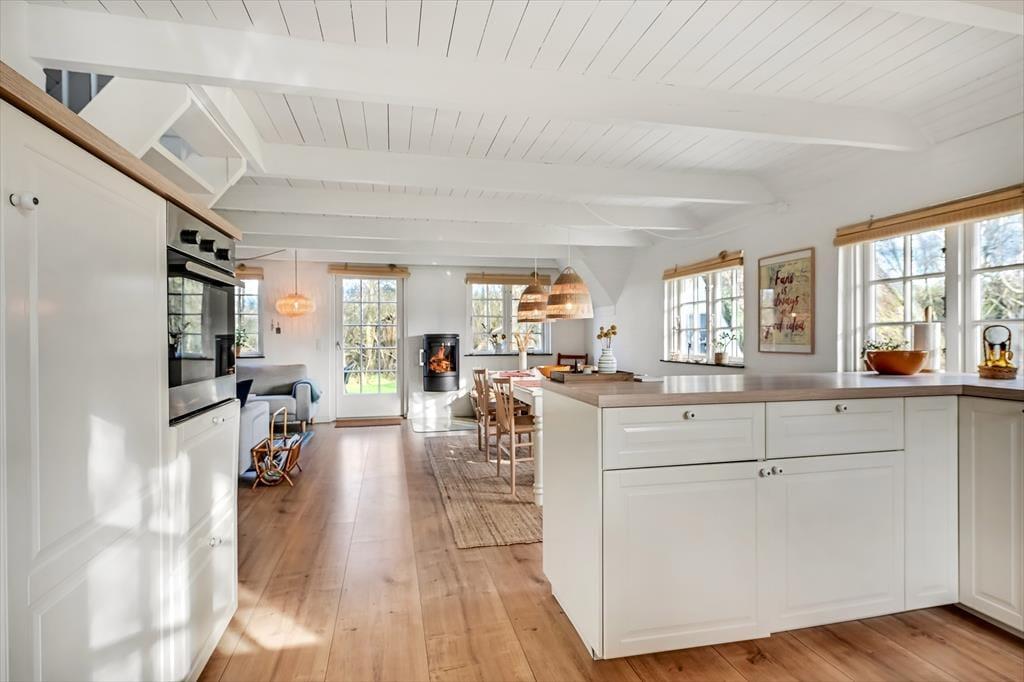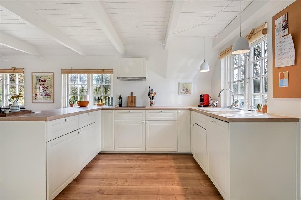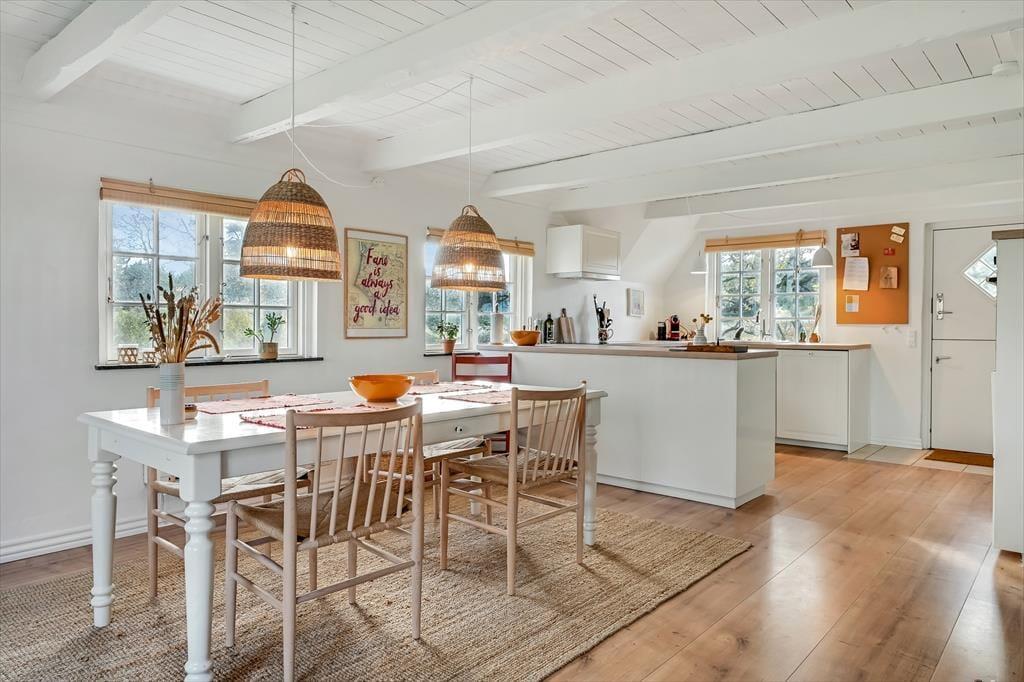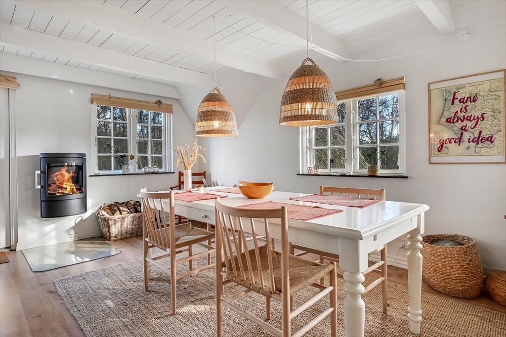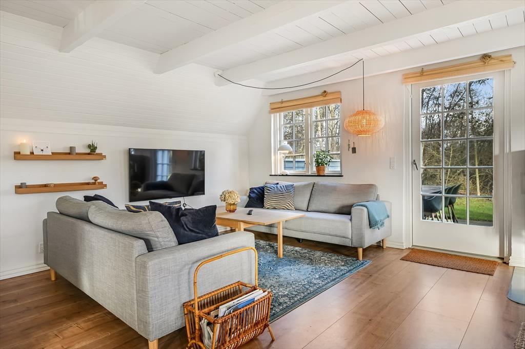 Inde i sommerhuset mødes du af en lys og venlig indretning, hvor hvide flader, bløde farvetoner og naturlige materialer går hånd i hånd og giver rummene et let og indbydende udtryk. Opholdsområdet danner et naturligt samlingspunkt, hvor samtalerne kan flyde frit, mens dagens måltider tilberedes, og sollyset strømmer ind gennem vinduerne. Atmosfæren er afslappet og hjemlig – præcis den slags rammer, der indbyder til at sænke skuldrene og nyde ferien i fulde drag. På førstesalen venter hyggelige værelser, hvor skrå vægge og bløde tekstiler skaber en næsten redeagtig stemning, der gør det ekstra rart at krybe under dynen efter en lang dag i den friske havluft. Også badeområdet følger husets rolige stil og understøtter følelsen af et gennemført og velplejet sommerhus, hvor der er tænkt på både komfort og æstetik.