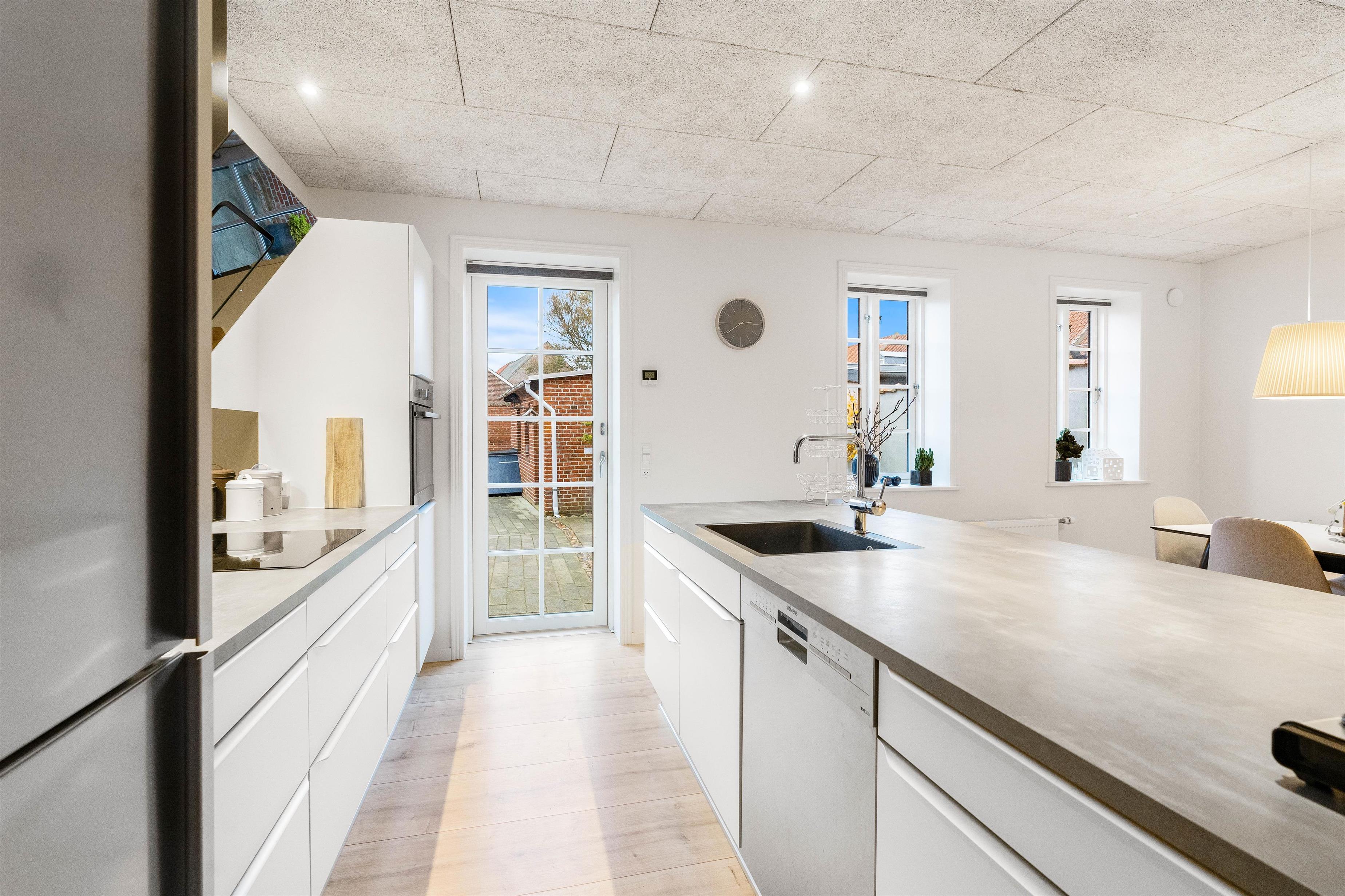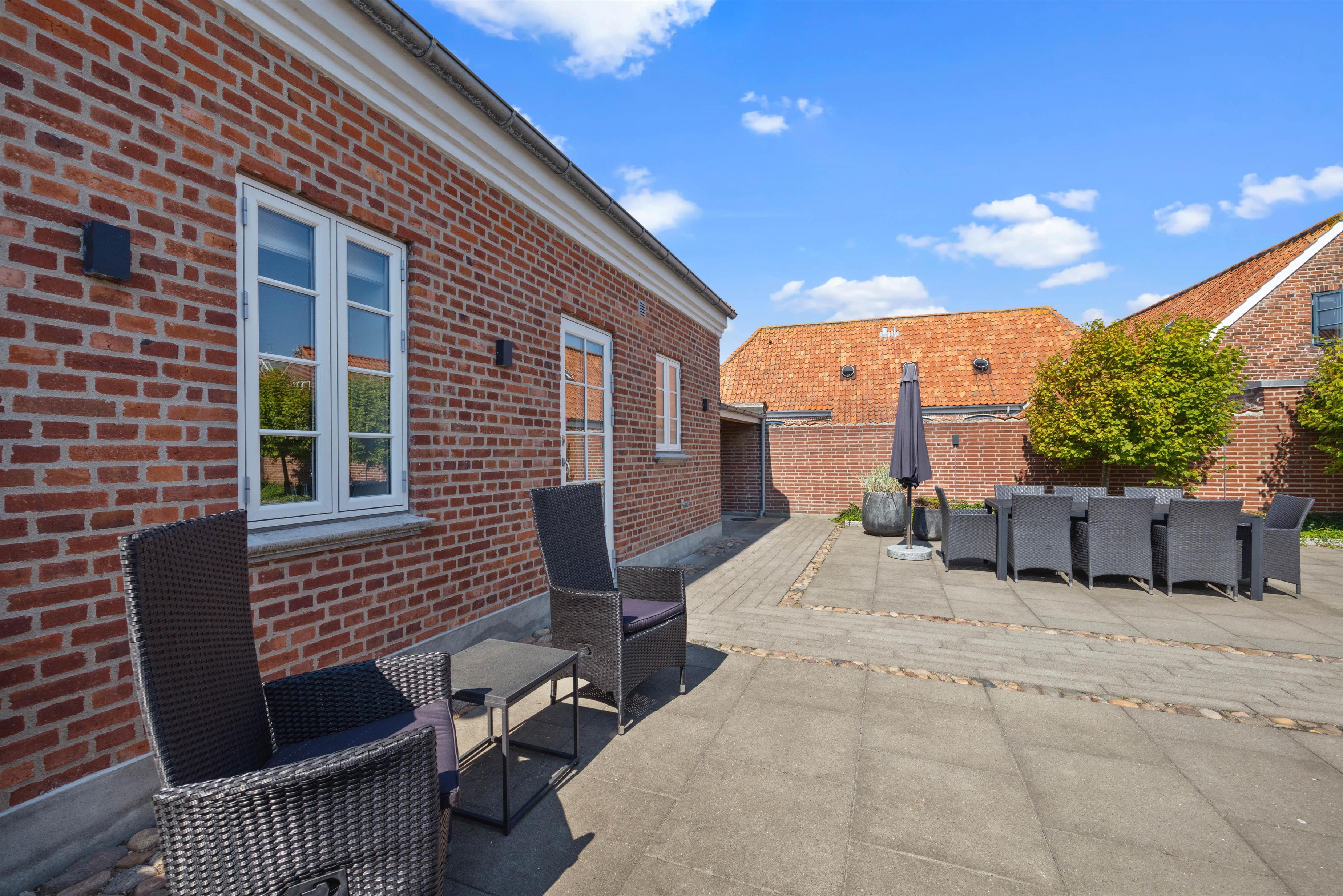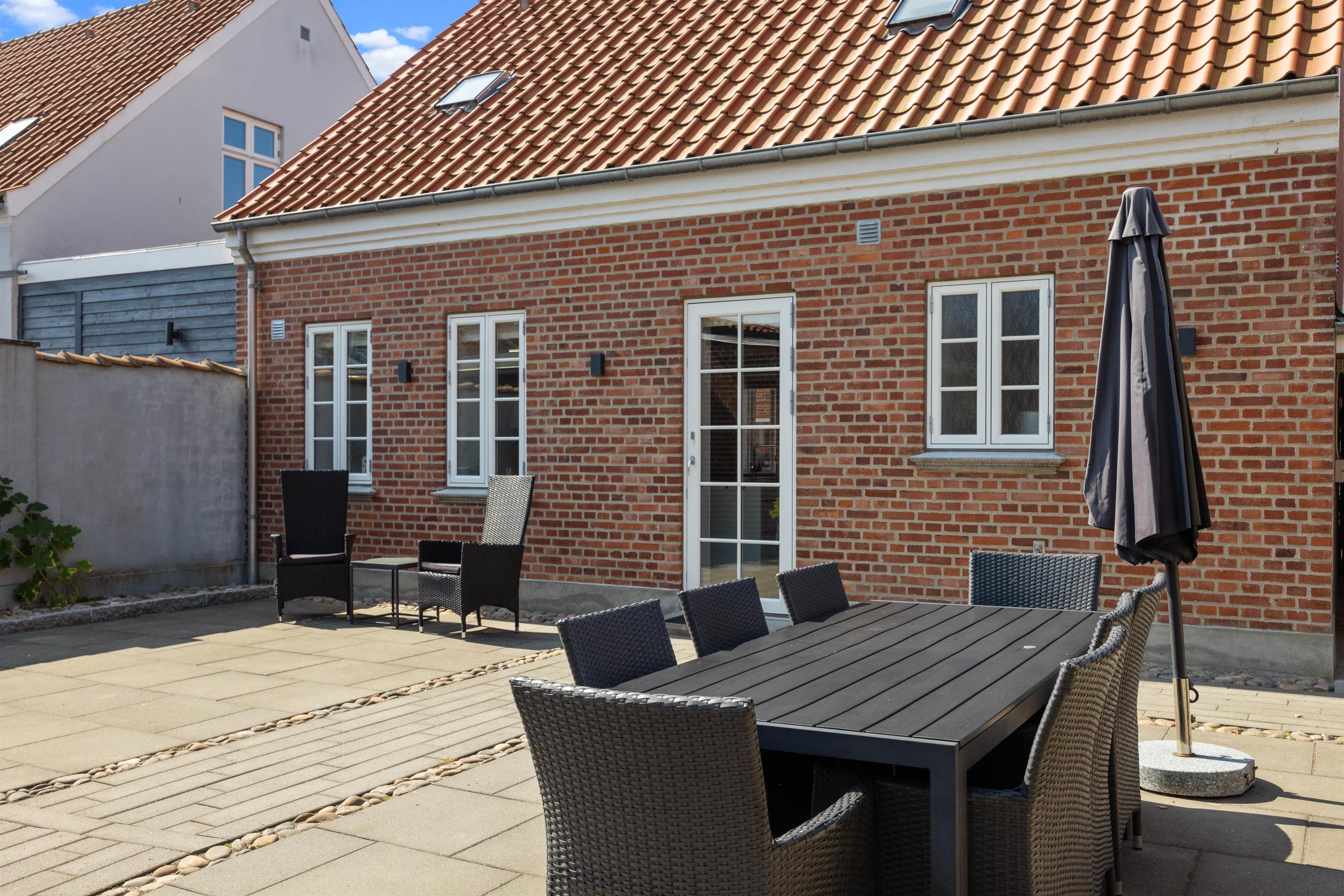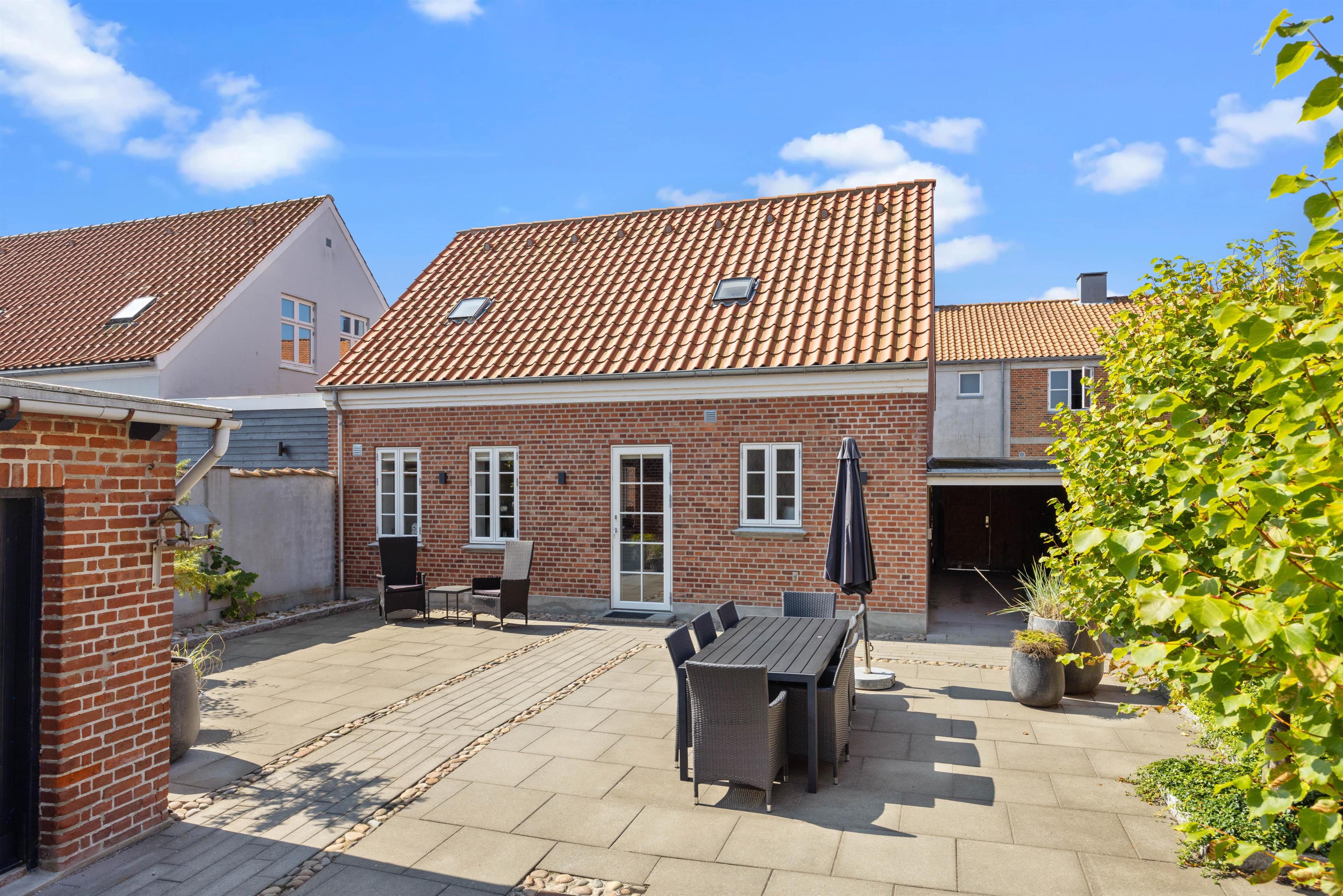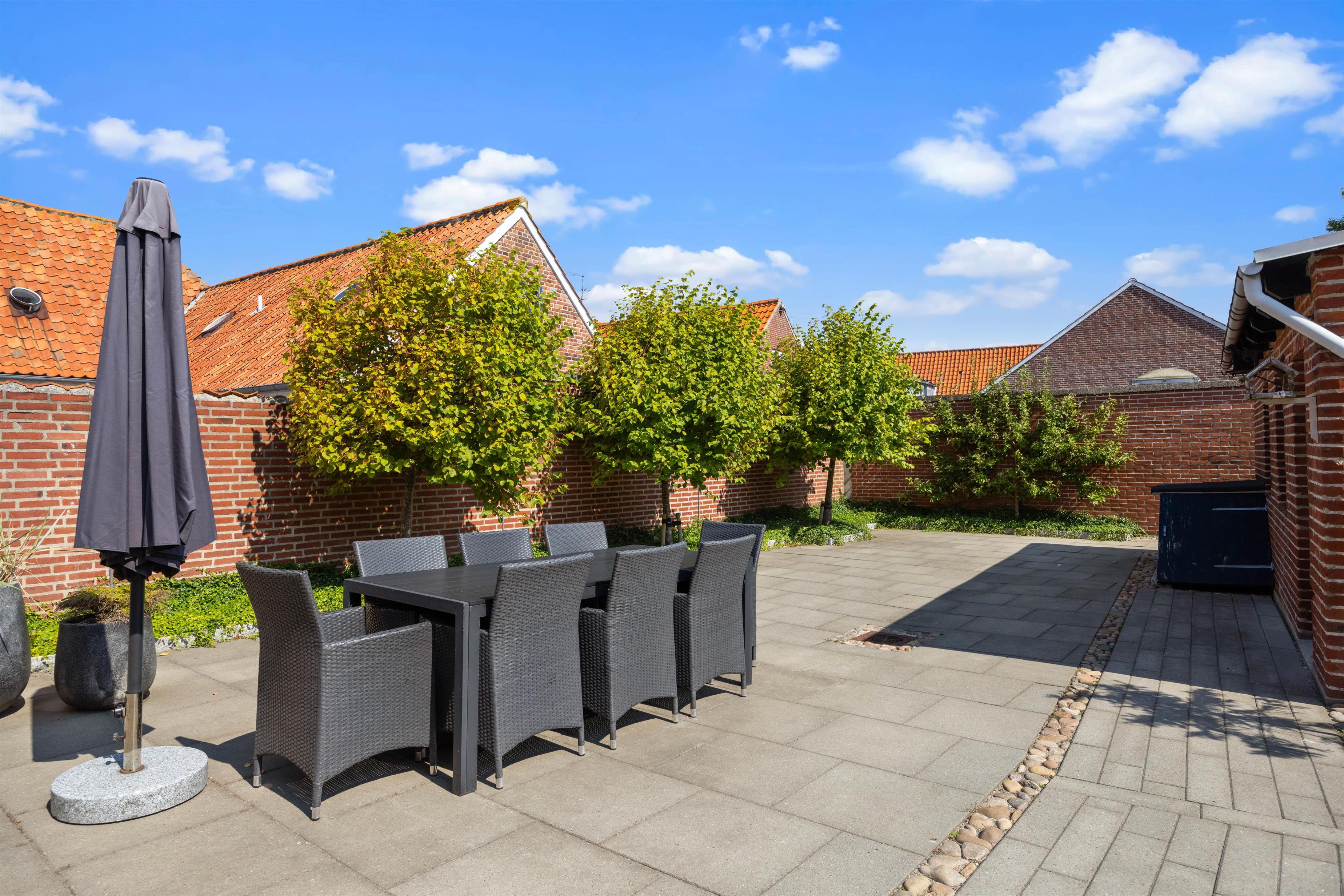 Fra køkkenet er der udgang til den hyggelige og læfyldte baggård, der er det perfekte sted at nyde solen på liggestolene, åbne en god flaske vin og smide bøfferne på grillen, eller måske finde sig et hyggeligt hjørne med en kop varm kaffe og en god bog.