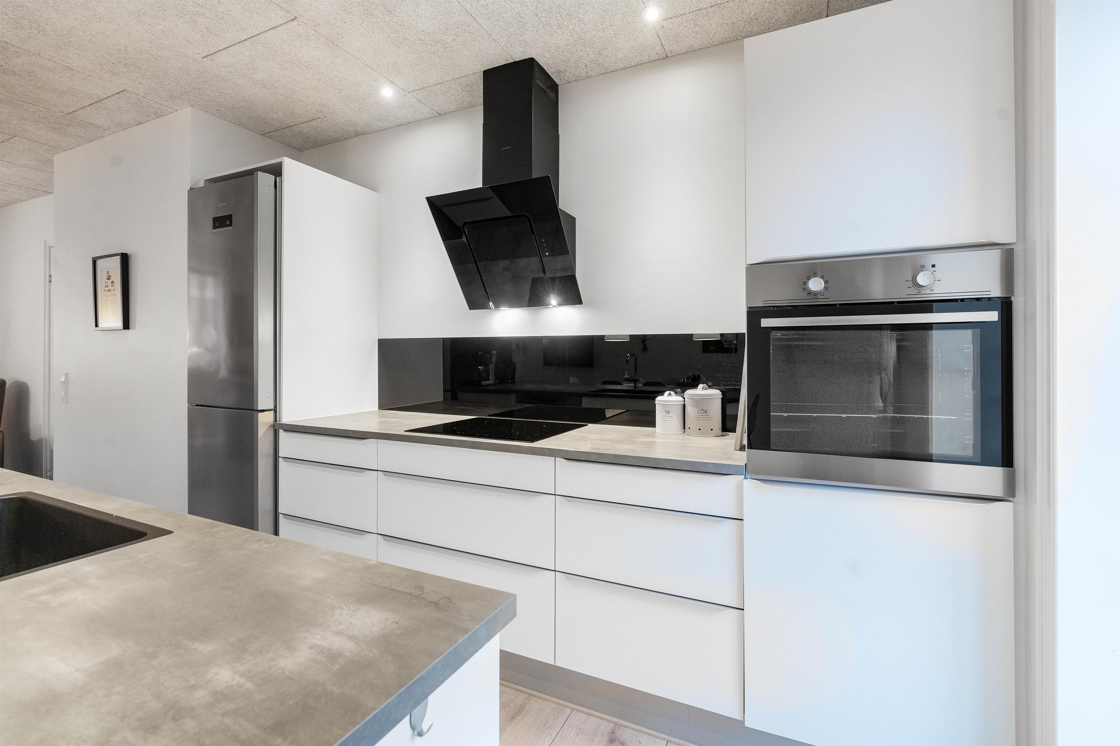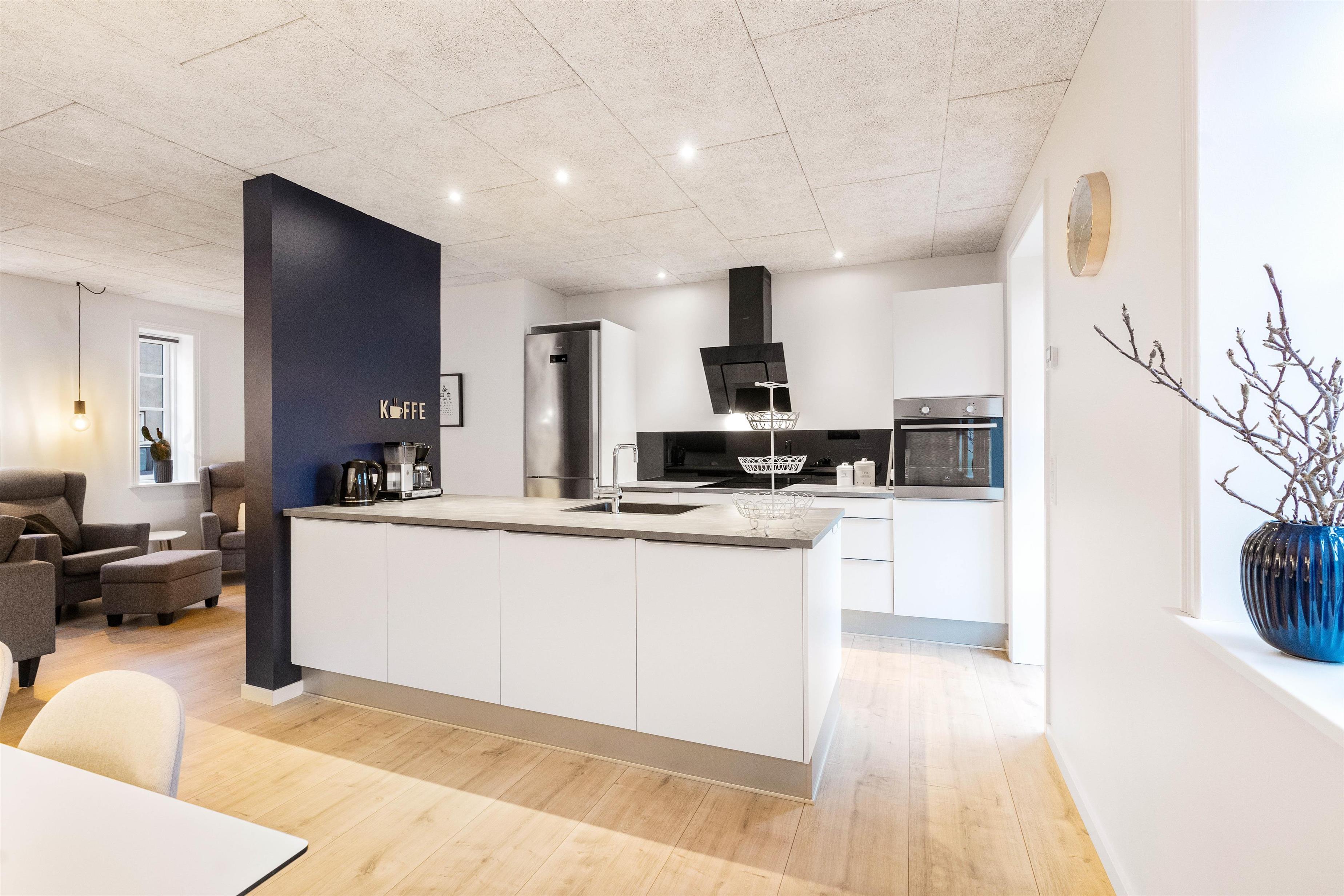 Den 115 m2 store og fine ferielejlighed udstråler fra første øjekast ægte hyggelig feriestemning, og ved første indtræden vil I falde godt til i de smagfulde omgivelser. Gennem den store stue med det åbne køkken, der er indrettet med kvalitetsbevidste, moderne møbler, falder et dejligt lys fra de mange vinduer. Det store fokus på komfort skinner igennem i alle husets rum. Køkkenet er veludstyret med bl.a. opvaskemaskine, mikroovn og køleskab med 60 liters frysekapacitet. Stor spiseafdeling og hyggelig sofakrog med fladskærms-TV.