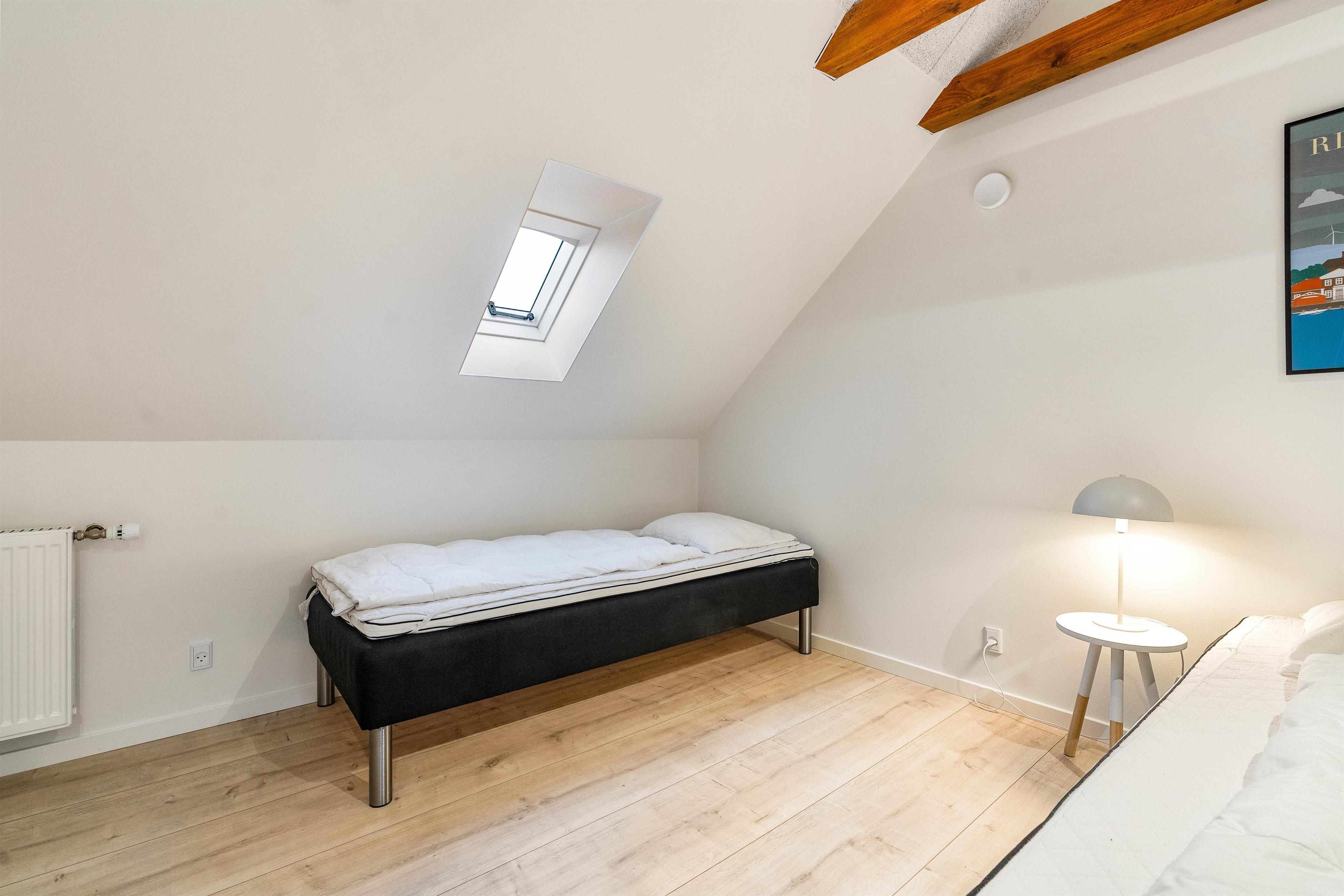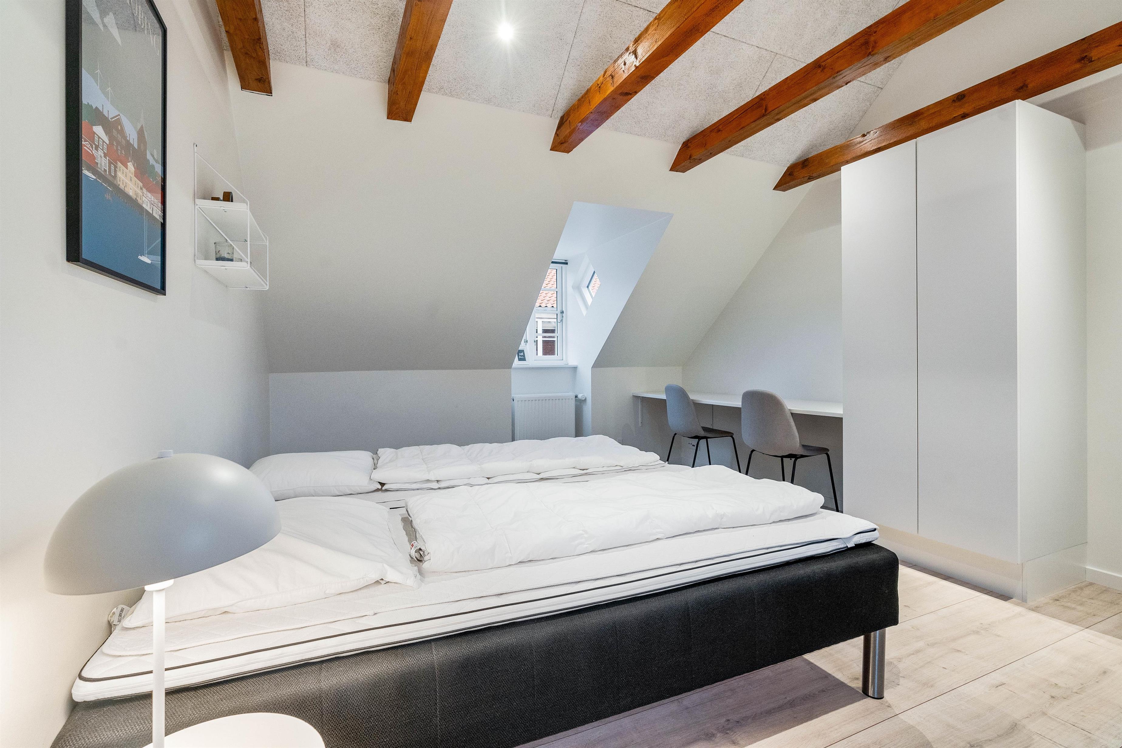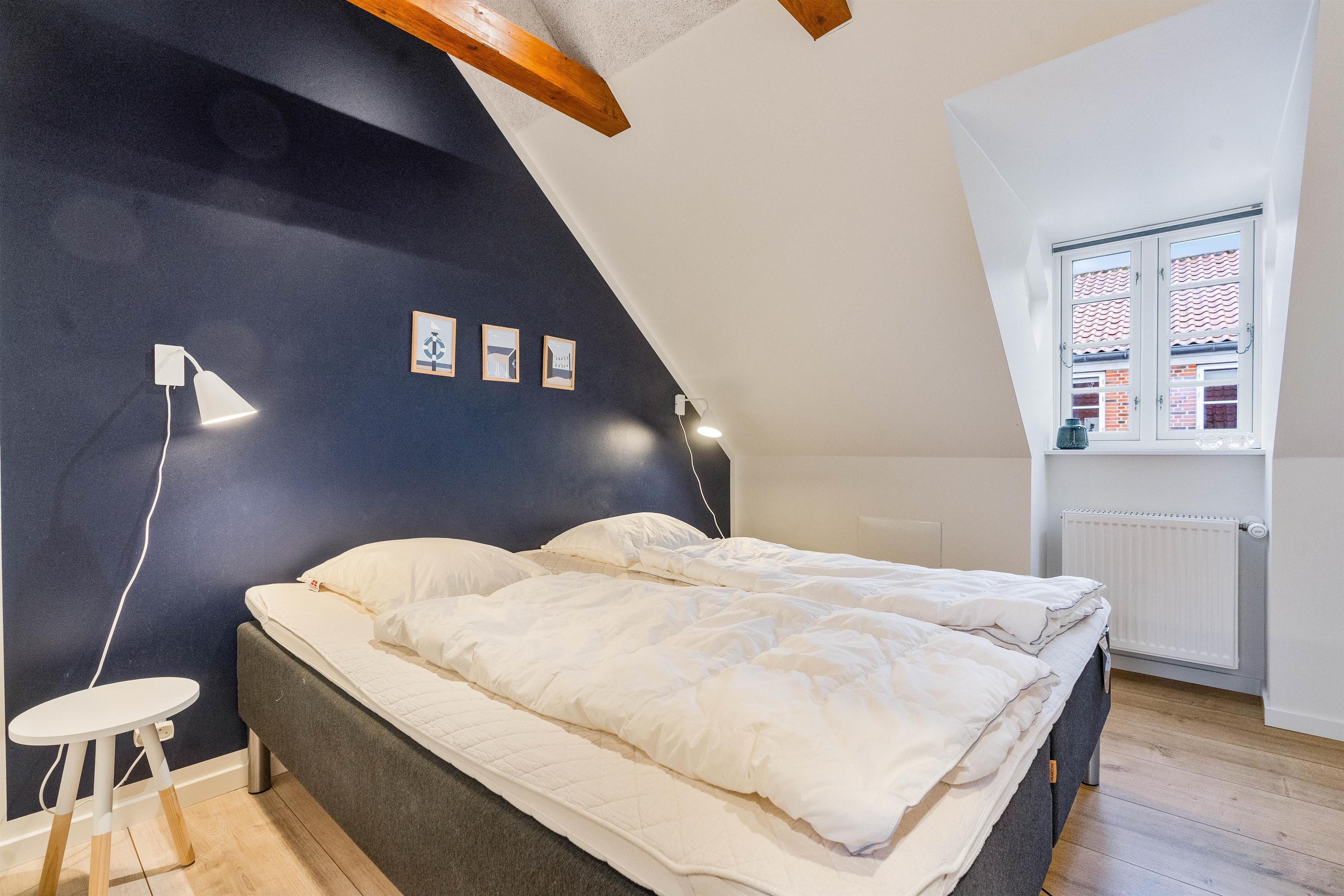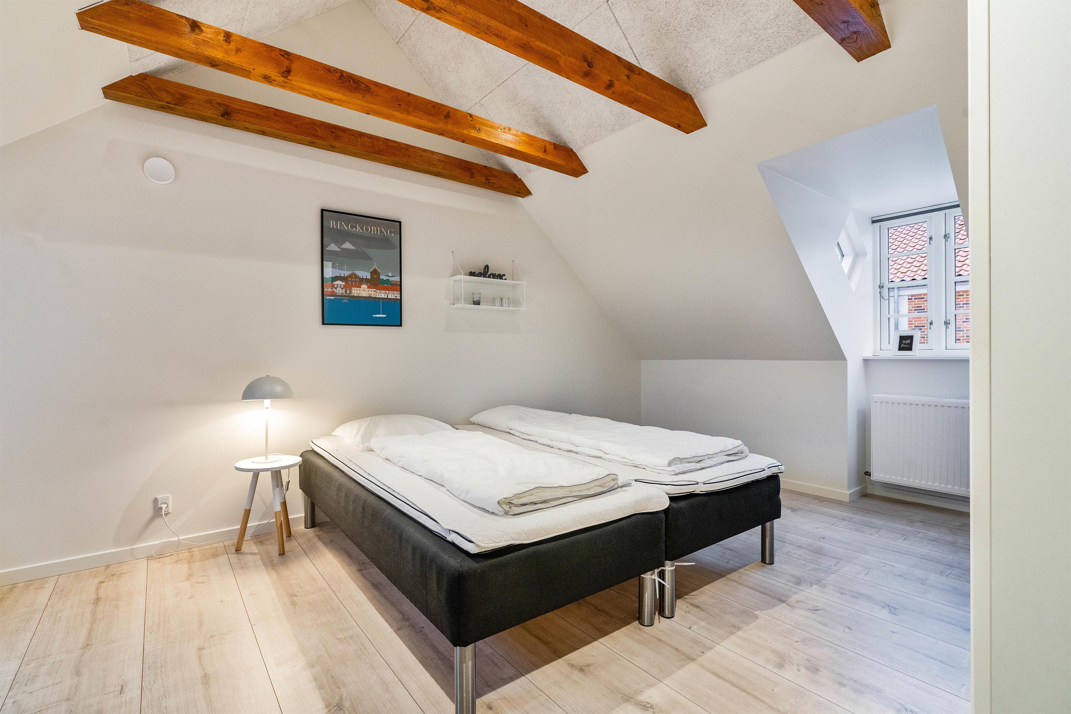 Lejligheden er indrettet til op til fem personer med to lyse og dejlige soveværelser, et værelse med dobbeltseng og et værelse med tre enkeltsenge. Soveværelserne ligge på 1. etage. På stueplan ligger badeværelset der er lyst indrettet og med bruseniche og opvarmet flisegulv.