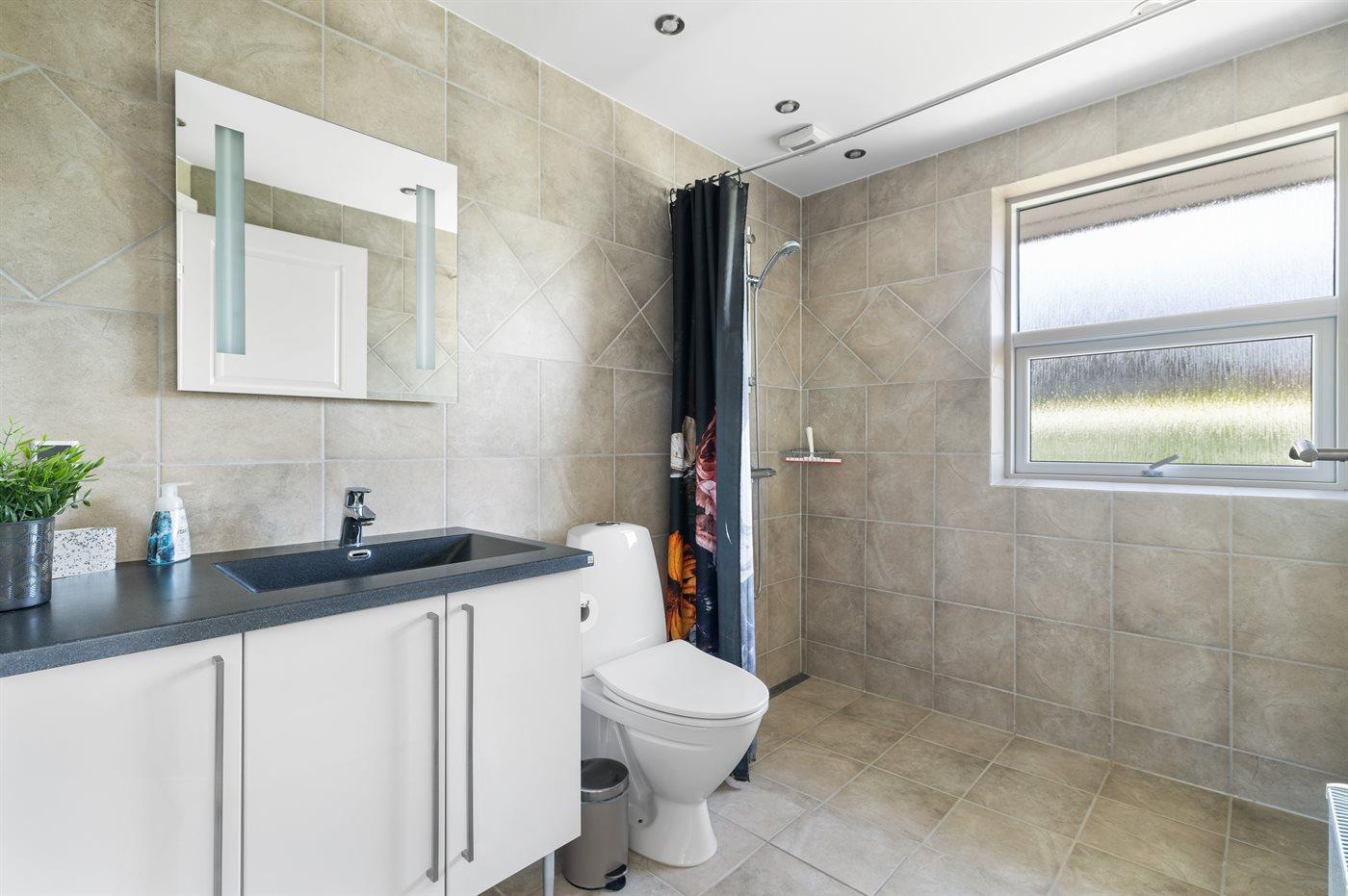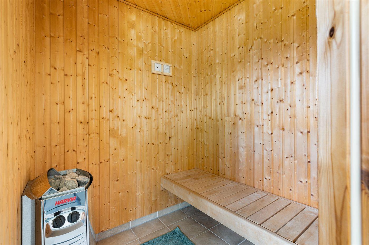 Der er 2 badeværelser med bruseniche og 2 toiletter. Der er gulvvarme på 2 badeværelser. I saunaen er der mulighed for afslapning.