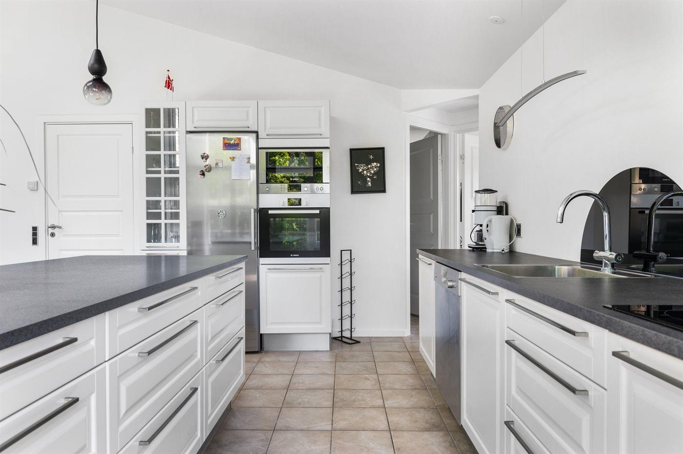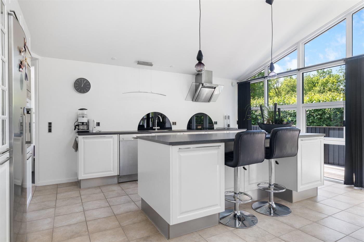 Køkkenet er udstyret med 1 køleskab. Der er 4 induktionskogeplader, varmluftovn, mikrobølgeovn samt opvaskemaskine.