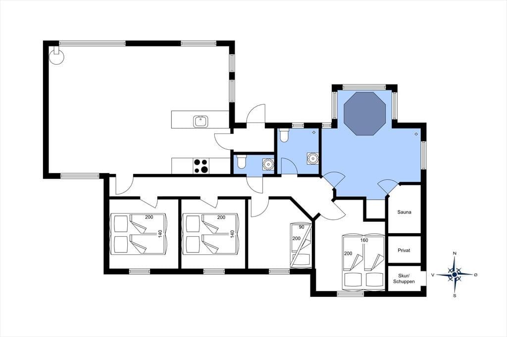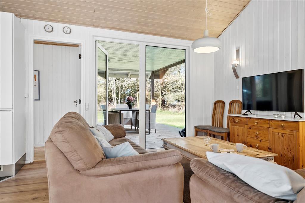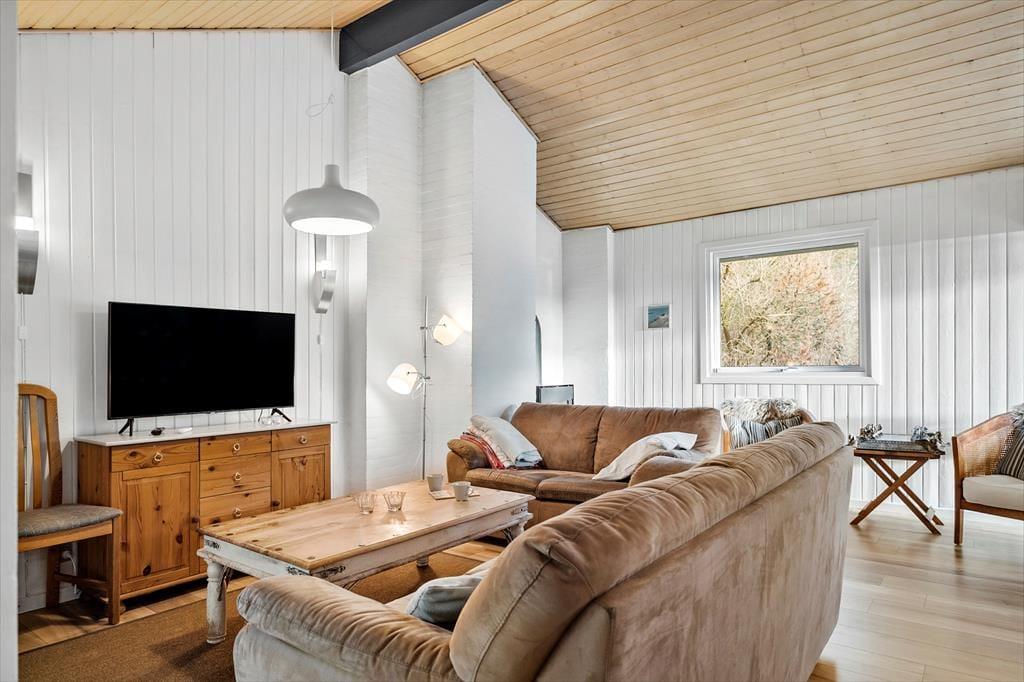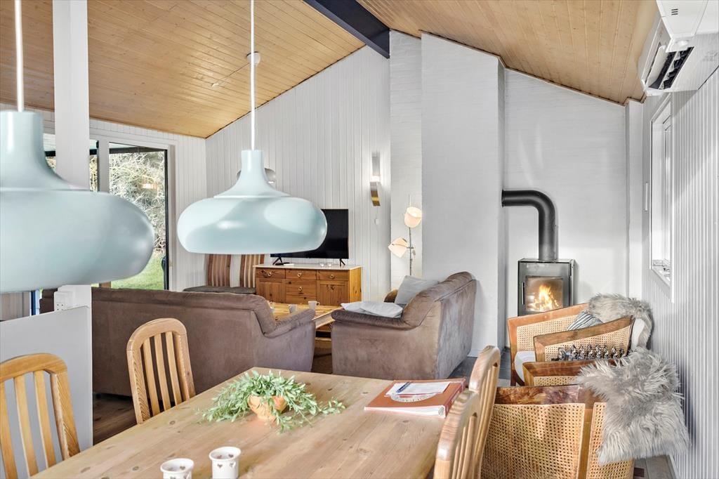 Sommerhuset er indrettet med fokus på lys og komfort, så her føler du dig straks hjemme. Planløsningen byder på fire gode værelser, et badeværelse med både spa og sauna samt et gæstetoilet – alt sammen med plads til, at familien kan trække sig tilbage og slappe af. Det pæne køkken er godt udstyret og åbner op mod spisepladsen og stuen, så I kan samles omkring madlavning og måltider uden at gå glip af hyggesnakken. I opholdsstuen skaber store vinduer et smukt lysindfald og udsigt til den frodige naturgrund, mens brændeovnen sørger for varme og hygge på de kølige aftener.