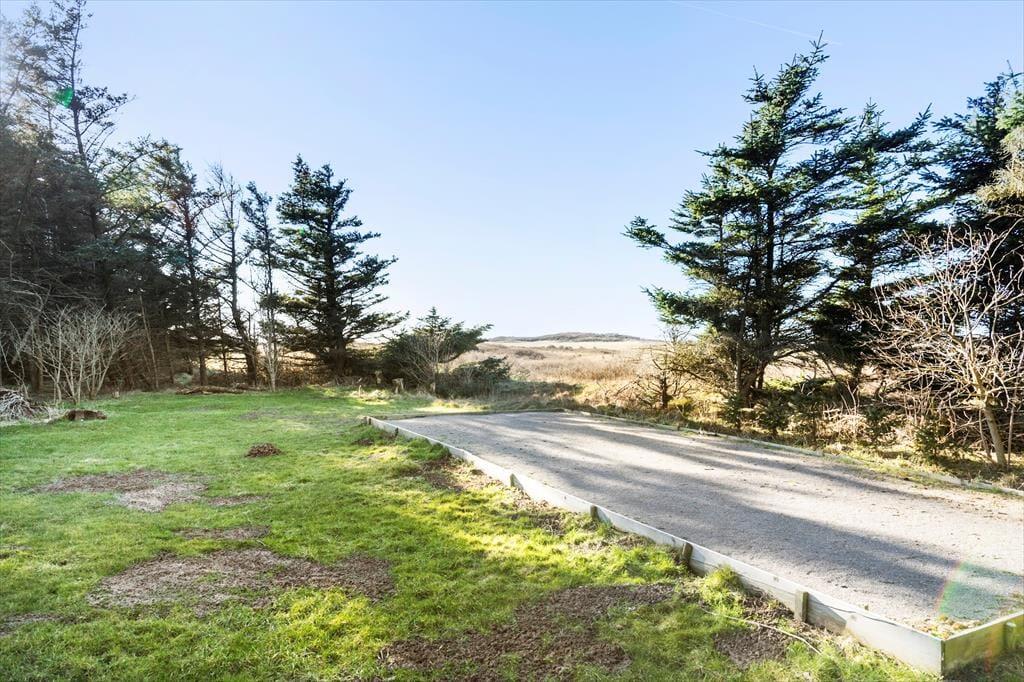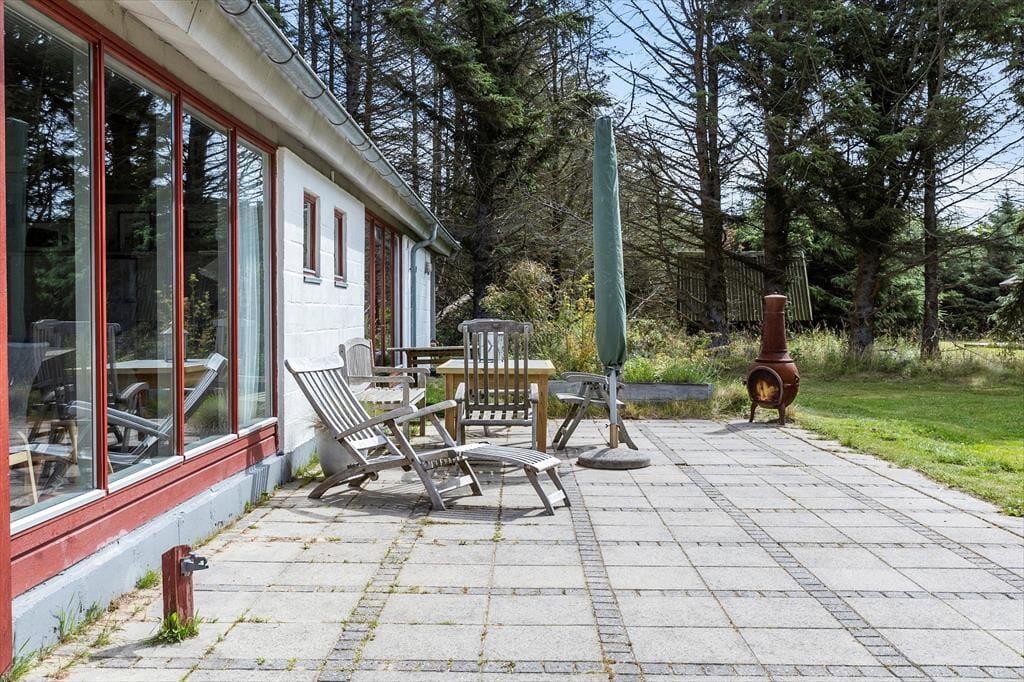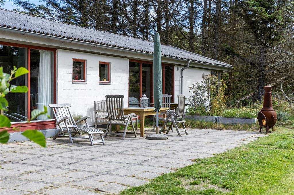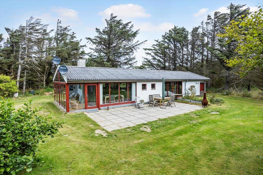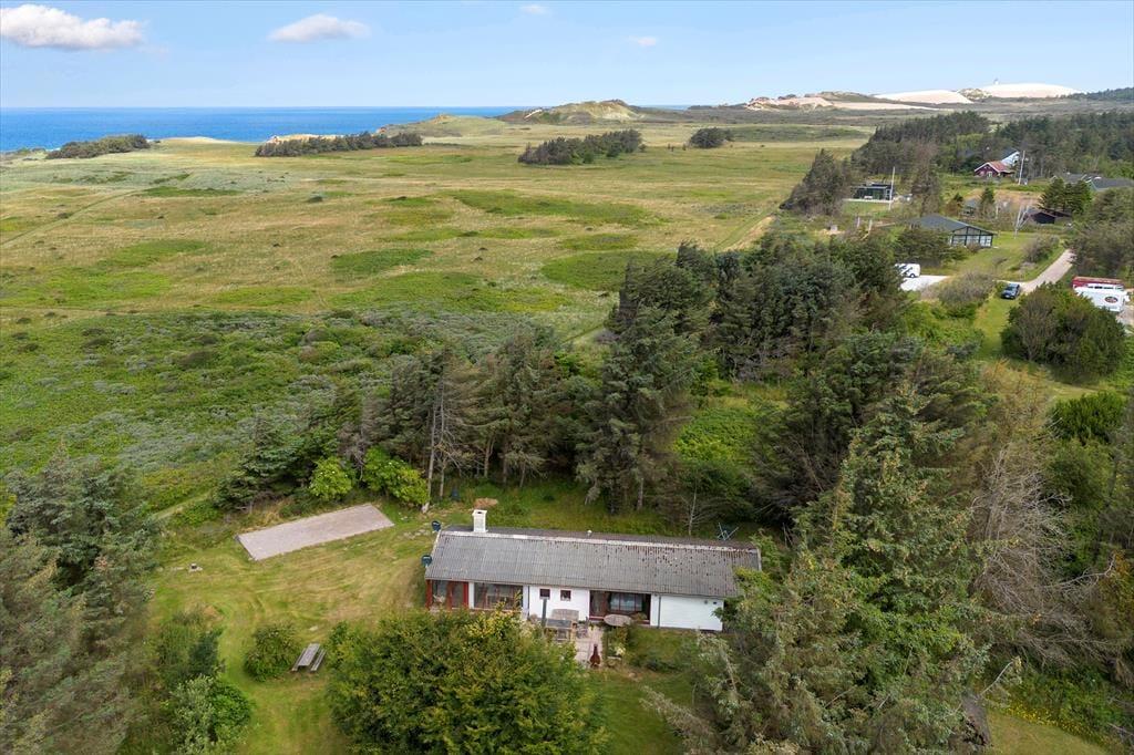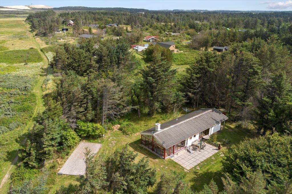 Den 2102 m2 store grund ligger godt placeret i den vestlige ende af sommerhusområdet. Høje fyrretræer og anden beplantning skærmer af ind mod naboerne, mens der er mere åbent ud mod det kuperede land, der strækker sig mod Lønstrup Klint. Syd for sommerhuset ligger der en sydvendt terrasse, og med petanquebane og en stor græsplæne har I rig mulighed for at hygge jer med havespil.