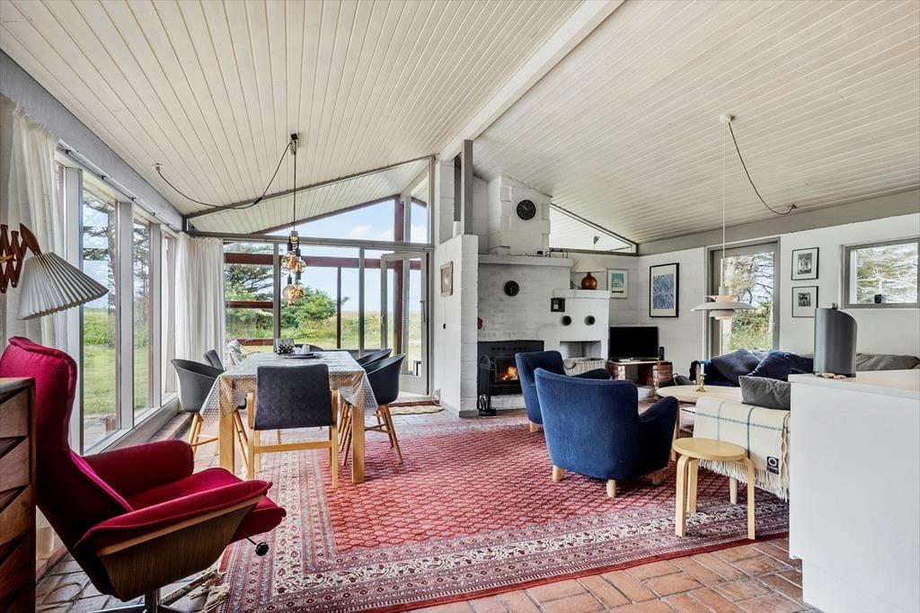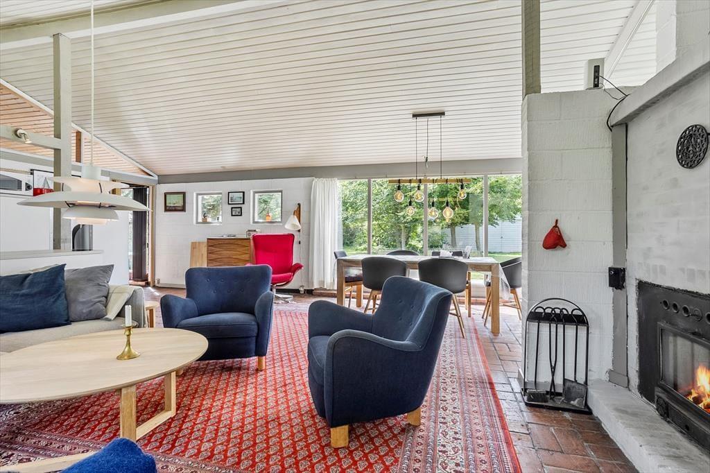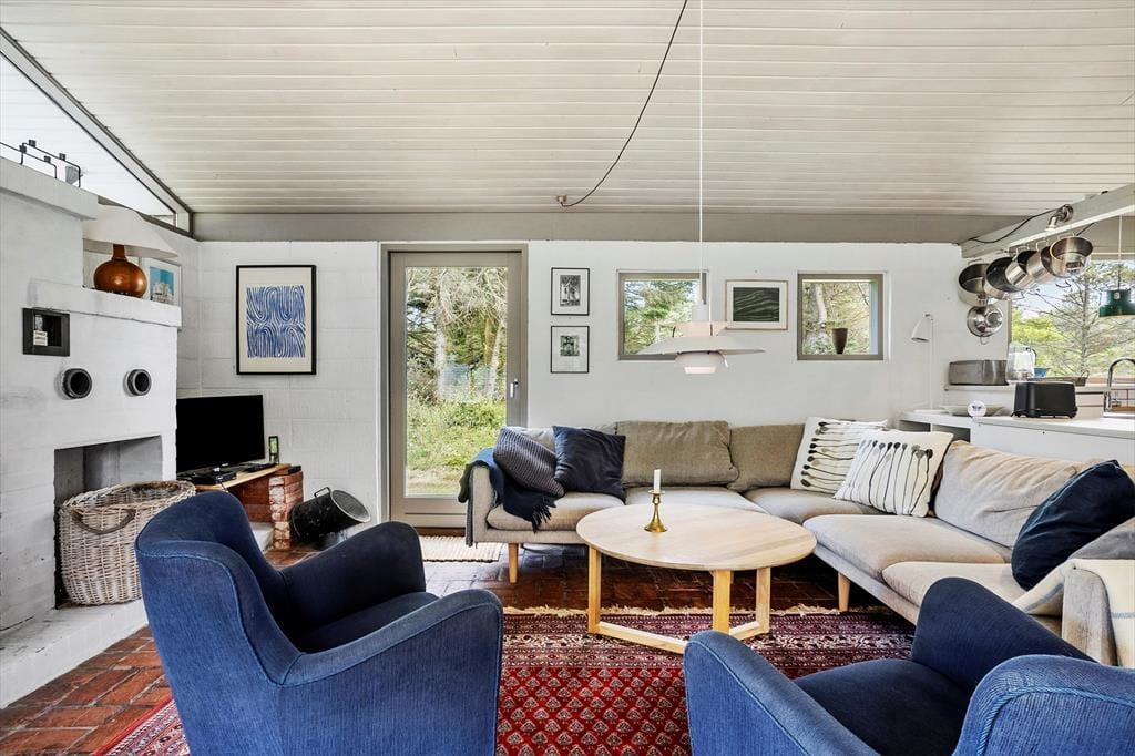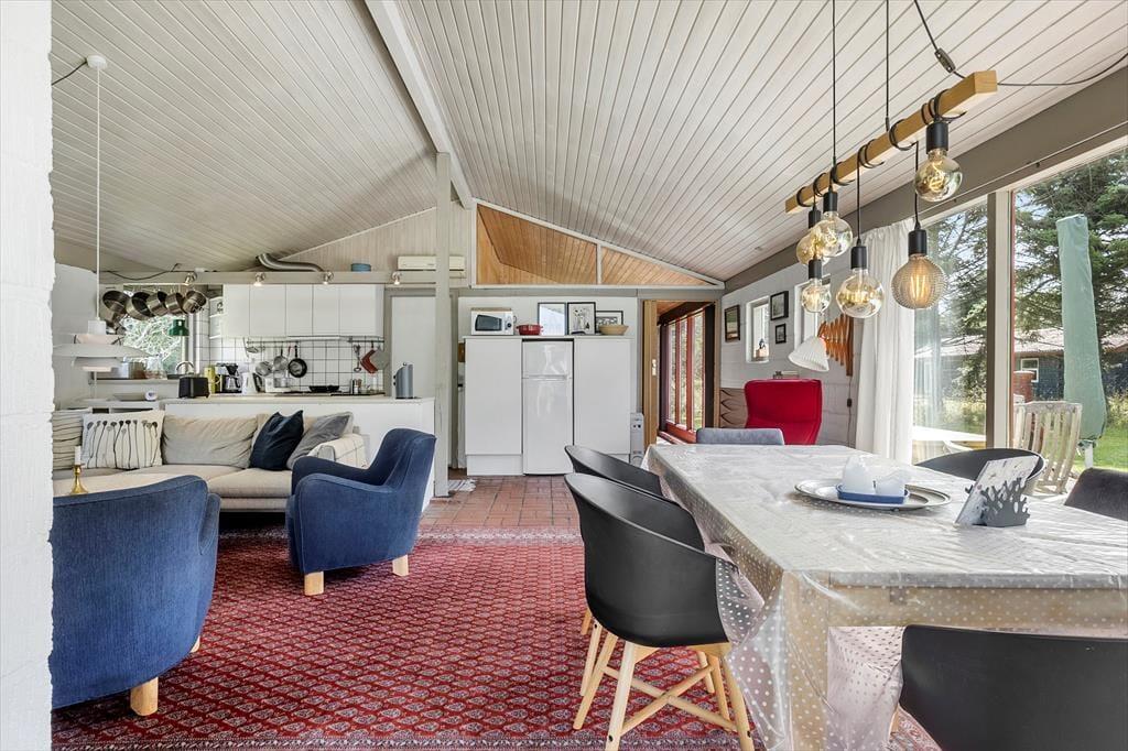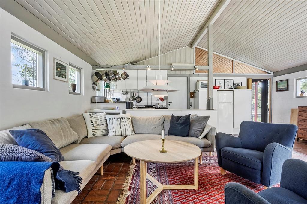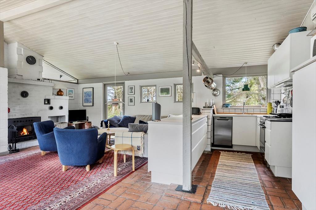 Det 110 m2 store sommerhus har med tre soveværelser og et badeværelse en fornuftig planløsning til seks personer. Huset fungerer fint som base for en børnefamilie såvel som en flok venner, der trænger til at holde ferie og have god tid til hygge og socialt samvær. Når der skal laves mad, behøver I ikke at gå glip af det gode selskab, for køkkenet ligger i åben forbindelse med stuen. Nær sofaarrangementet er der en indbygningspejs, og spisebordet er placeret, så I har et fint kig ud mod landskabet mod vest. Det grønne omgivelser kan også nydes fra udestuen, der har loft til kip og en lys atmosfære præcis ligesom resten af opholdsafdelingen.